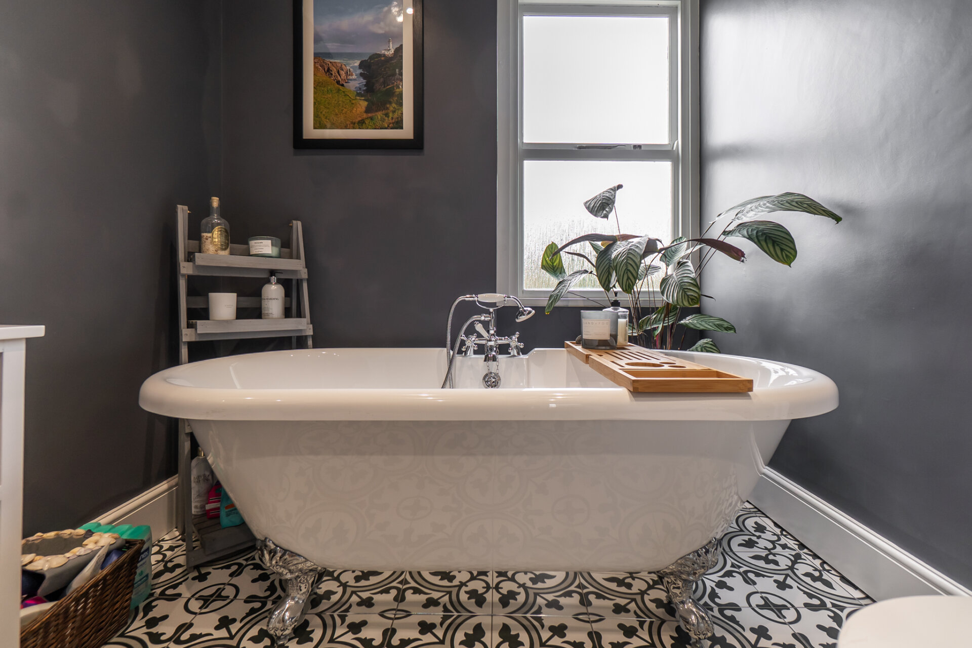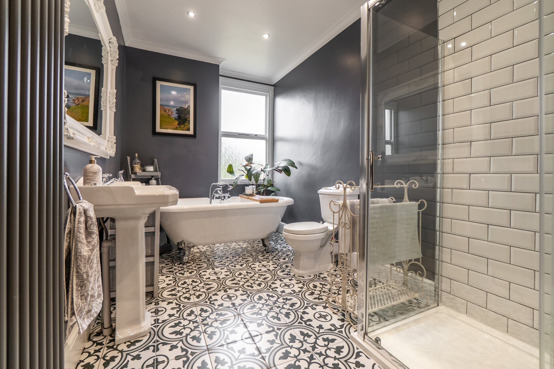 To the first floor there are two charming bedooms with ornamental Victorian firplaces and larger than average chic bathroom with stand alone roll top bath, walk-in shower, low level wc and ornate wash hand basin.