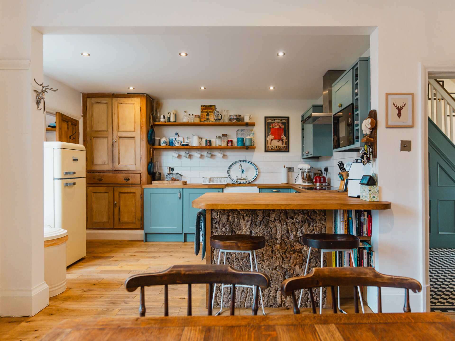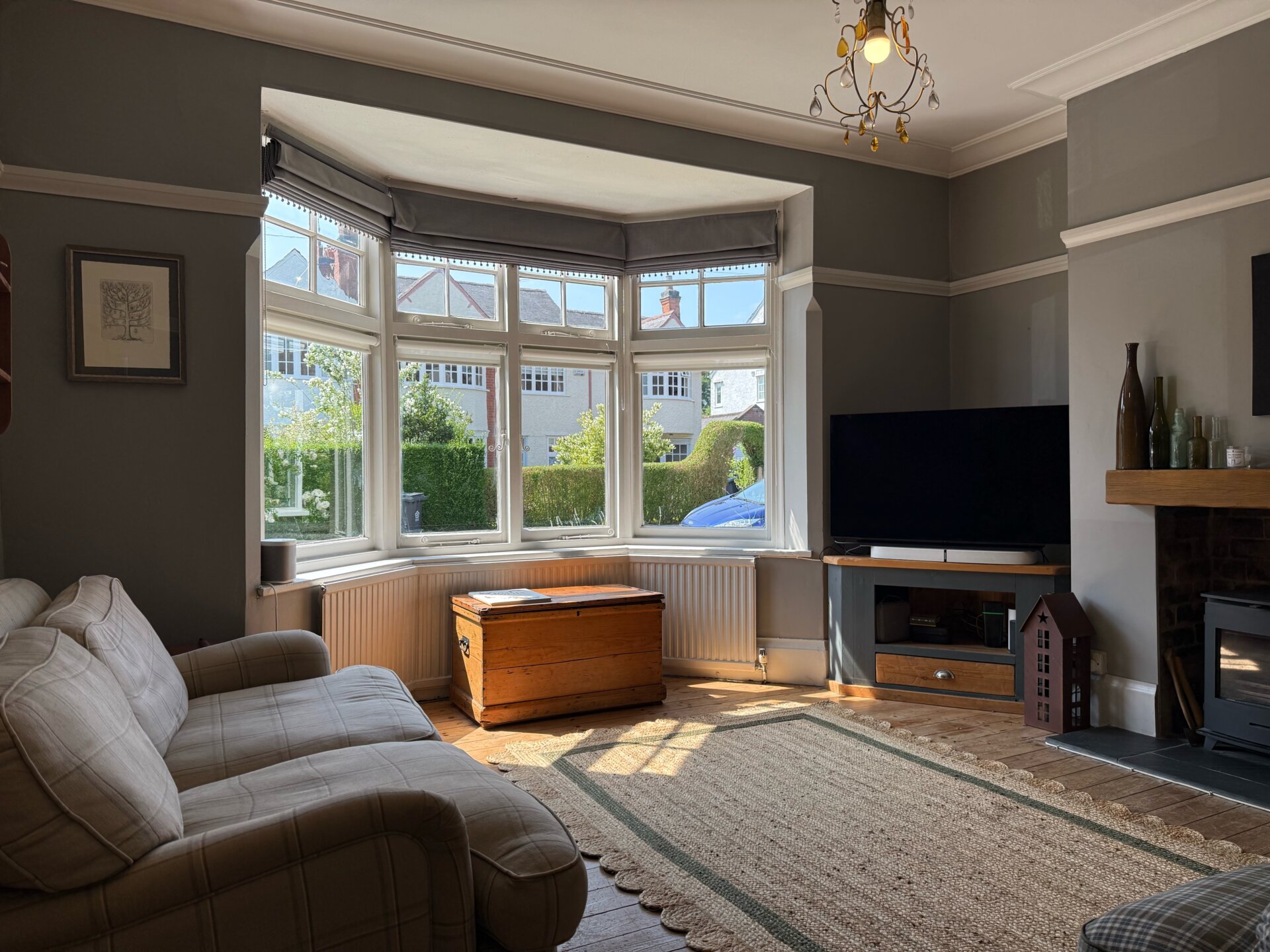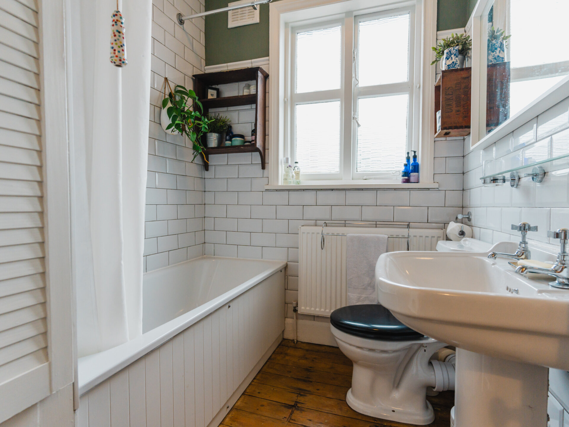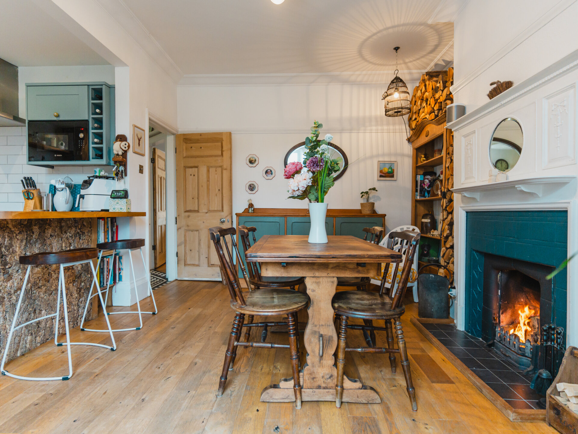 With immediate kerb appeal, the forecourt garden is adorned with established shrubbery, and a paved walkway leads to the entrance. Upon entering, a welcoming hallway with geometric Victorian-inspired tiling provides dual access to two reception rooms and the open-plan breakfast kitchen. The principal reception room is a serene space with a wonderful sense of scale, defined by high ceilings, stripped timber floorboards, and an expansive single-glazed bay window at the front. Modernised with the addition of electric-blinds powered by Tuiss, yet without losing its period charm, the room features a log burner as a striking centrepiece, complemented by a sophisticated off-grey Farrow and Ball colour palette. Towards the rear, the ground floor opens to a beautifully designed, bespoke open-plan breakfast kitchen and separate dining area, which enjoys morning light from the east-facing rear garden through French timber doors. Engineered oak floors are laid in a smart pattern, with a large open stone-surround fire serving as a stylish focal point. The breakfast kitchen is well-equipped with a range of integrated appliances to include a fridge-freezer, induction hob, oven, dish-washer, Bosch microwave and finished in a light blue colour scheme that harmonises with the oak surfaces and neutral off-white tones of the dining area. The property also benefits from a newly refurbished, beautifully designed ground-floor family bathroom and utility room (May 2025) completing the ground-floor accommodation.