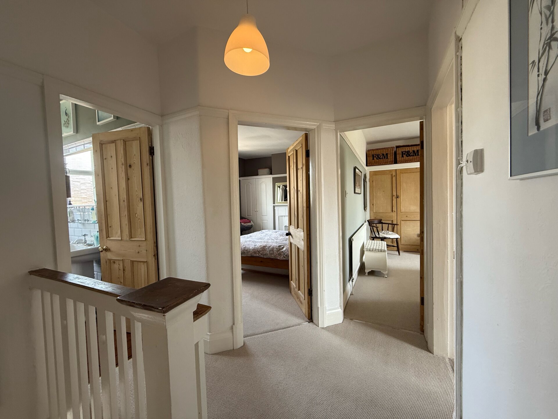 A stripped timber staircase leads to an exceptionally spacious landing that opens onto three double bedrooms, all serviced by a modern, fitted three-piece family bathroom. Each bedroom benefits from a Farrow and Ball inspired colour-palette, original sash windows and picture rails, with two of the rooms featuring original cast-iron fireplaces and fitted wardrobes. All three bedrooms are beautifully presented and offer ample space for essential furnishings. The accommodation is completed by a stylish three-piece family bathroom. We are informed the loft is both insulated, boarded and benefits from a velux skylight. Through necessary consents, the space here could be altered to extend the existing home.