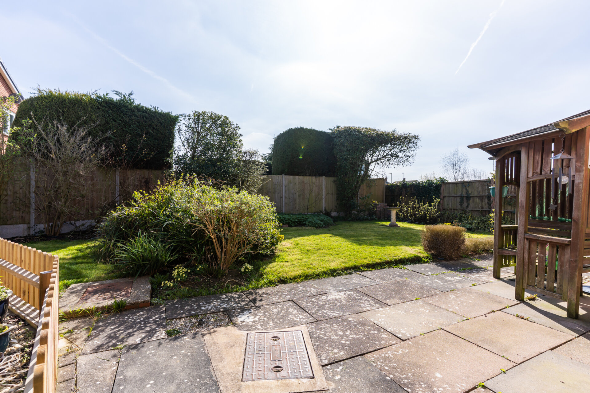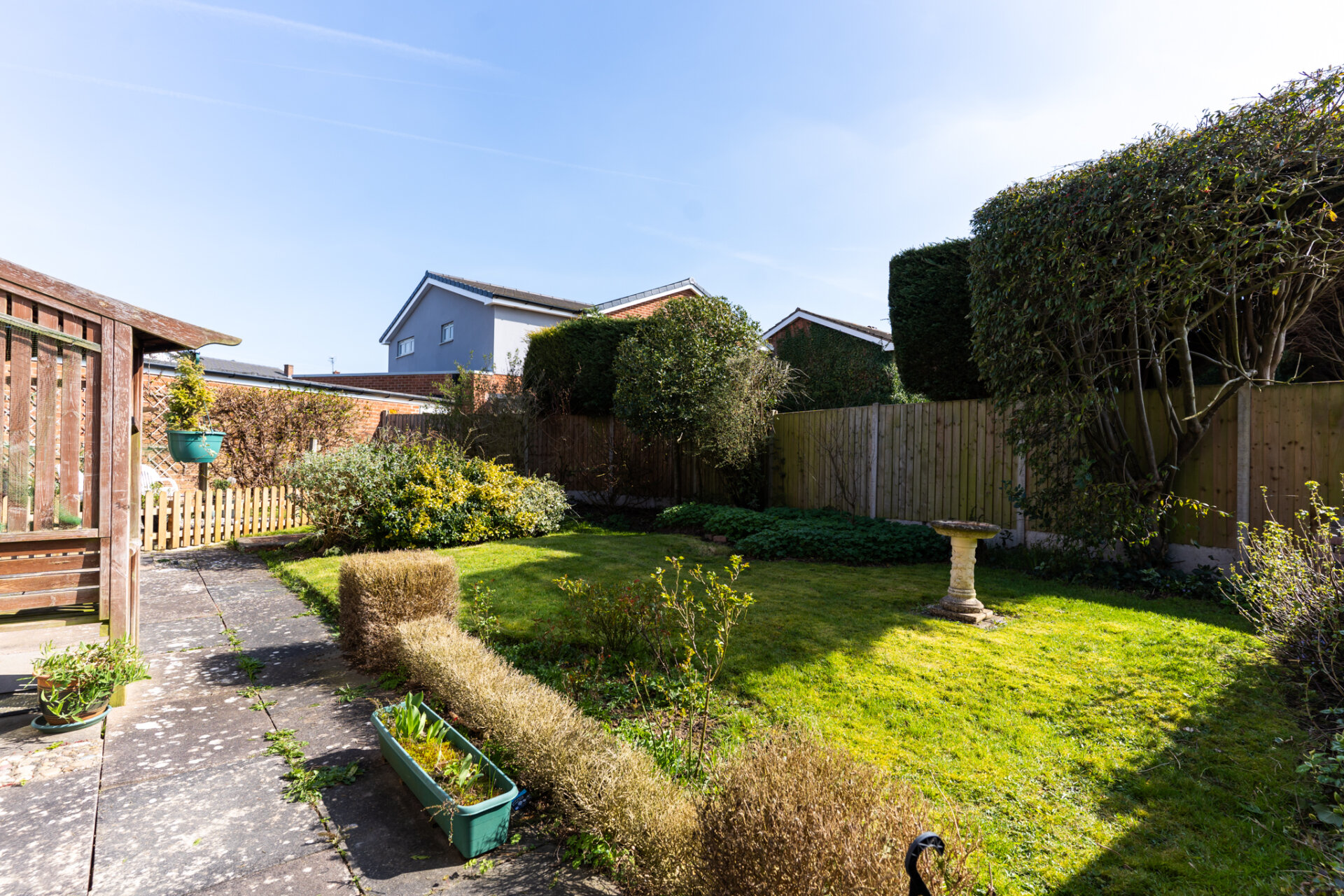 The rear garden enjoys a south-east facing aspect, allowing it to benefit from good levels of sunlight throughout the day. A large patio area spans the rear of the property, providing an ideal spot for outdoor seating and entertaining. Beyond this, the garden is mainly laid to lawn with established borders planted with a variety of shrubs, plants and small trees, giving the space a mature and well-kept feel. A side gate provides access to the front of the property, and there is also a personnel door leading directly into the garage.