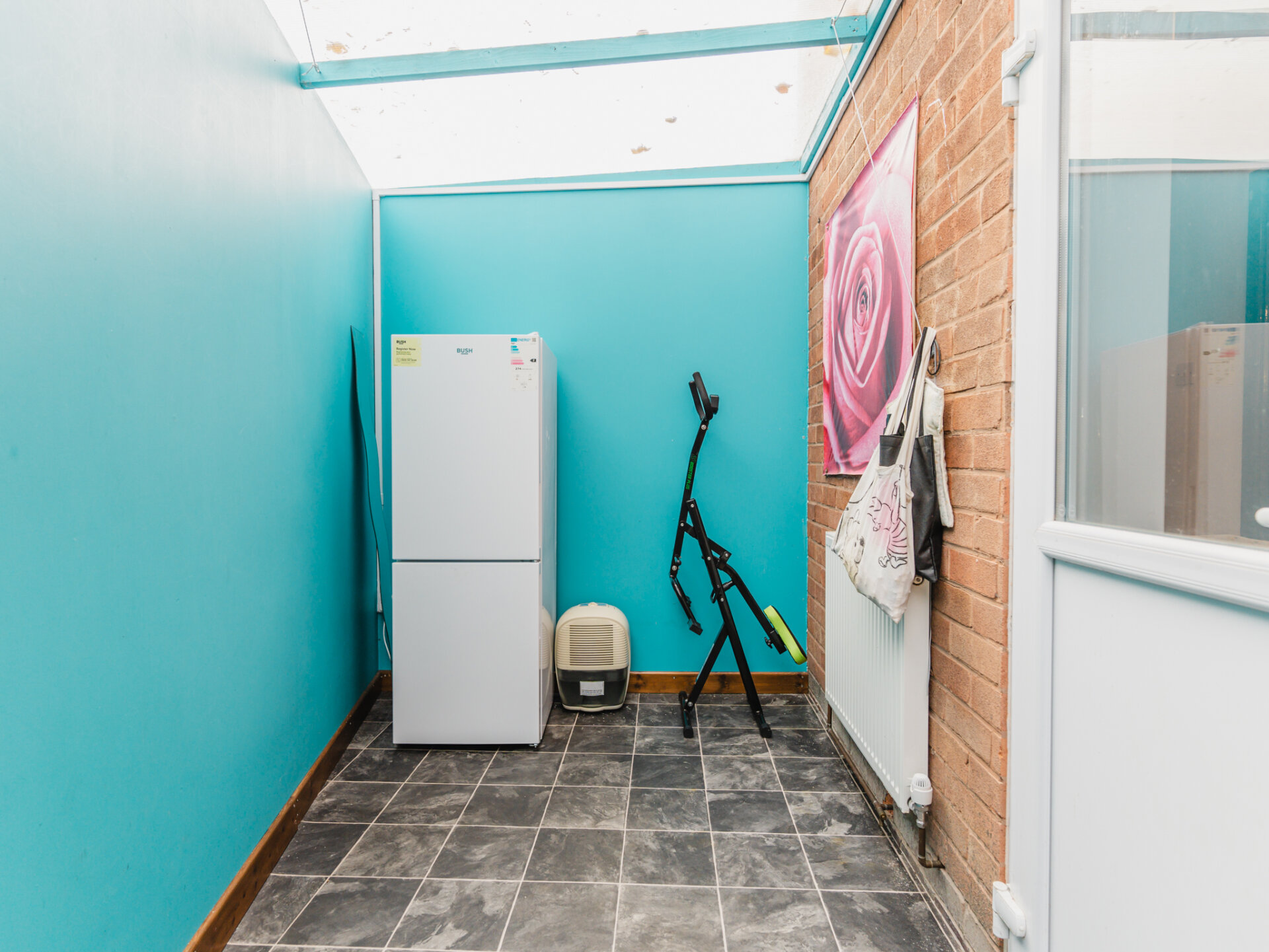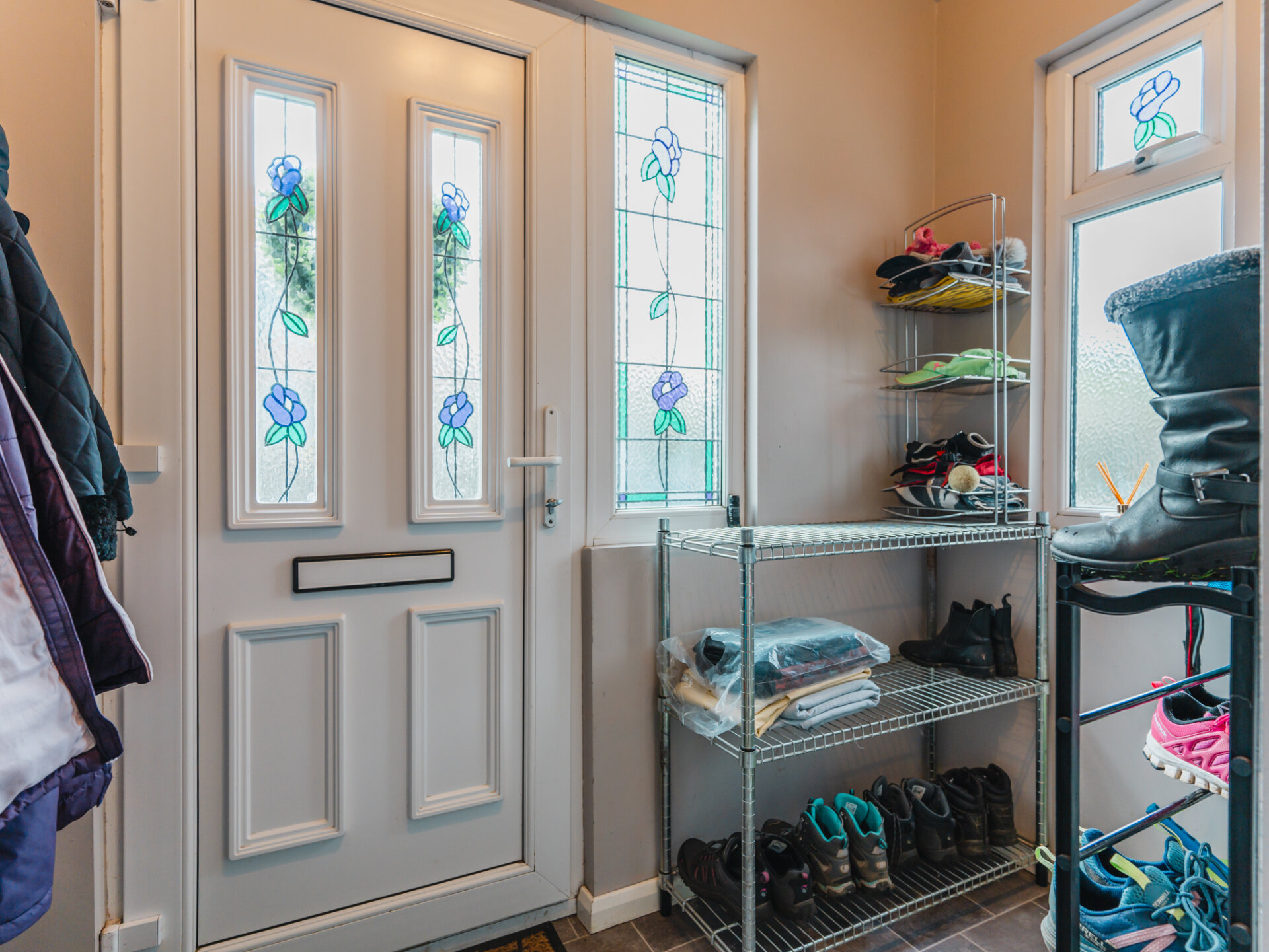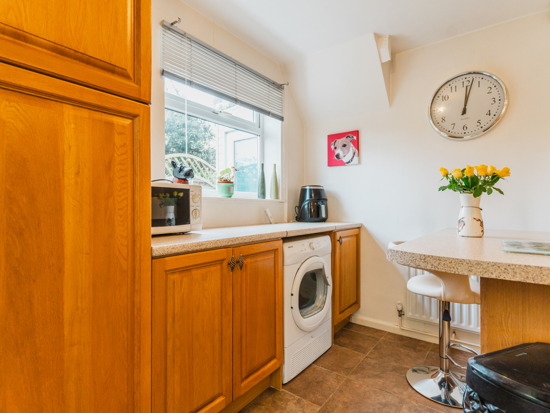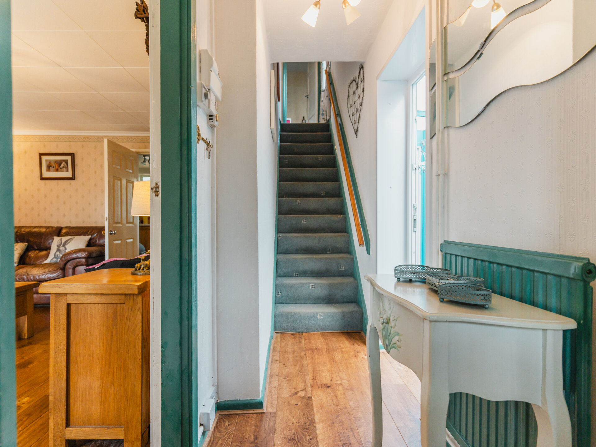 The property welcomes you via an enclosed porch, an extension to the original structure. This handy space is ideal for storing coats and shoes before entering the main house. The entrance hall provides access to the staircase, living room, and a unique drying room—a multipurpose space equipped with heating and an external door to the garden. Whether you need extra storage, a spot for appliances, or a convenient laundry area, this room has you covered.