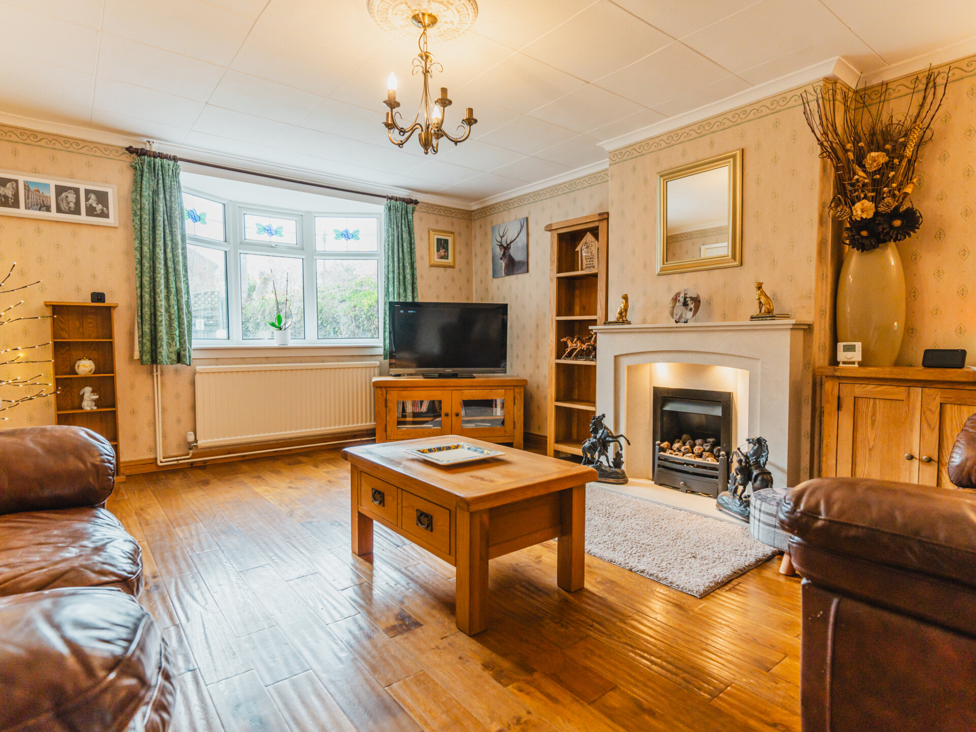 The living room is generously sized, featuring a charming gas fireplace as its focal point. A box bay window fills the room with natural light, and the oak flooring adds a touch of elegance.