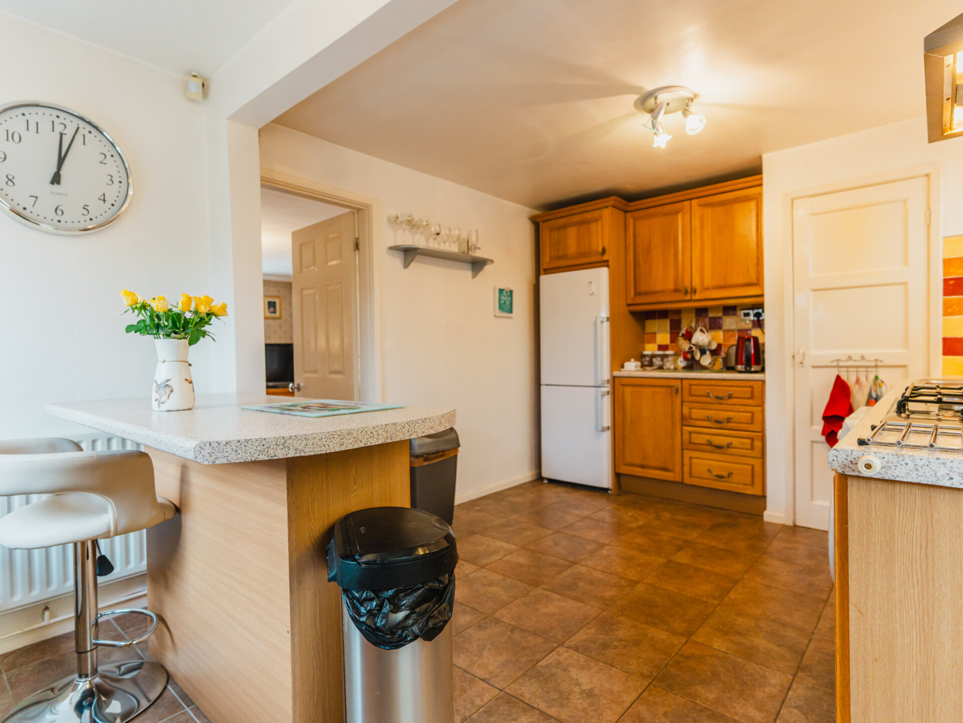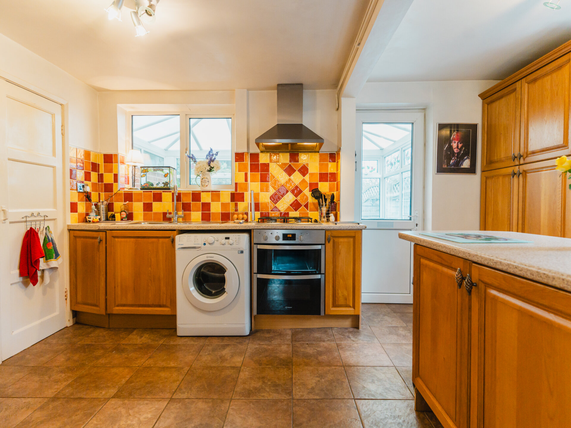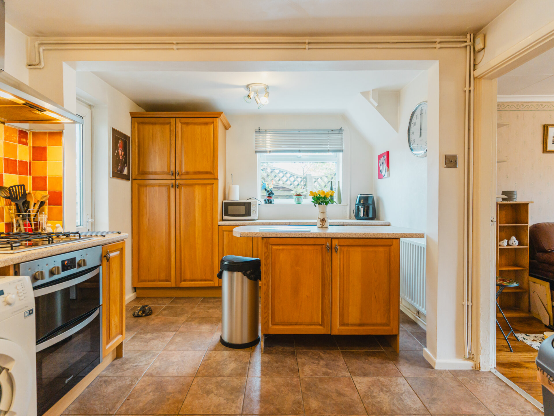 From the living room, step into the kitchen breakfast room, the true hub of the home. Originally two rooms, it has been opened up to create a spacious, functional area with hardwood kitchen units, ample worktops, and a moveable island for flexibility. A fitted gas hob, electric ovens, pantry cupboard, and space for a washing machine and fridge/freezer complete the setup.