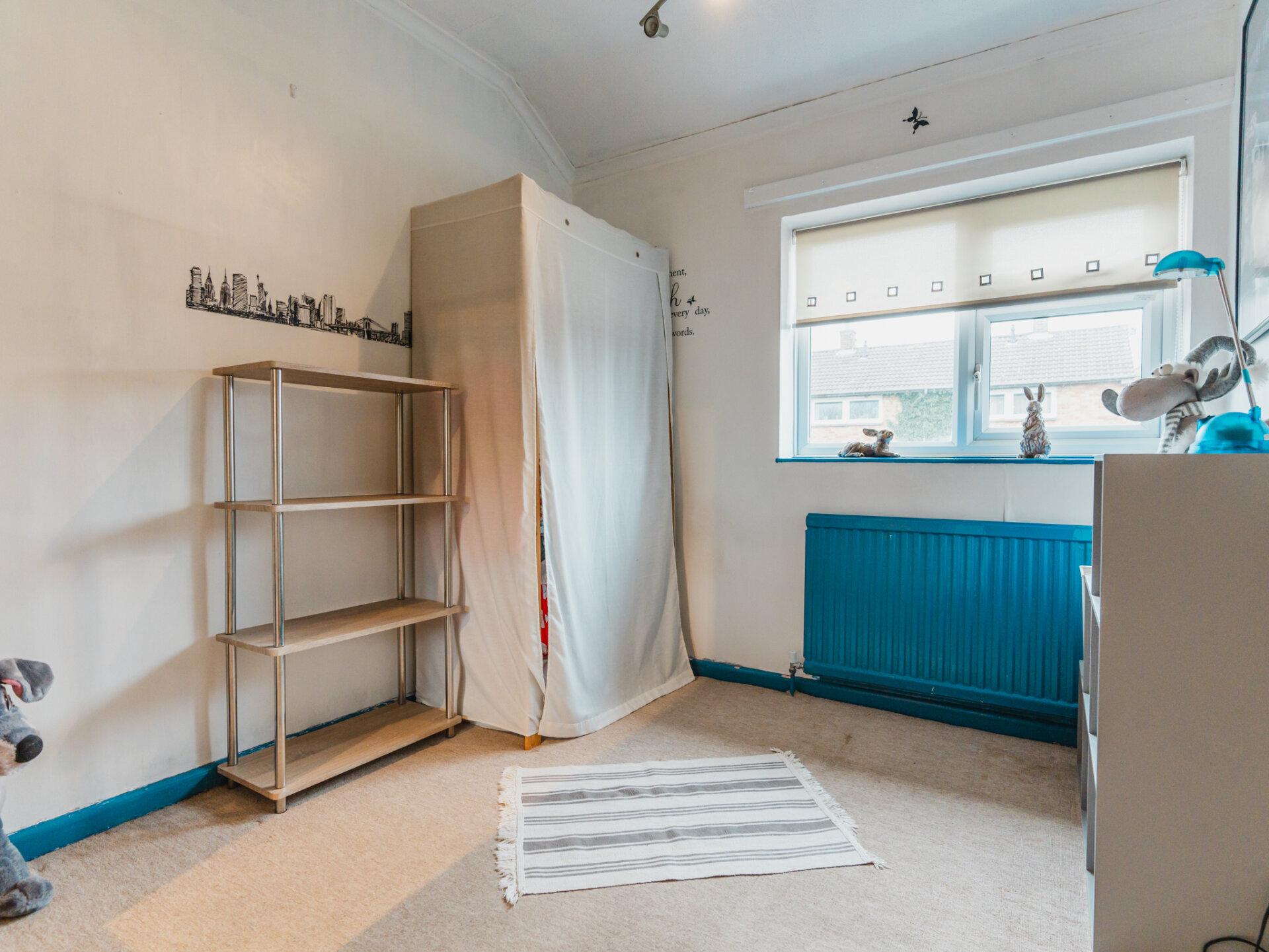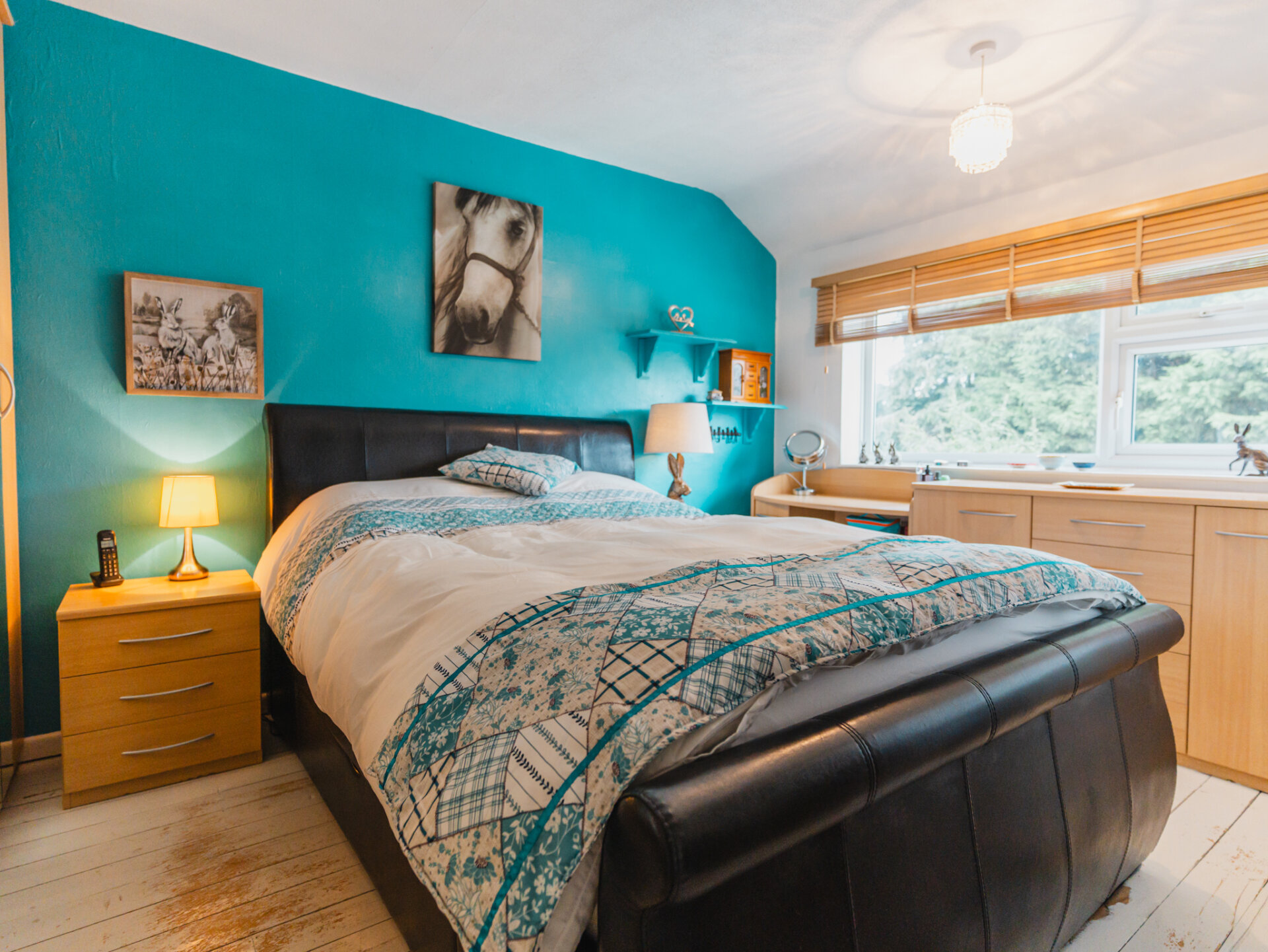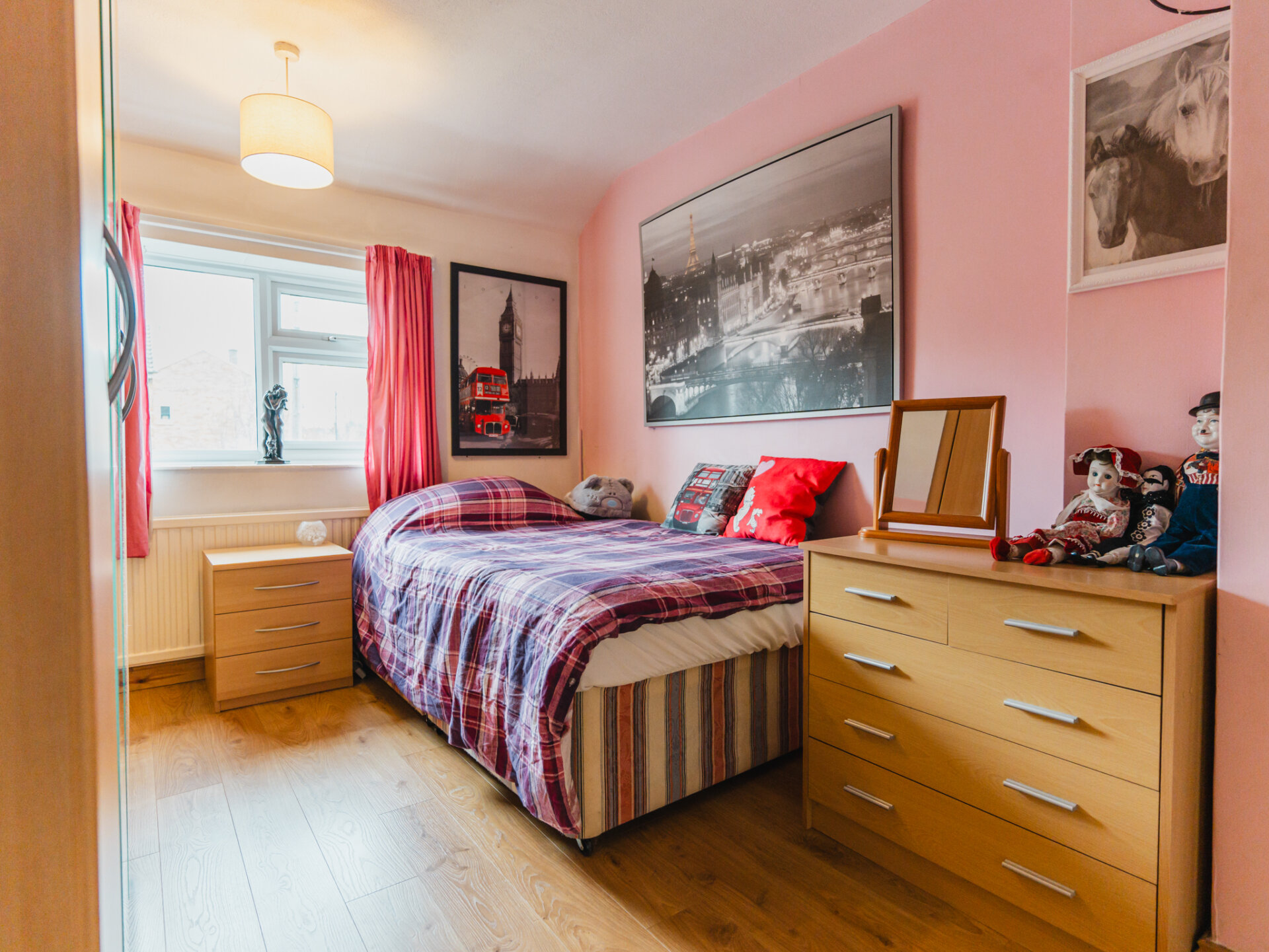 Upstairs, the home features three well-proportioned bedrooms. The main bedroom is a large double with exposed floorboards, garden views, and plenty of space for wardrobes. Bedroom two is another double with laminate flooring and room for wardrobes. The third bedroom is a generous single, perfect for a child’s room or home office.