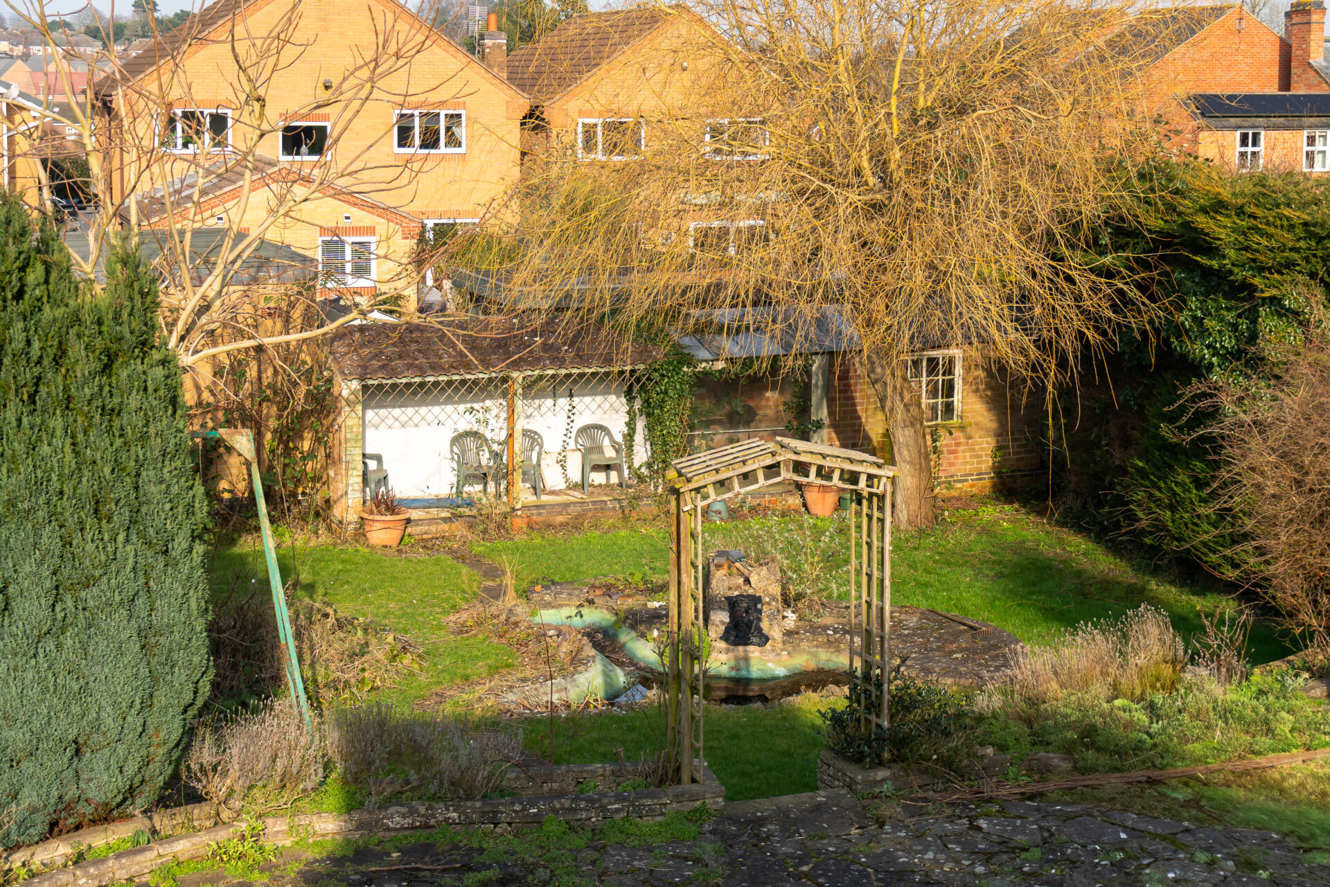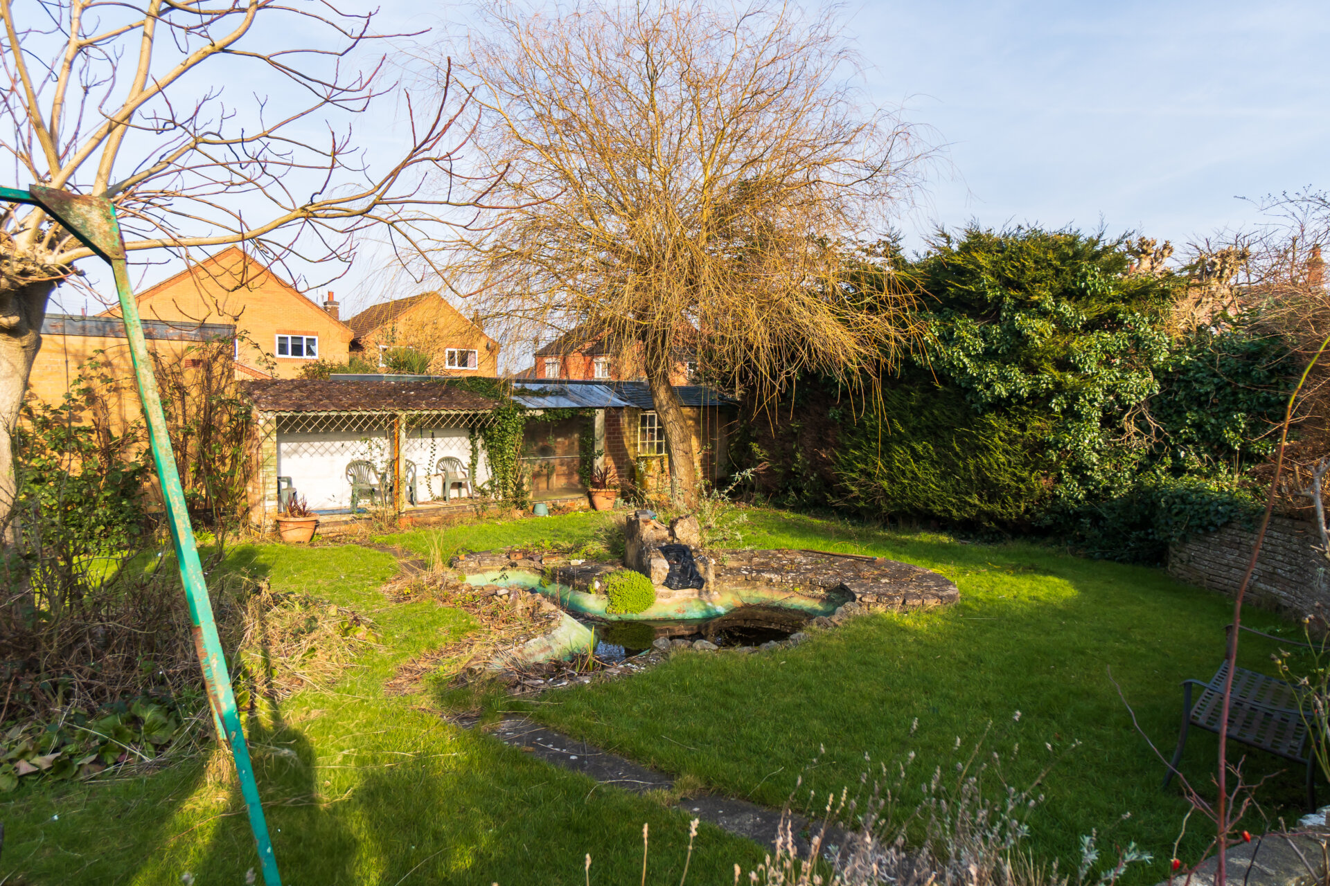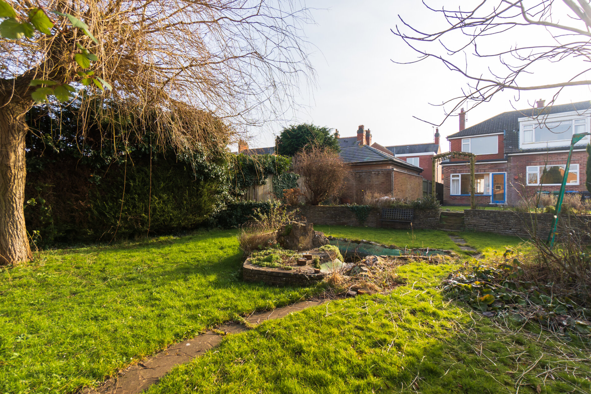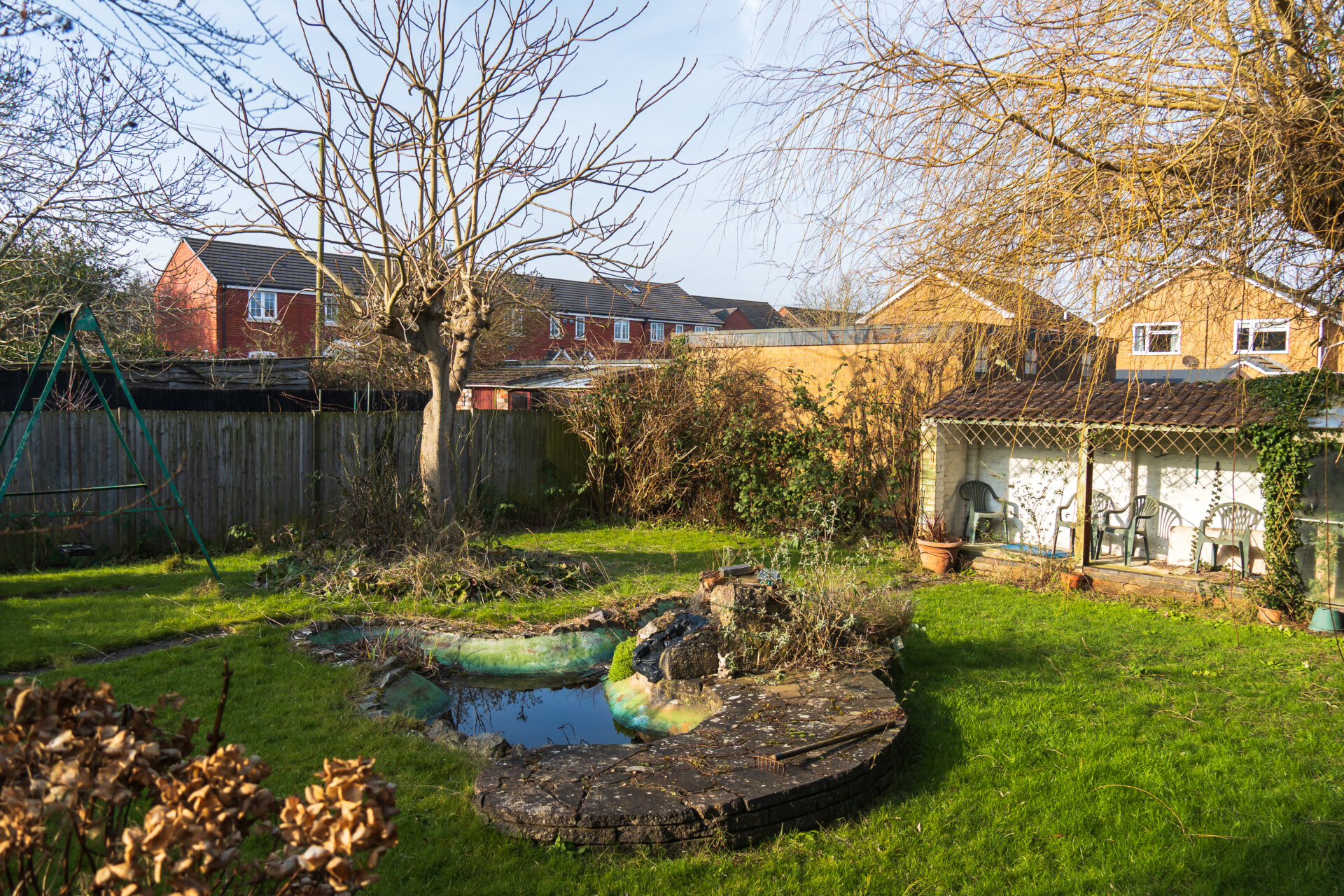The property is situated on a large plot with a lawned front garden and driveway providing off road parking and access to the garage. There is a pedestrian side gate allowing access into the rear garden. The particularly generous rear garden offers a large circular lawn with crazy paving patio area encompassing the lawn, steps lead down to the lower garden having a further lawn, ornamental pond, mature trees, shrubs and planting. There is a handy brick-built store and delightful covered seating area allowing wonderful views of the entire garden back towards the house.