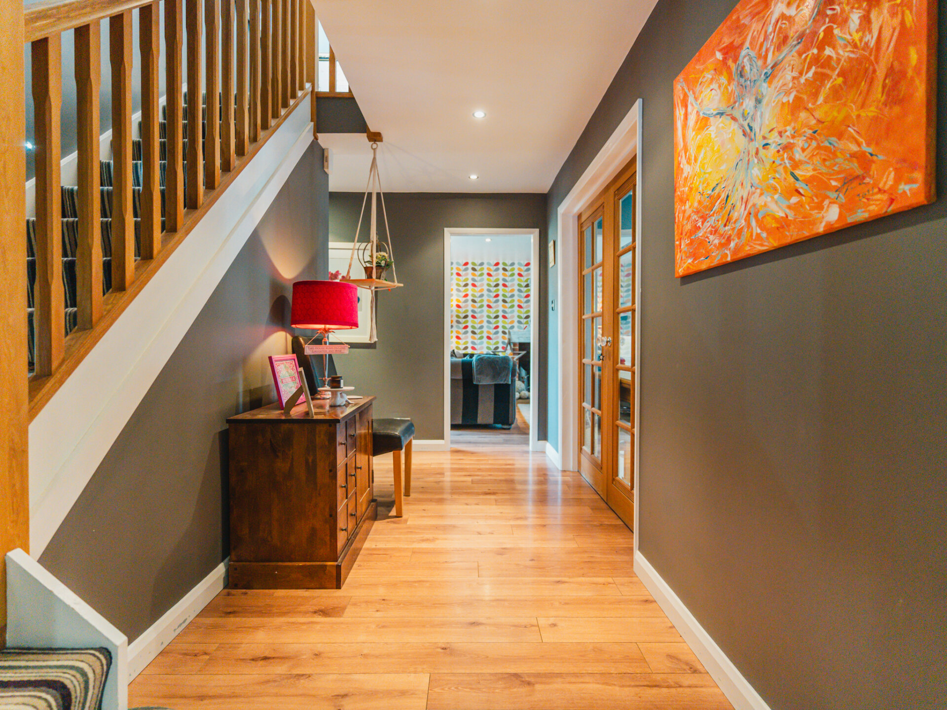 Step through the oak front door into an inviting entrance hall, where contemporary laminate flooring meets the warm glow of ceiling spotlights. The staircase ahead leads to the first floor, while an array or doors guide you to the ground floor's thoughtfully designed spaces.