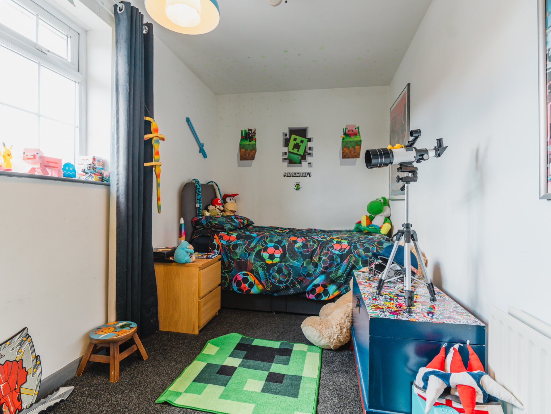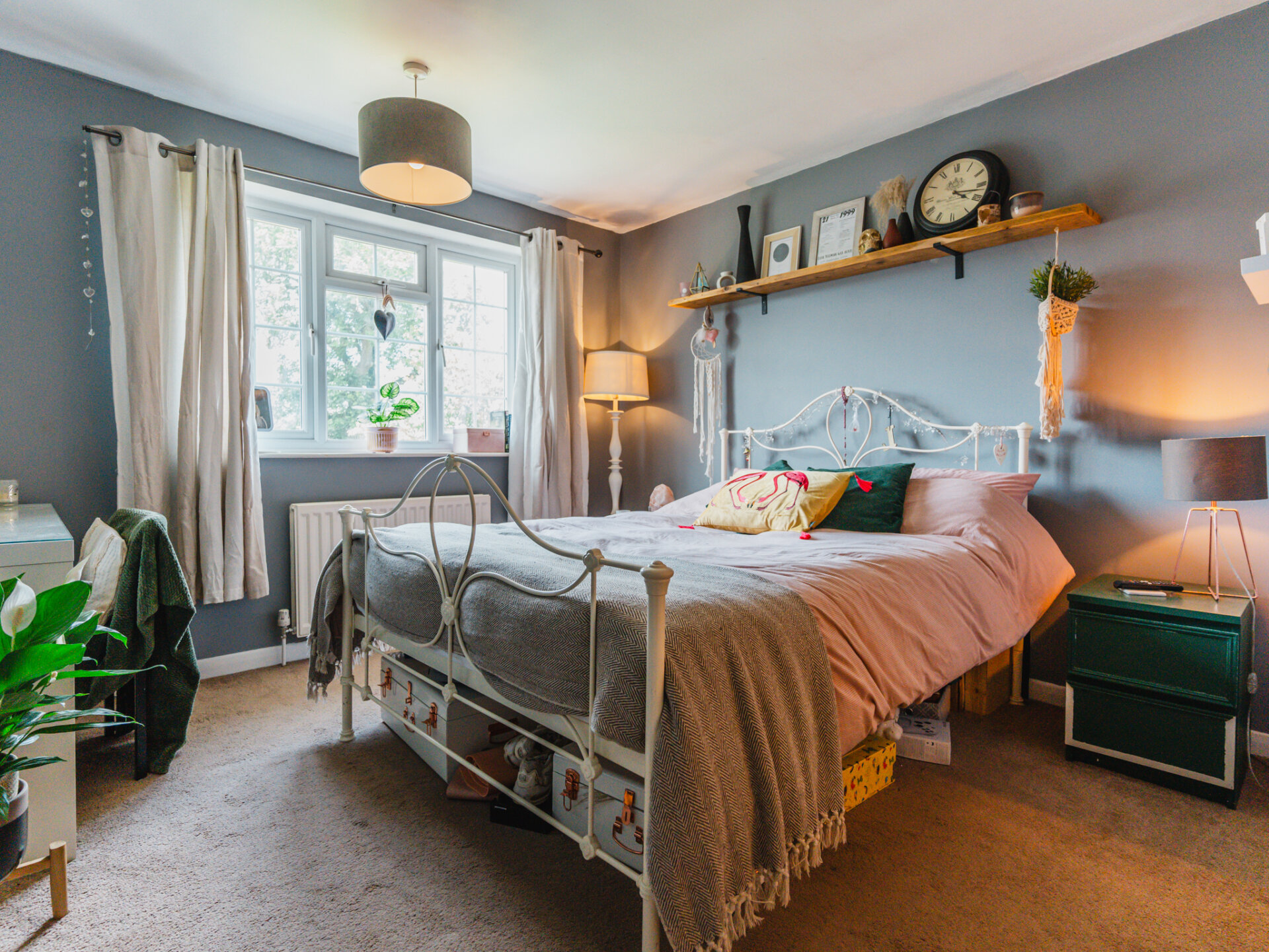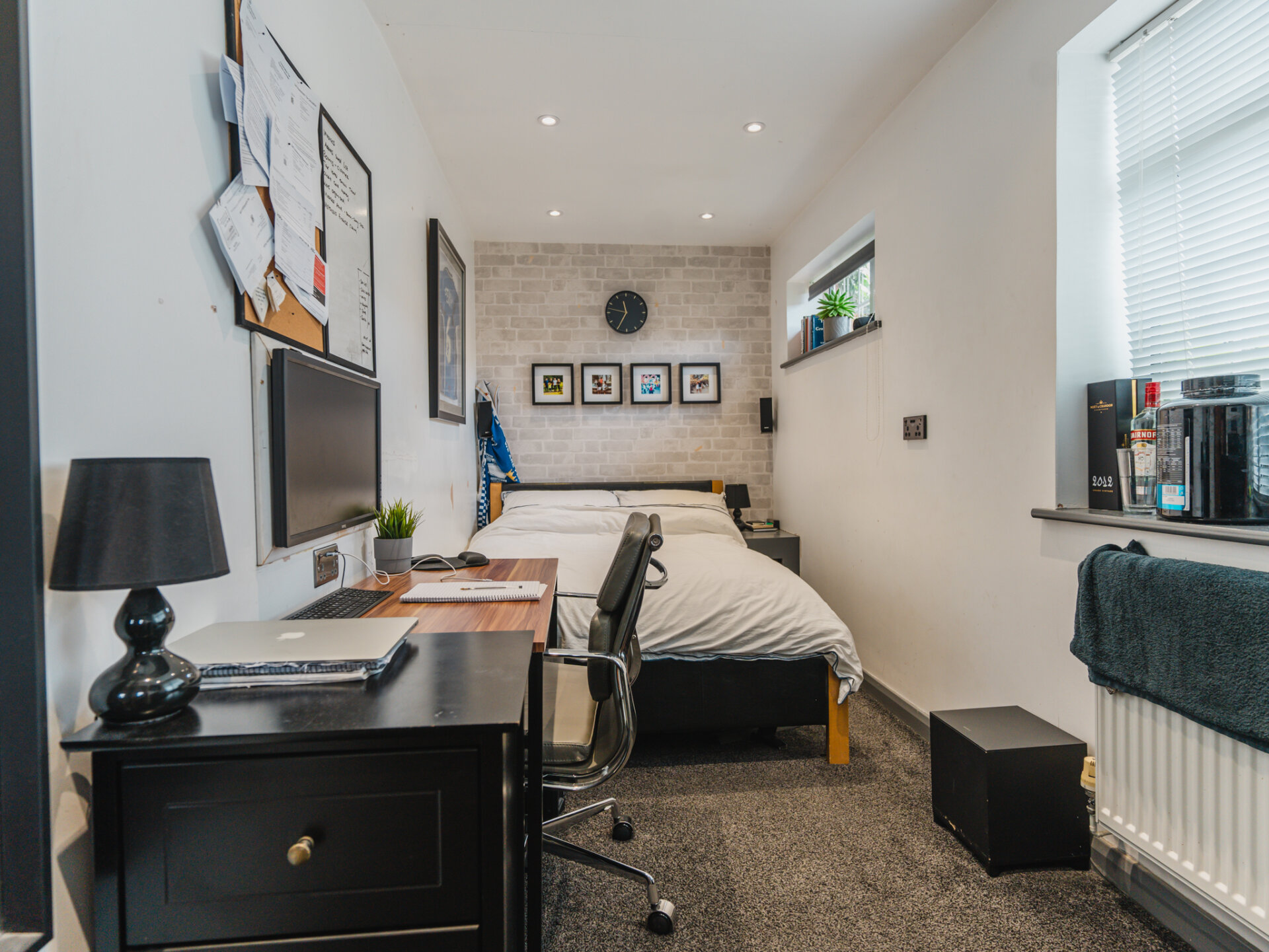 On the right, the study extends the welcoming laminate flooring. Currently used as an additional ground-floor bedroom, this space features front-facing windows and a handy open cupboard under the stairs, perfect for storage.
