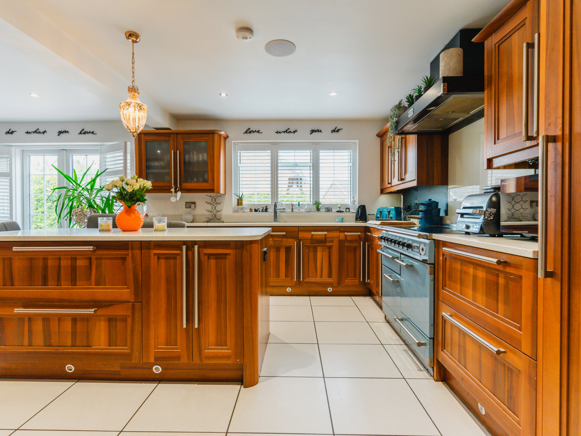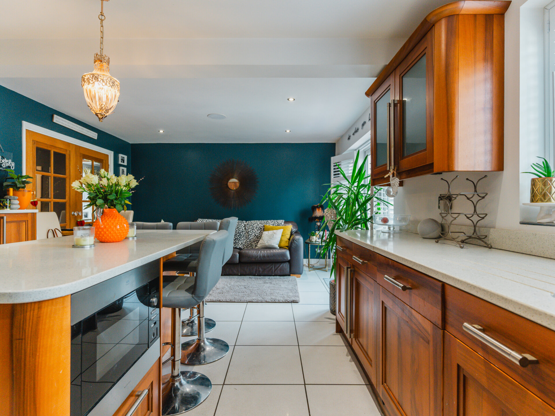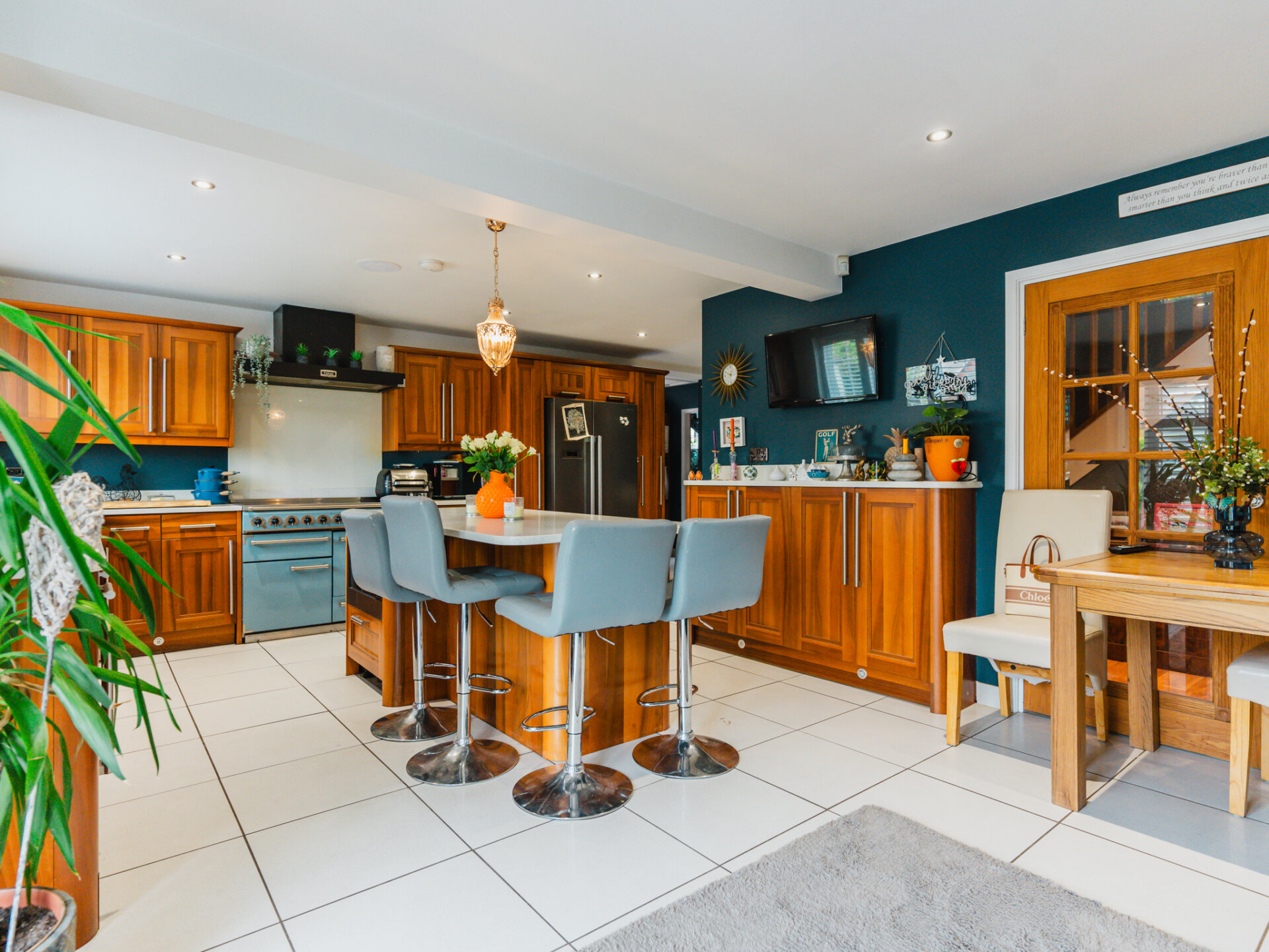 At the heart of this home is the breathtaking 'L' shaped living kitchen. Boasting a stunning array of walnut fronted eye and base level units, ample cream Polygranite surfaces, and an undermounted ceramic sink, this kitchen is a chef's paradise. The Falcon professional range oven and freestanding LG American-style fridge freezer add to the luxury, while the integrated dishwasher and island unit with breakfast bar ensure functionality. Porcelain tiled flooring and French doors opening to the rear garden complete this perfect space.