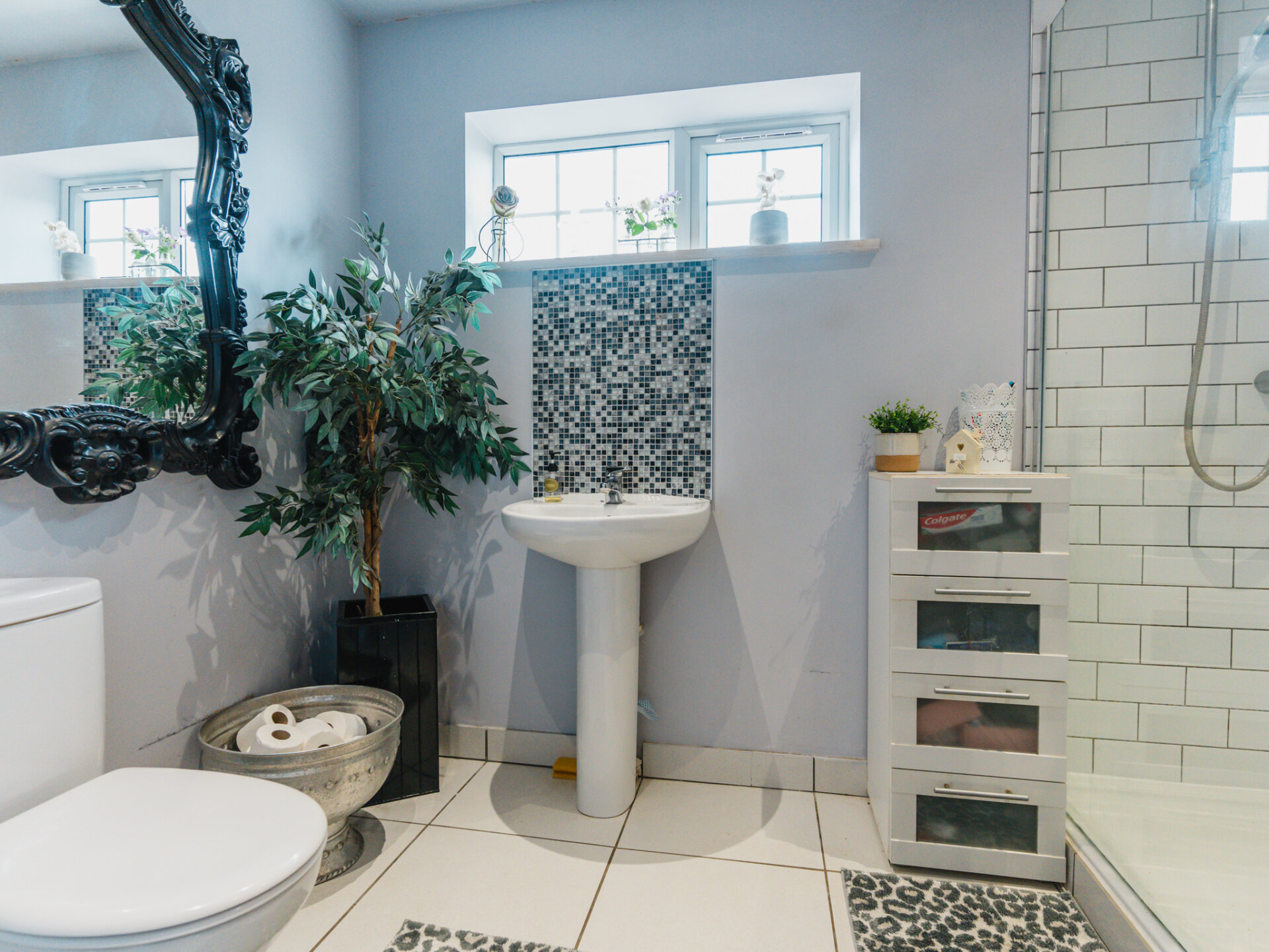Convenience continues with a ground floor shower room, featuring a white three-piece suite, including a low flush WC, pedestal wash hand basin, and double shower cubicle, complemented by a chrome heated towel rail.