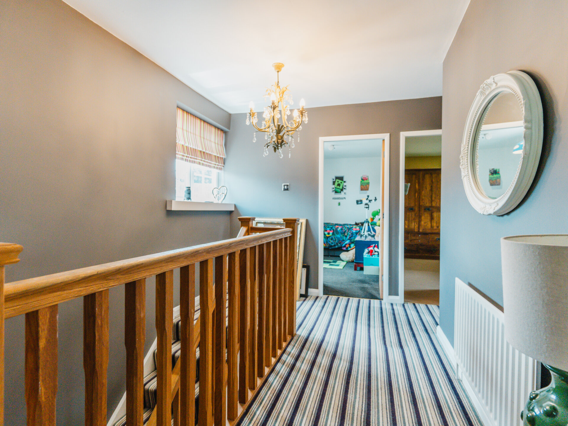 Adjacent to the kitchen, the utility room provides oak-fronted base level units, roll edge laminated work surfaces, and space for both a washing machine and a condenser dryer. A rear lobby with a side window houses a cloaks cupboard and offers additional access to the rear garden.
