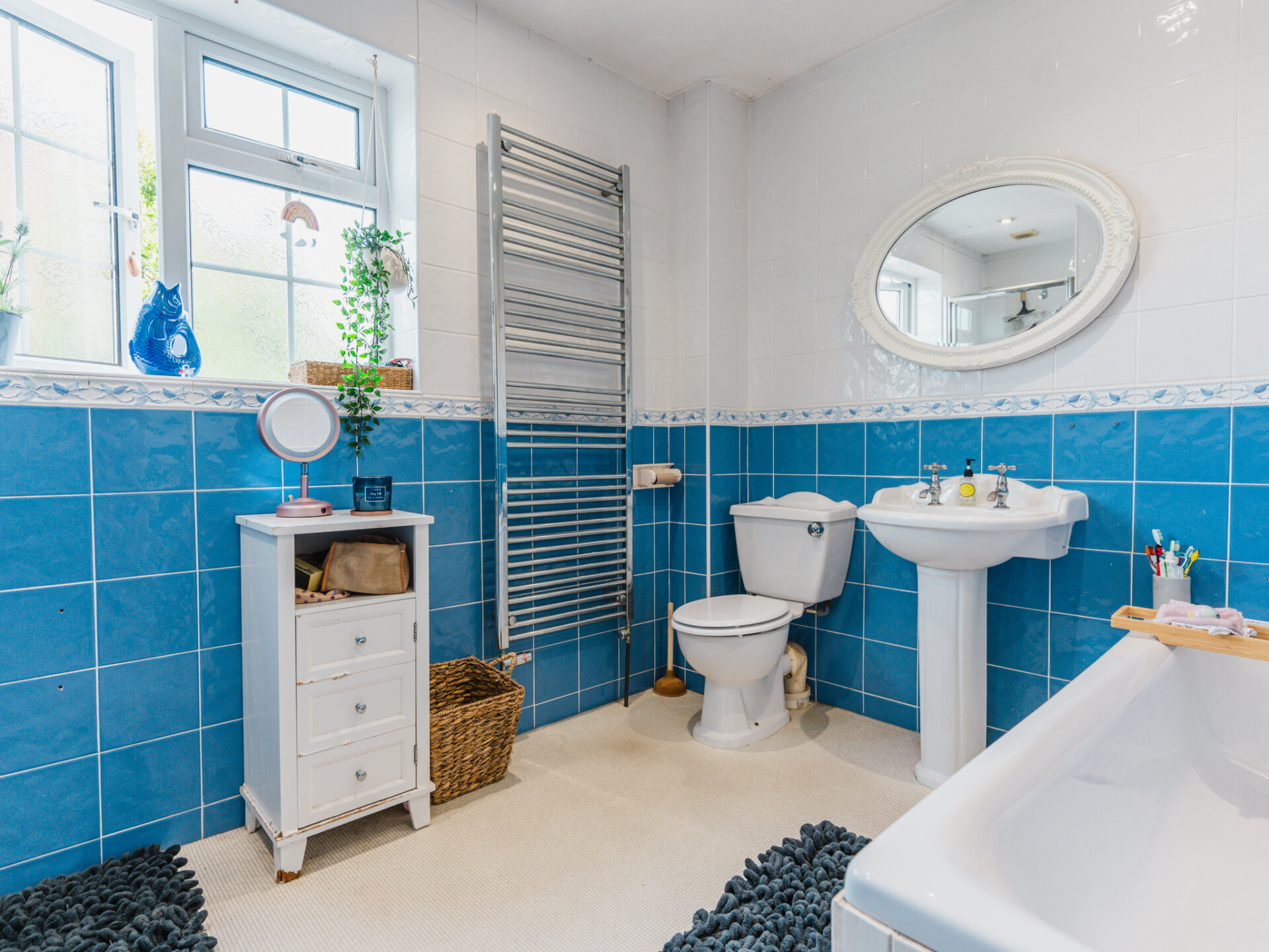 The family bathroom is a haven of relaxation, featuring a white four-piece suite: a low flush WC, pedestal wash hand basin, panelled bath, and shower cubicle, all accentuated by a chrome heated towel rail.