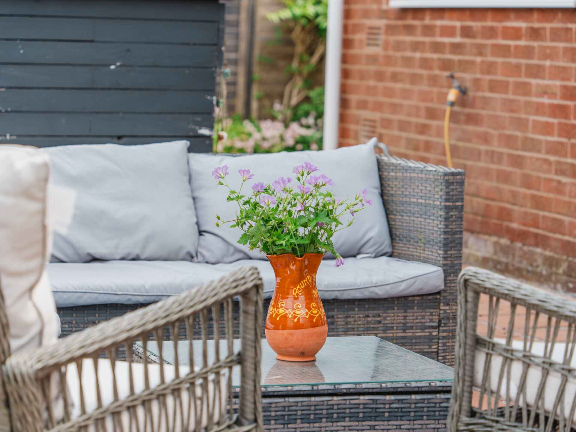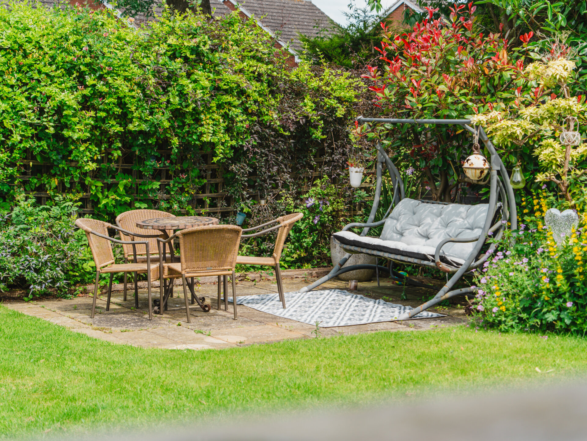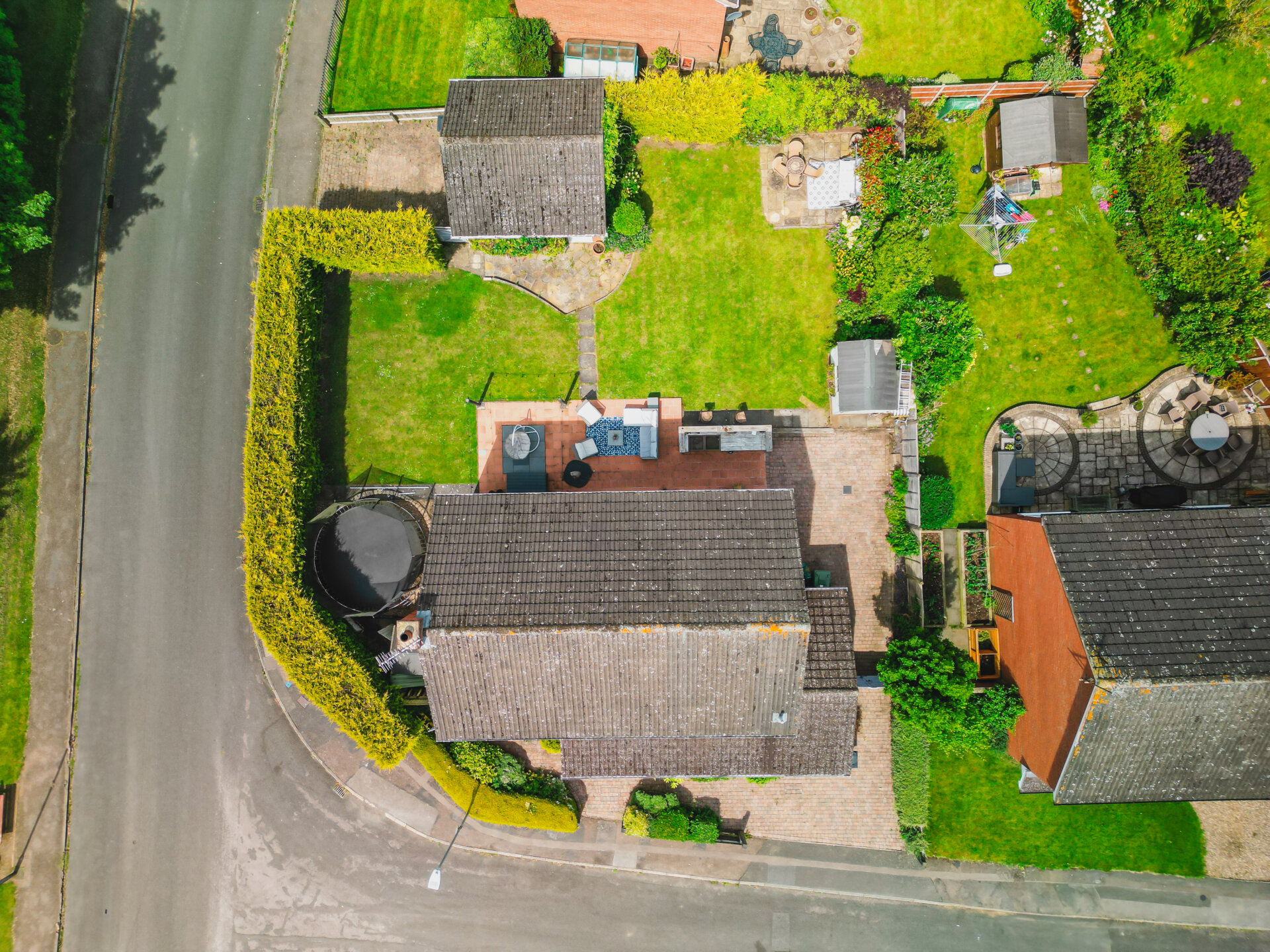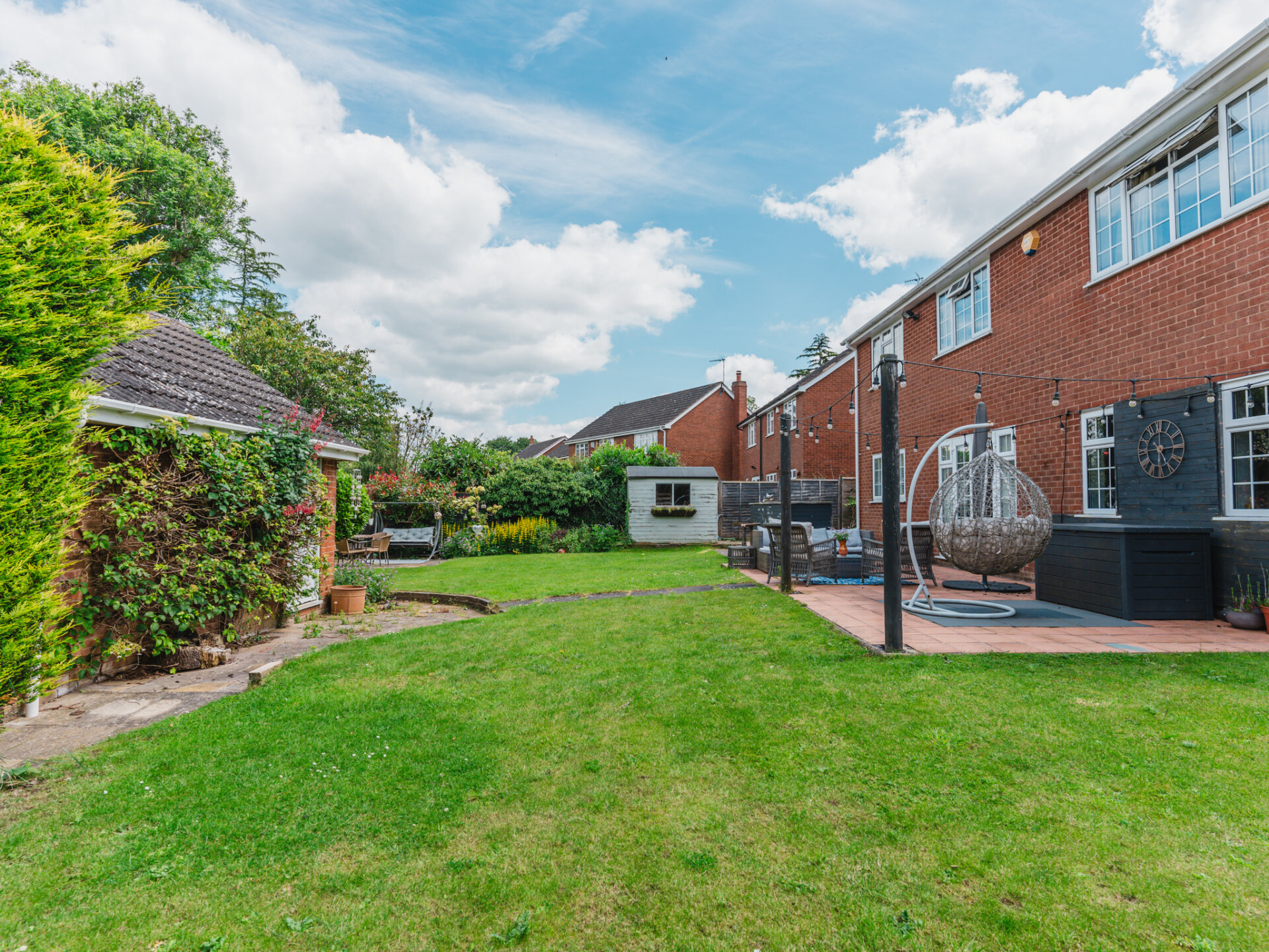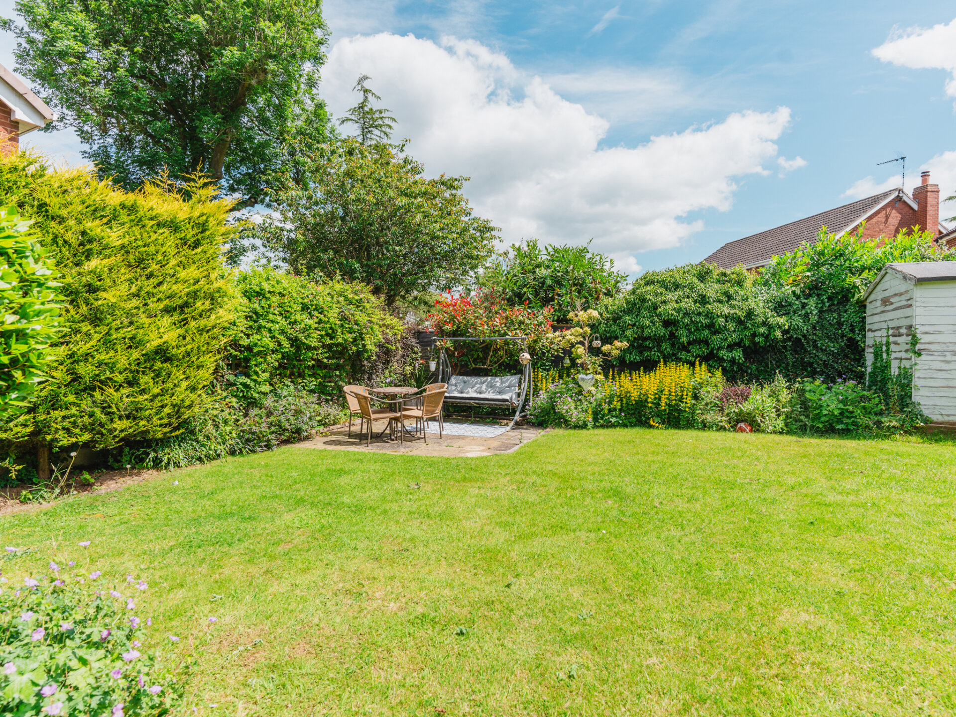 Outside, the property continues to impress. The front boasts a block paved driveway and charming planted gardens behind a low-level fence. High hedged boundaries to the side and rear add to the curb appeal and privacy. The rear garden is a beautifully lawned oasis, with colourful shrub and flower beds with two paved patio areas, ideal for outdoor entertaining.