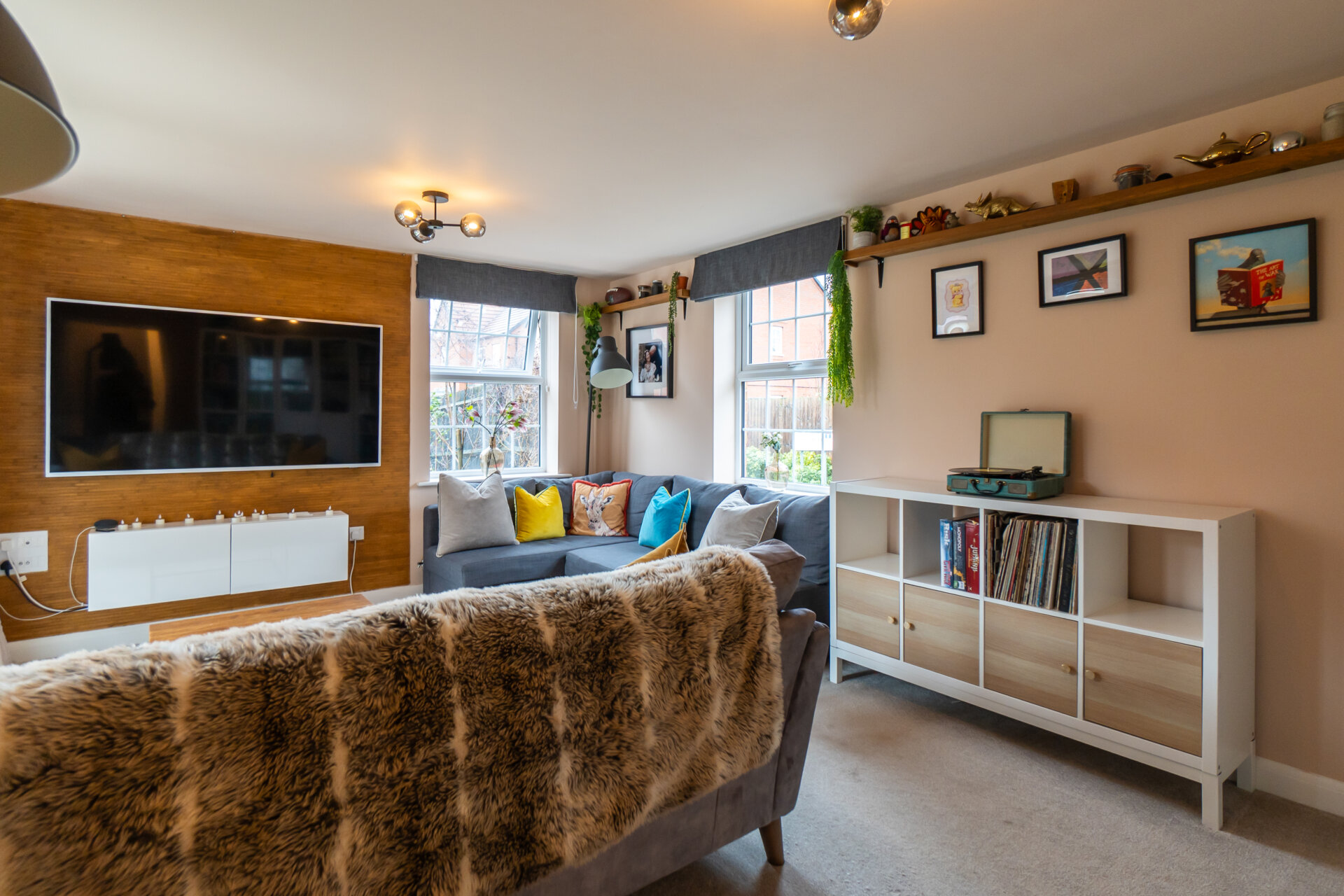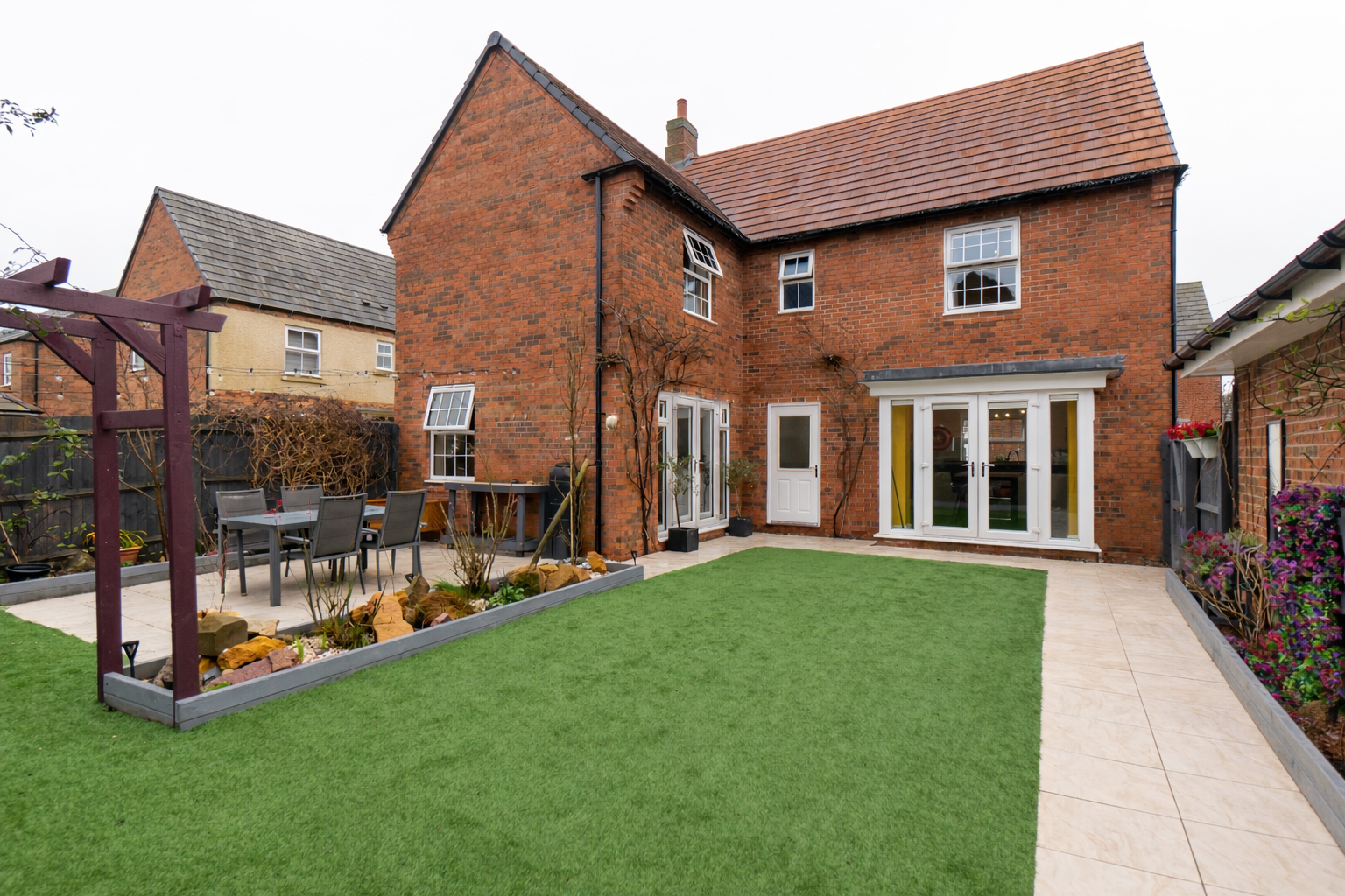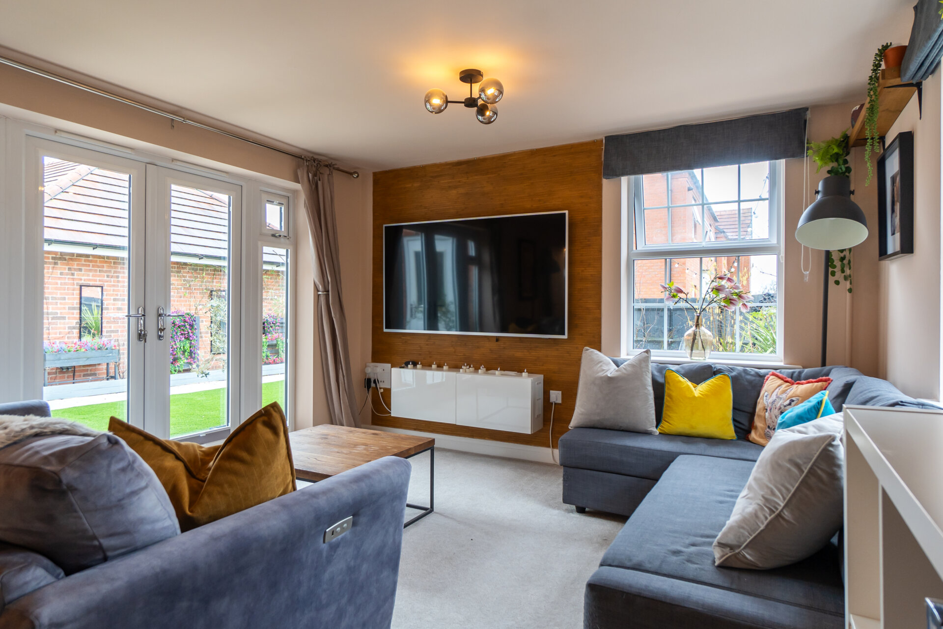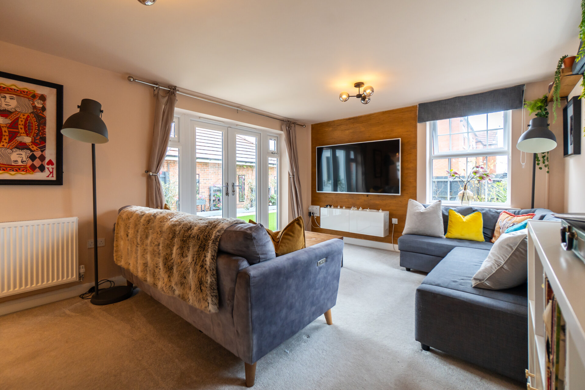 The lounge is another highlight, filled with natural light thanks to triple-aspect windows and a further set of French doors leading out to the garden, creating a seamless connection between indoor and outdoor living.