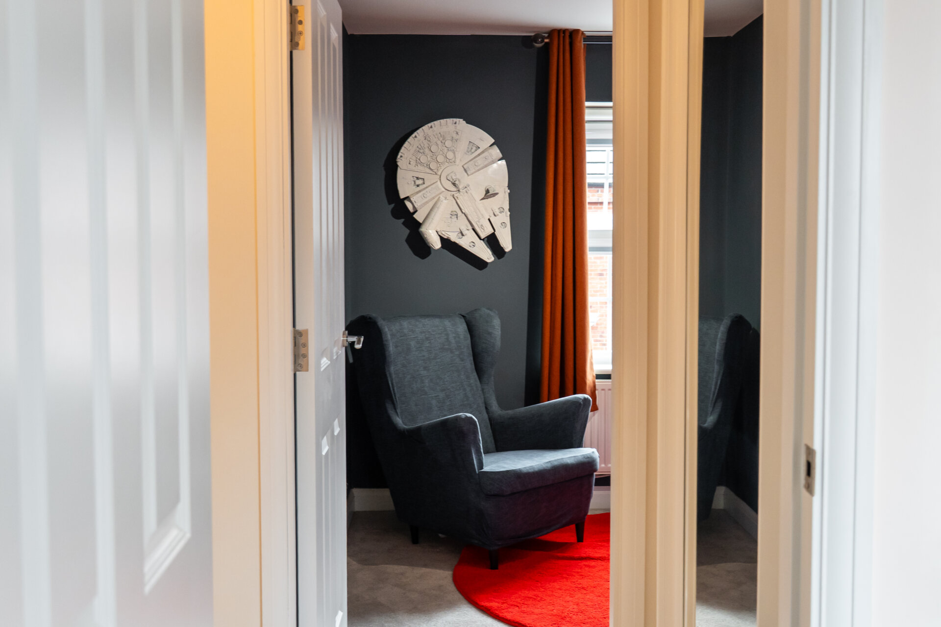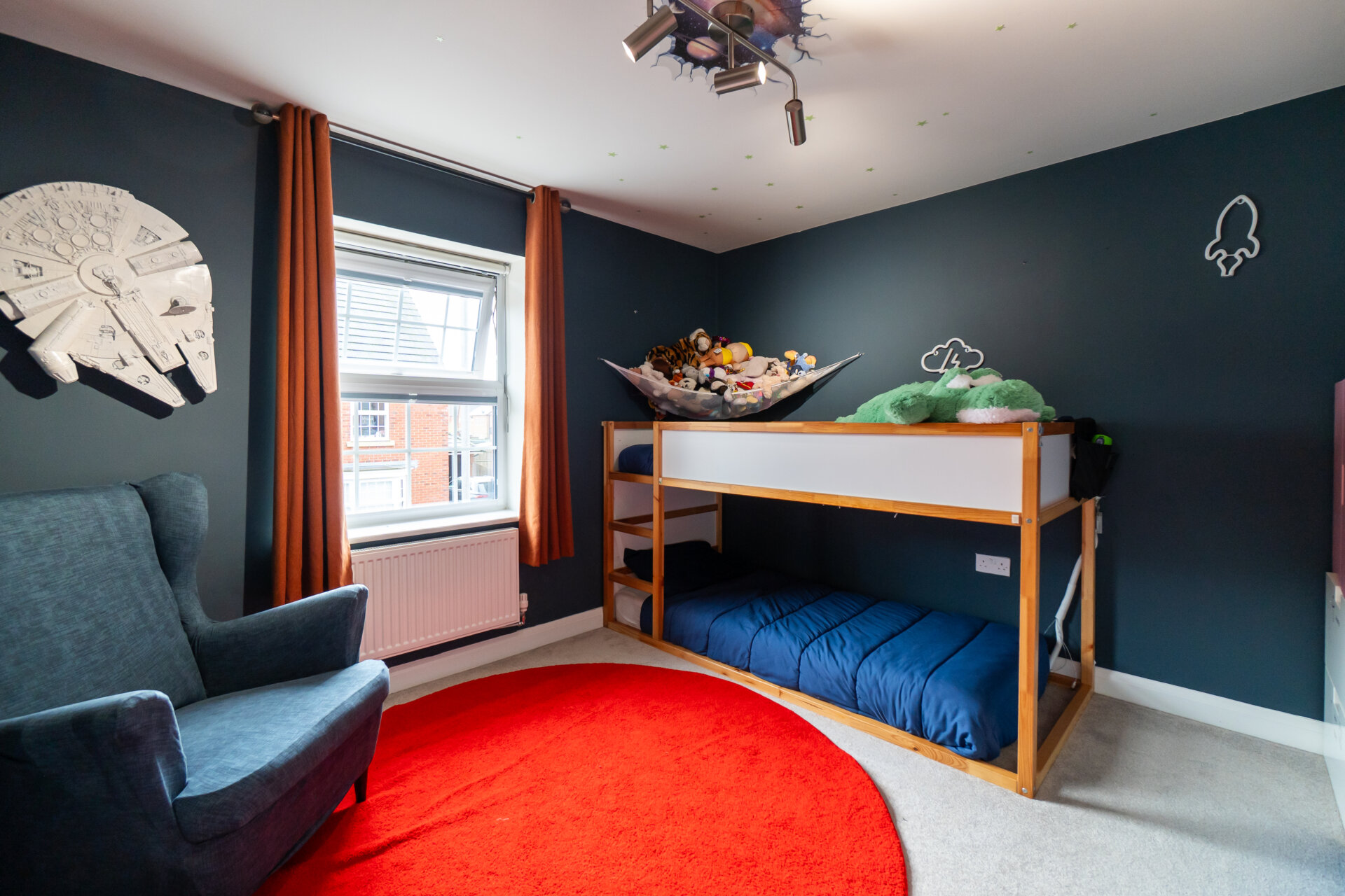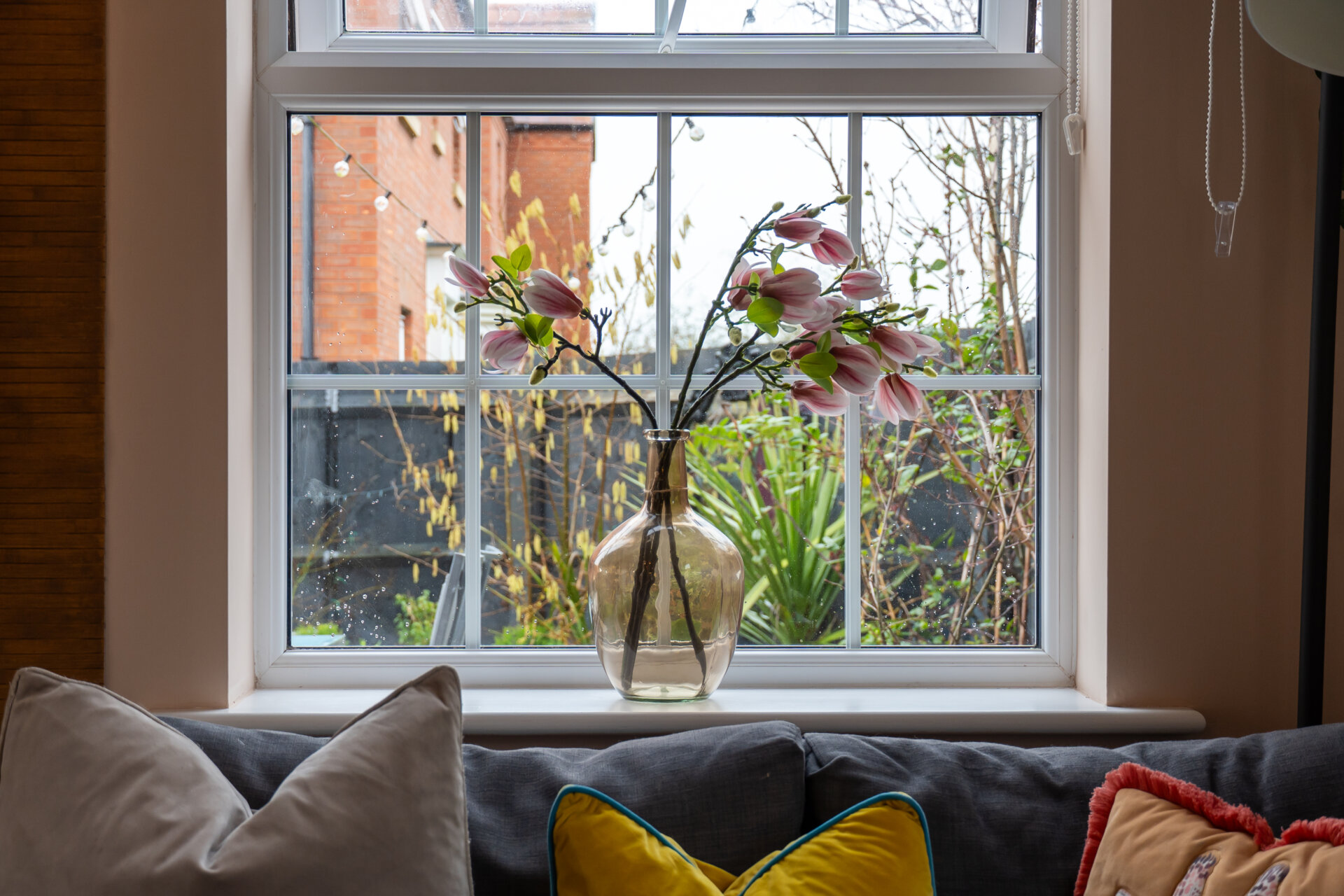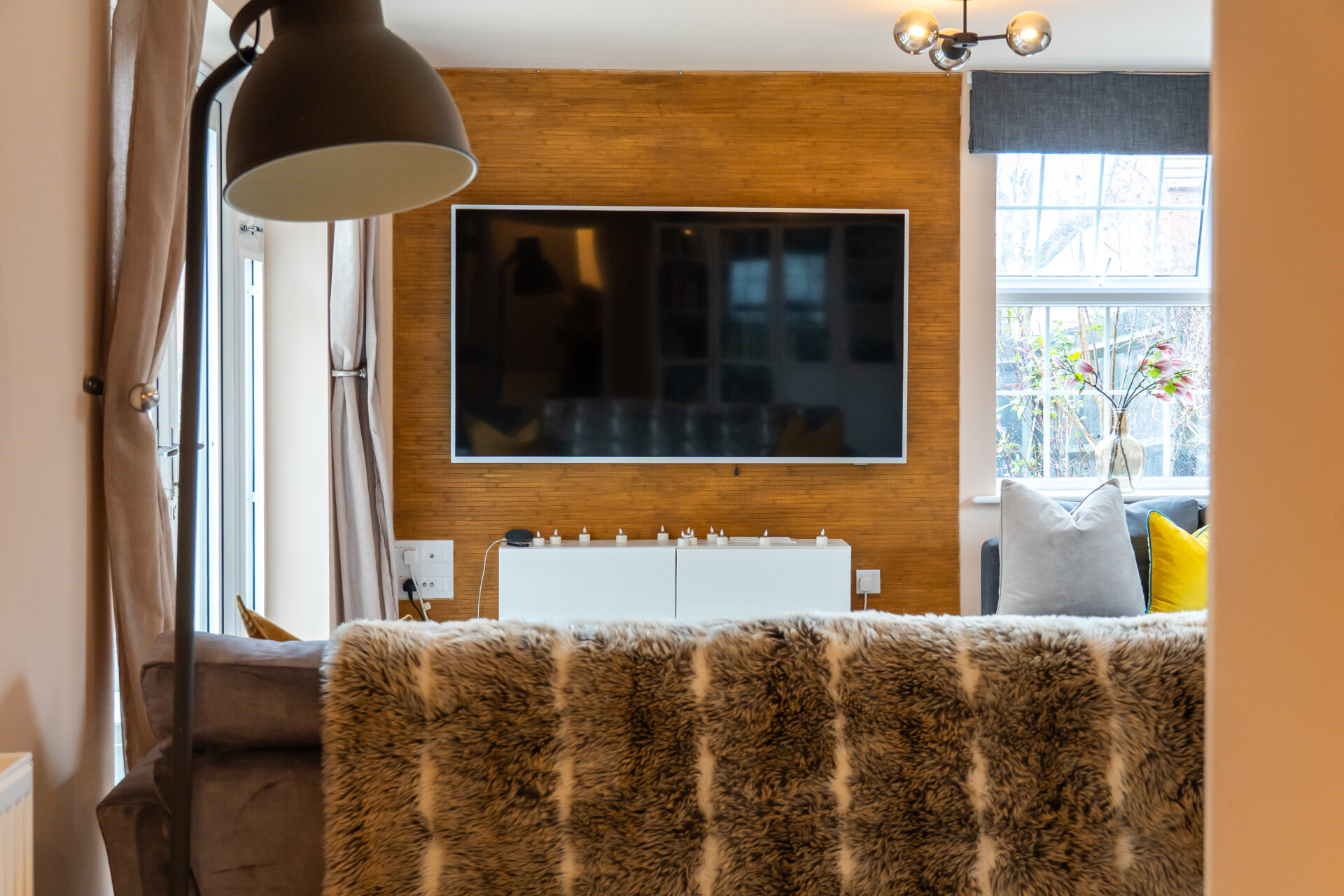 The lounge is another highlight, filled with natural light thanks to triple-aspect windows and a further set of French doors leading out to the garden, creating a seamless connection between indoor and outdoor living.