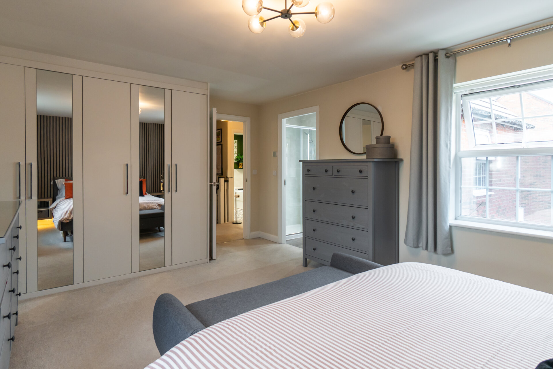 Upstairs, the first floor hosts four generous double bedrooms, offering excellent proportions rarely found in modern homes. The principal bedroom enjoys double-aspect windows that flood the room with natural light, along with fitted wardrobes and a private ensuite shower room. The remaining bedrooms are served by the family bathroom.