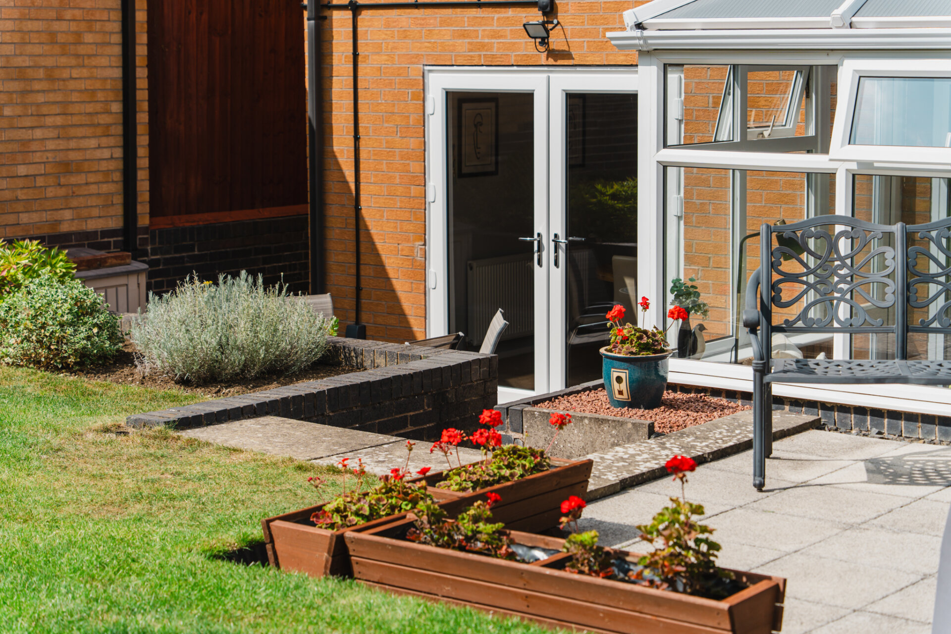 Outside, the property sits behind a neat lawn frontage with a paved driveway providing parking for up to two cars and access to the garage via an up-and-over door. The rear garden is a real highlight – private, south-facing, and thoughtfully landscaped. Two patio terraces sit either side of the conservatory, offering perfect spots for al fresco dining or relaxing with a book, while the central lawn is framed by well-established borders full of shrubs and seasonal planting, giving colour and interest throughout the year.