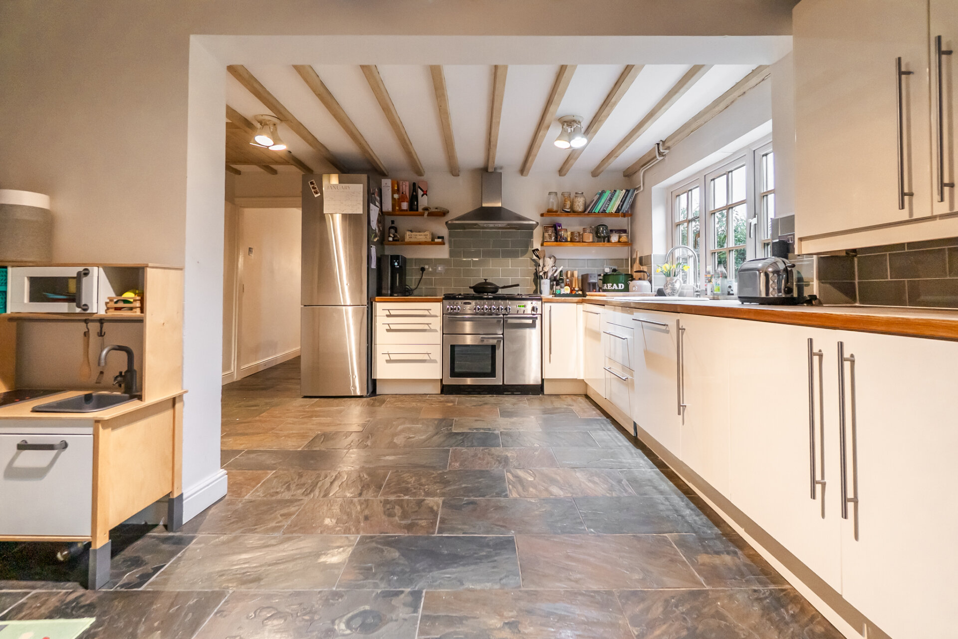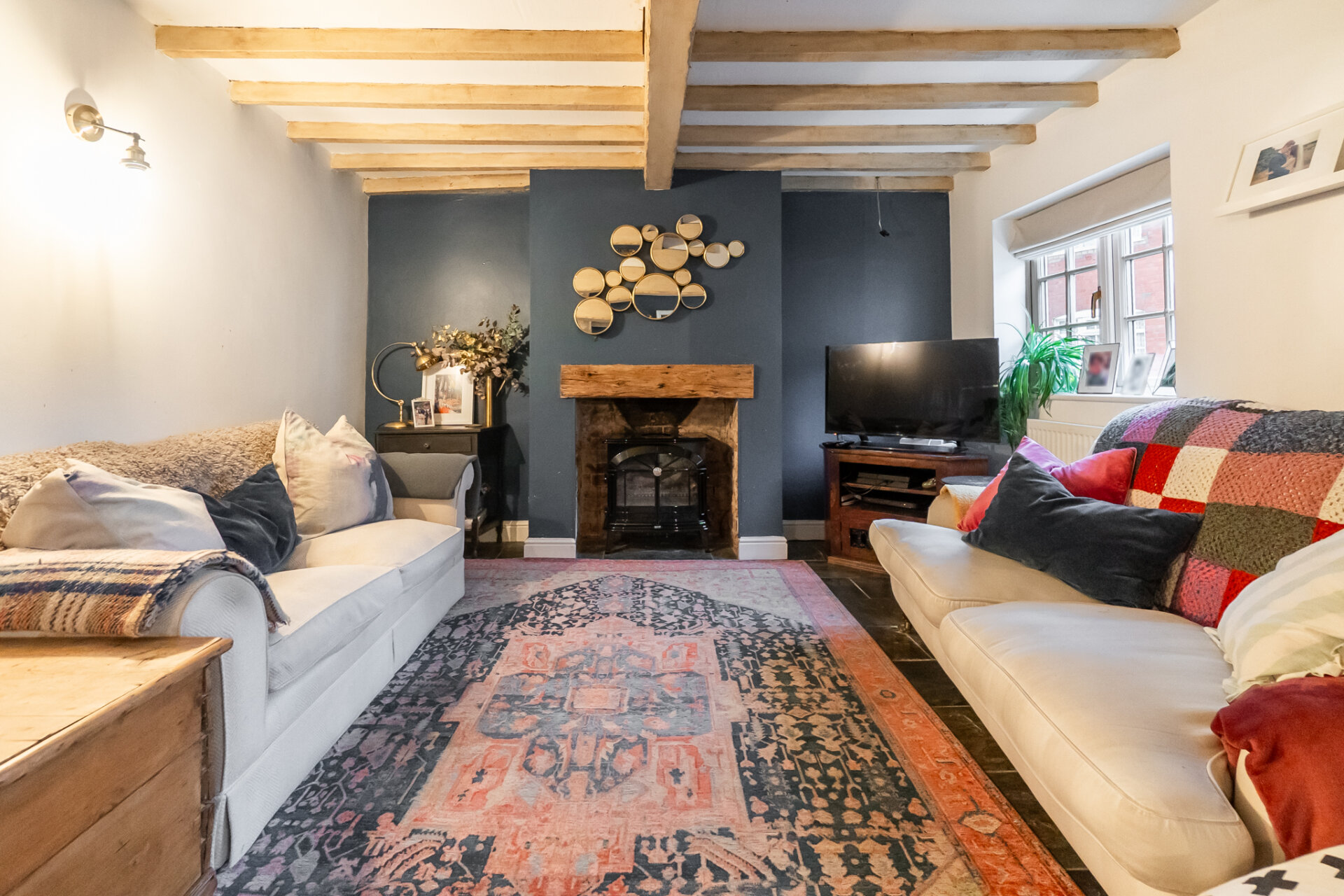 Dating back to 1777, this charming four-bedroom cottage is set within a conservation area in the heart of Enderby and beautifully balances historic character with modern efficiency. The home is presented in excellent condition throughout, with period features including exposed beams and fireplaces lending warmth and authenticity at every turn. A welcoming entrance hallway leads through to a spacious dining kitchen, while the reception rooms wrap around to the front of the house, offering cosy, inviting spaces ideal for both everyday living and relaxed entertaining. Additional storage is provided by a cellar and a brick-built outhouse found leafy south-east facing garden which is accessed via a stable-style door from the kitchen. Upstairs, four well-proportioned bedrooms are served by a striking four-piece family bathroom, complete with a freestanding bath, while built-in wardrobes feature in two of the rooms. Rarely do homes of this age offer such a thoughtful blend of charm, comfort and efficiency in such a desirable setting.