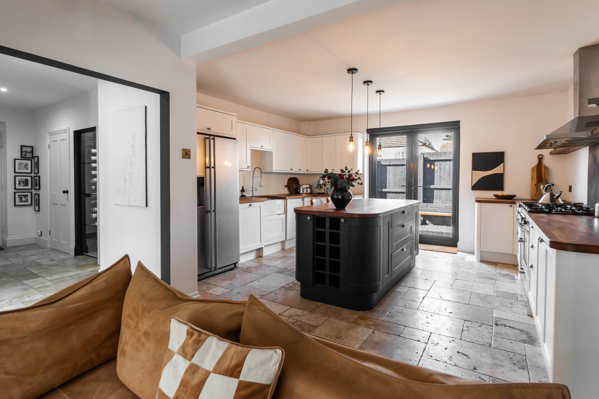 The kitchen and living area form a single open-plan space at the heart of the ground floor. The kitchen features a large island with integrated storage and seating for two, a Rangemaster double chrome oven, space for an American-style fridge freezer, and a washer dryer. A new dishwasher is to be installed prior to completion. The living area is separated from the kitchen by a large corner sofa and includes an electric built-in fireplace with adjustable colour settings. All bifold and patio doors are fitted with Fraser James black electric remote-controlled blinds.