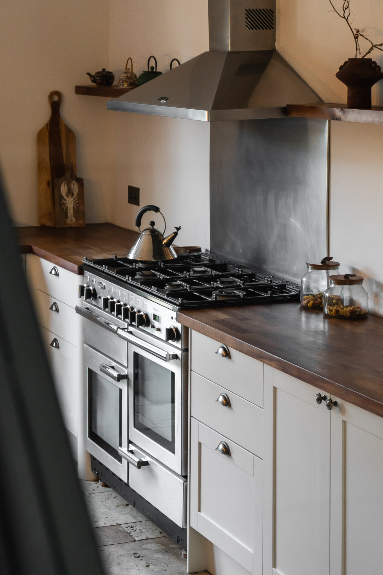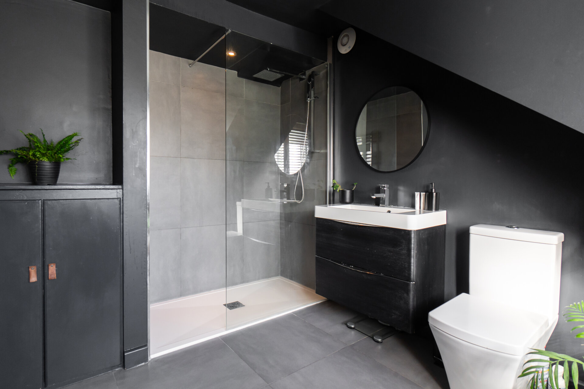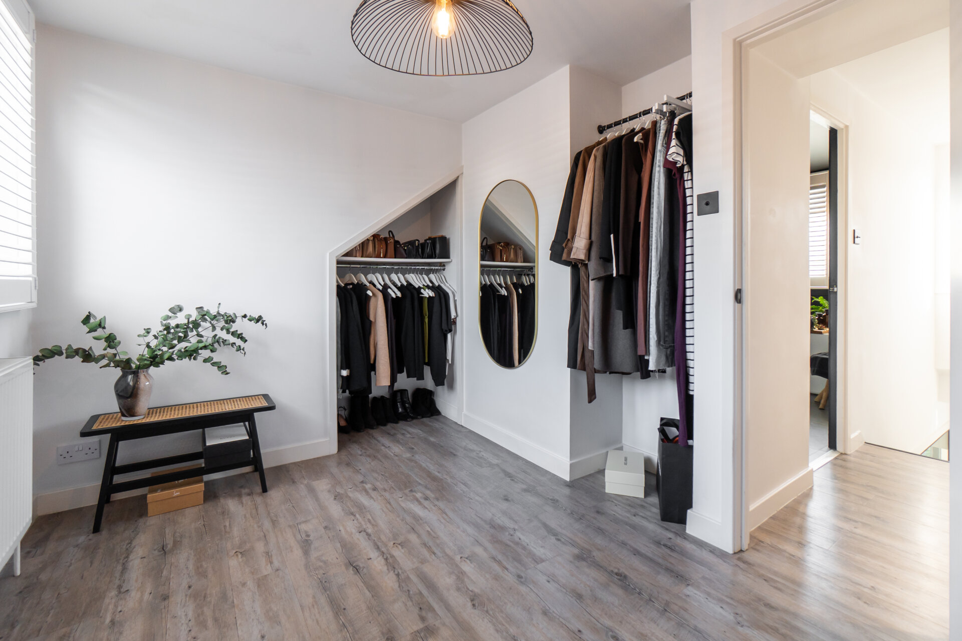 • Bespoke storage wall in dining room concealing boiler, coats, and shoe storage
