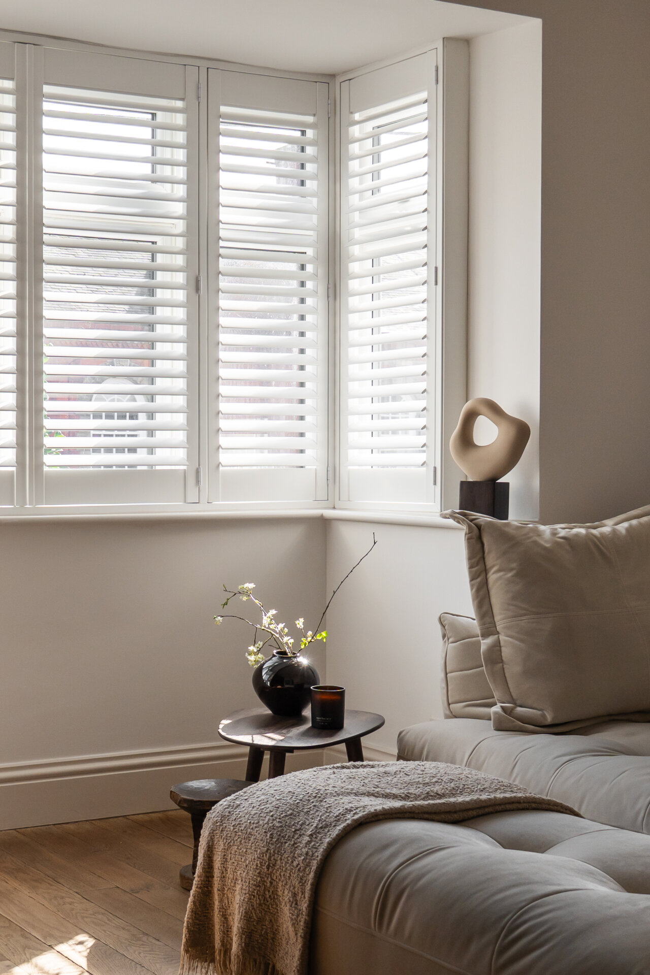 The first floor landing provides access to three bedrooms and the family bathroom. The main bedroom is a well-proportioned room to the rear. Bedrooms two and three sit to the front. All upstairs windows are fitted with Fraser James wooden shutters, and the flooring throughout is Karndean Van Gogh — a hard-wearing luxury vinyl with a wood-effect finish. The family bathroom is a generous size with both a bath and separate shower.
