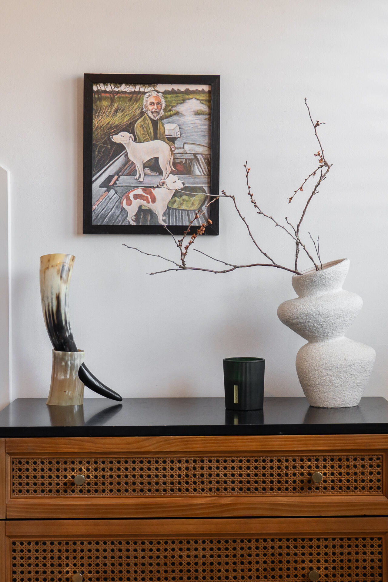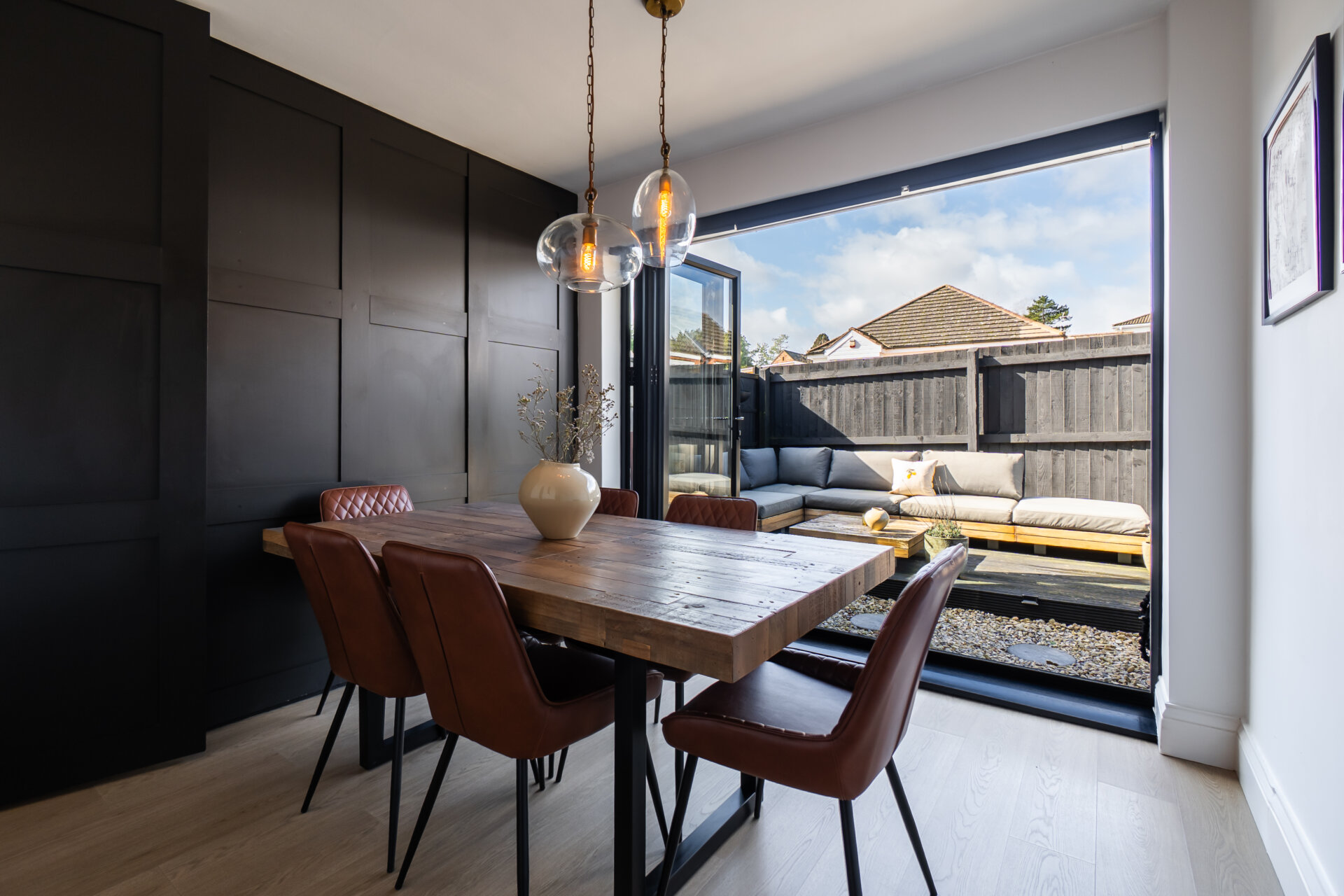 The dining room to the rear has been fitted with new black aluminium bifold doors opening directly onto the rear decking, with the indoor-outdoor flow making this a practical entertaining space in warmer months. The room features handblown glass and brass Nkuku light fittings and a bespoke storage wall, which conceals the boiler, coat hooks, and shoe storage.