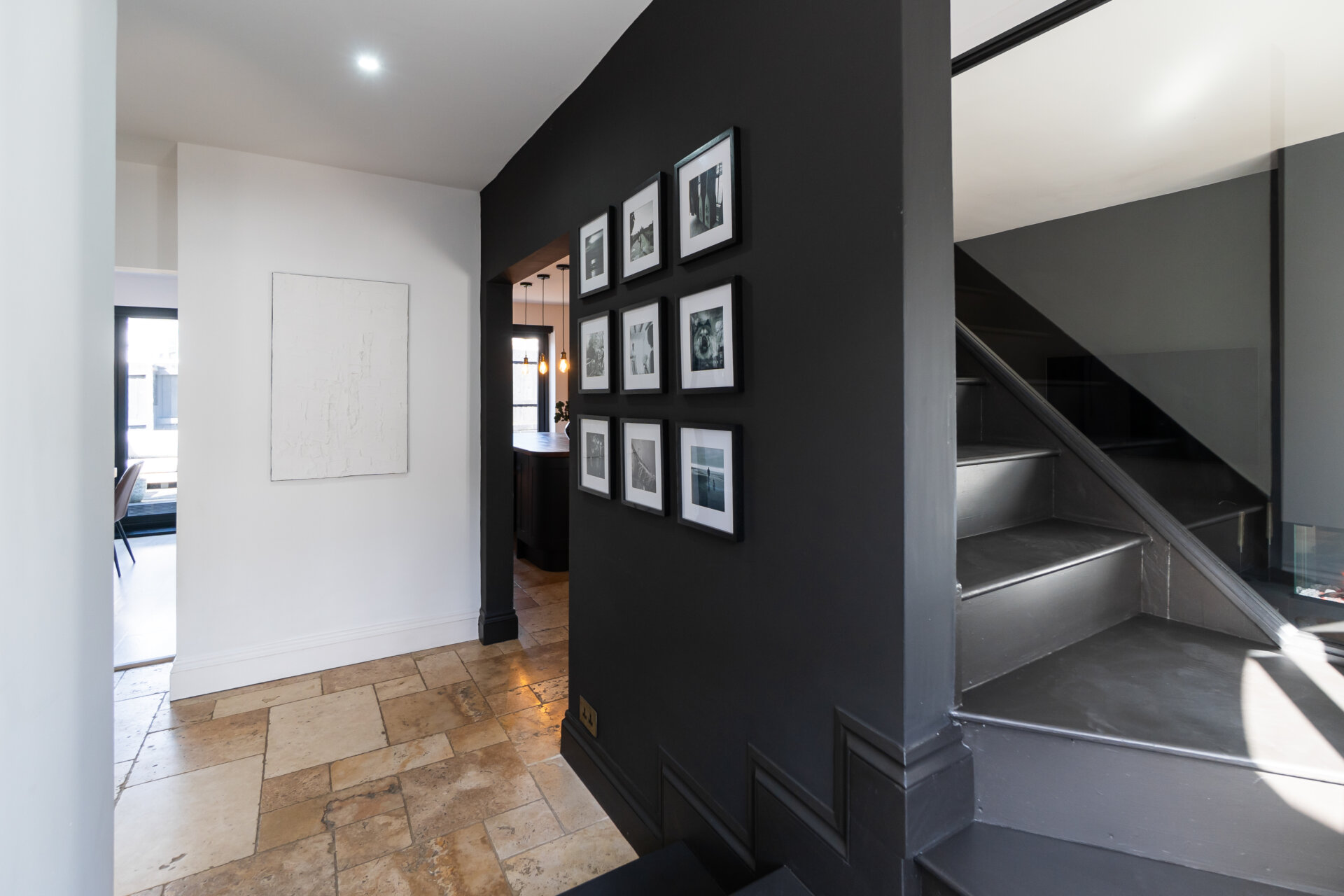 The entrance hall is a generous space, with an arched window to the front aspect and a bespoke glass stair feature wall, custom designed and installed. A ground floor WC sits off the hall, along with a purpose-built wine room with glass doors — a notable feature positioned at the entrance.