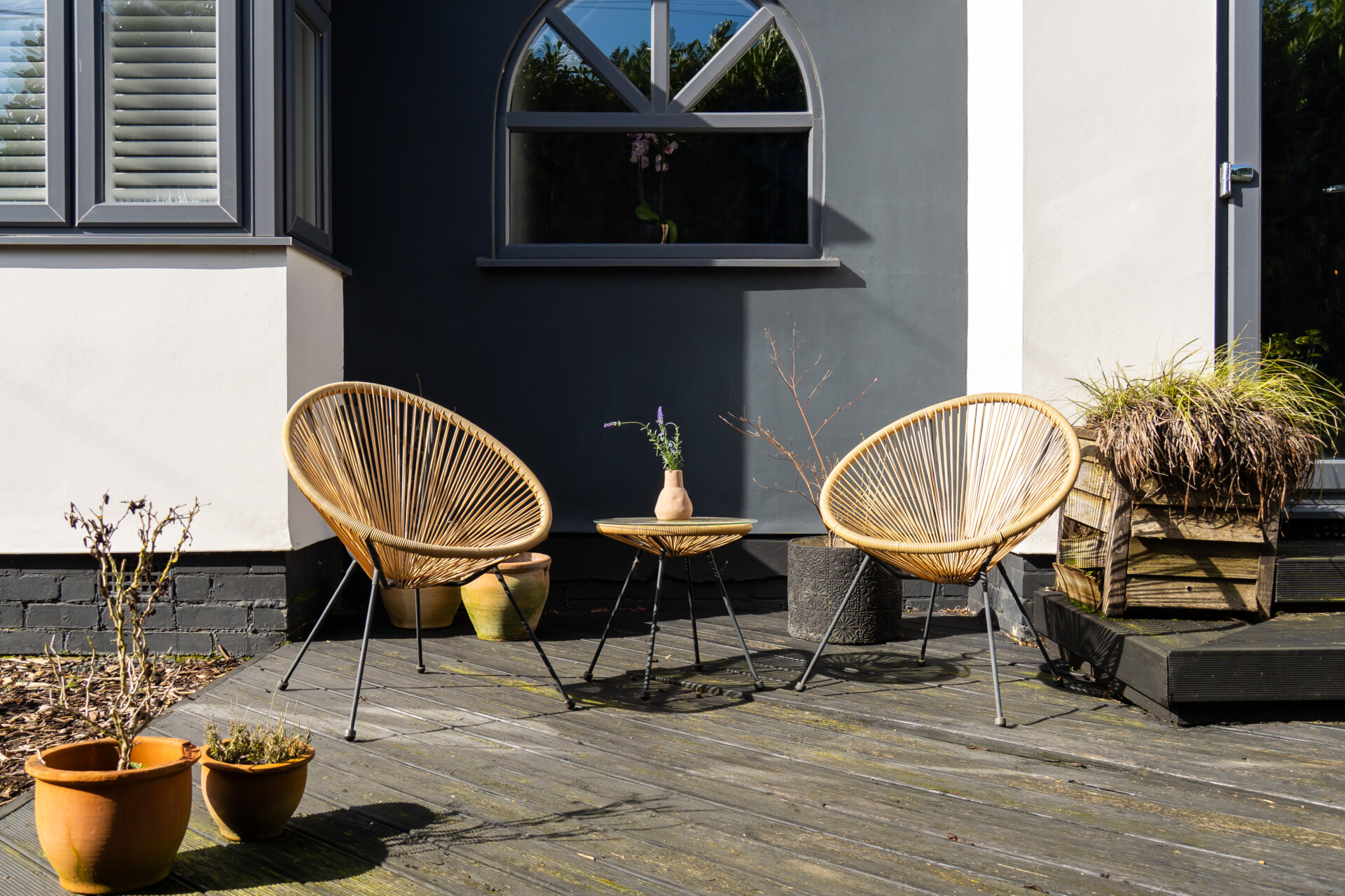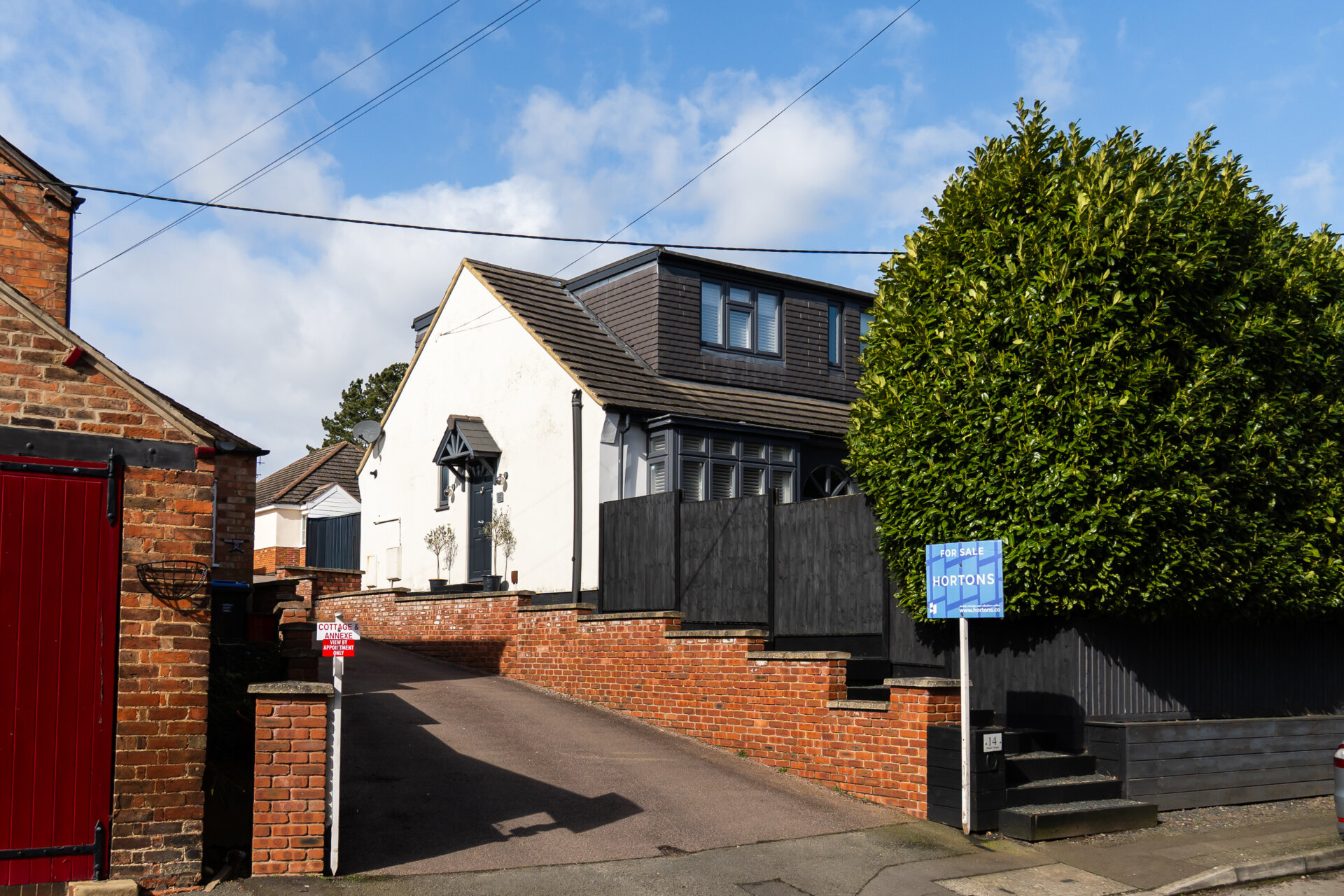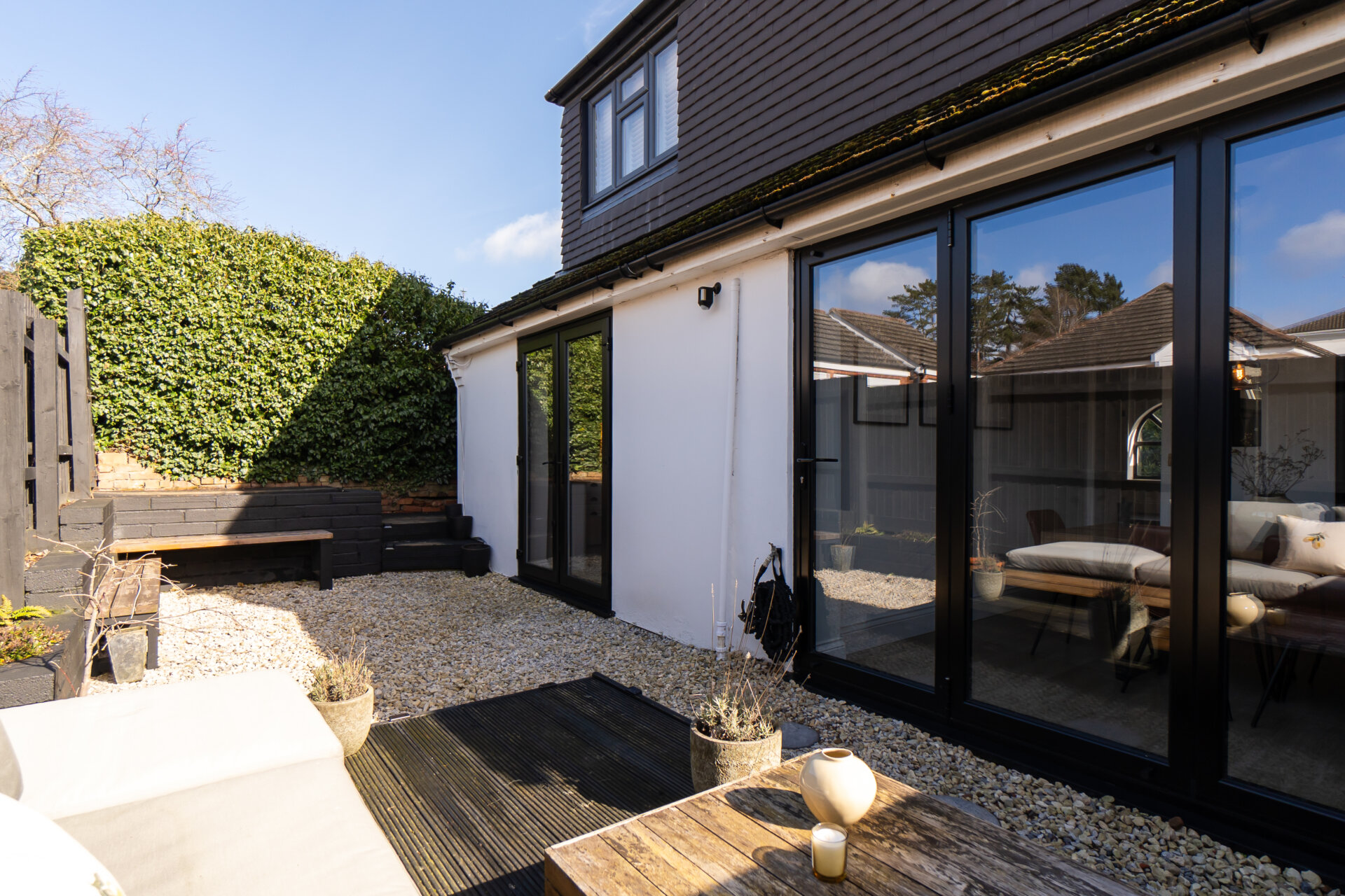 To the side is a shared driveway leading to parking for two vehicles. To the rear, the landscaped garden includes a decked terrace directly accessible from the dining room bifold doors, with shrub borders and a mix of seating and decorative stone areas.