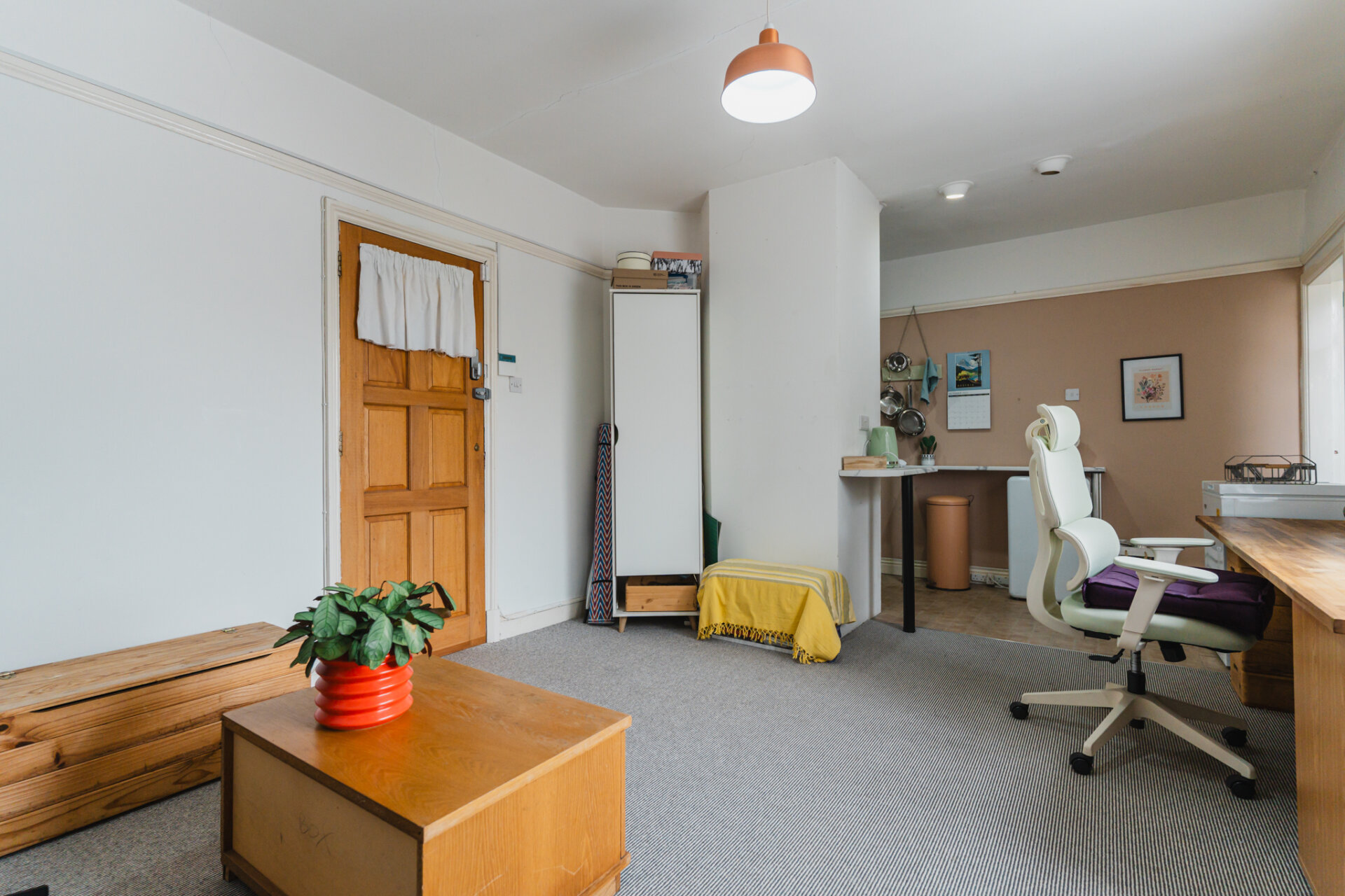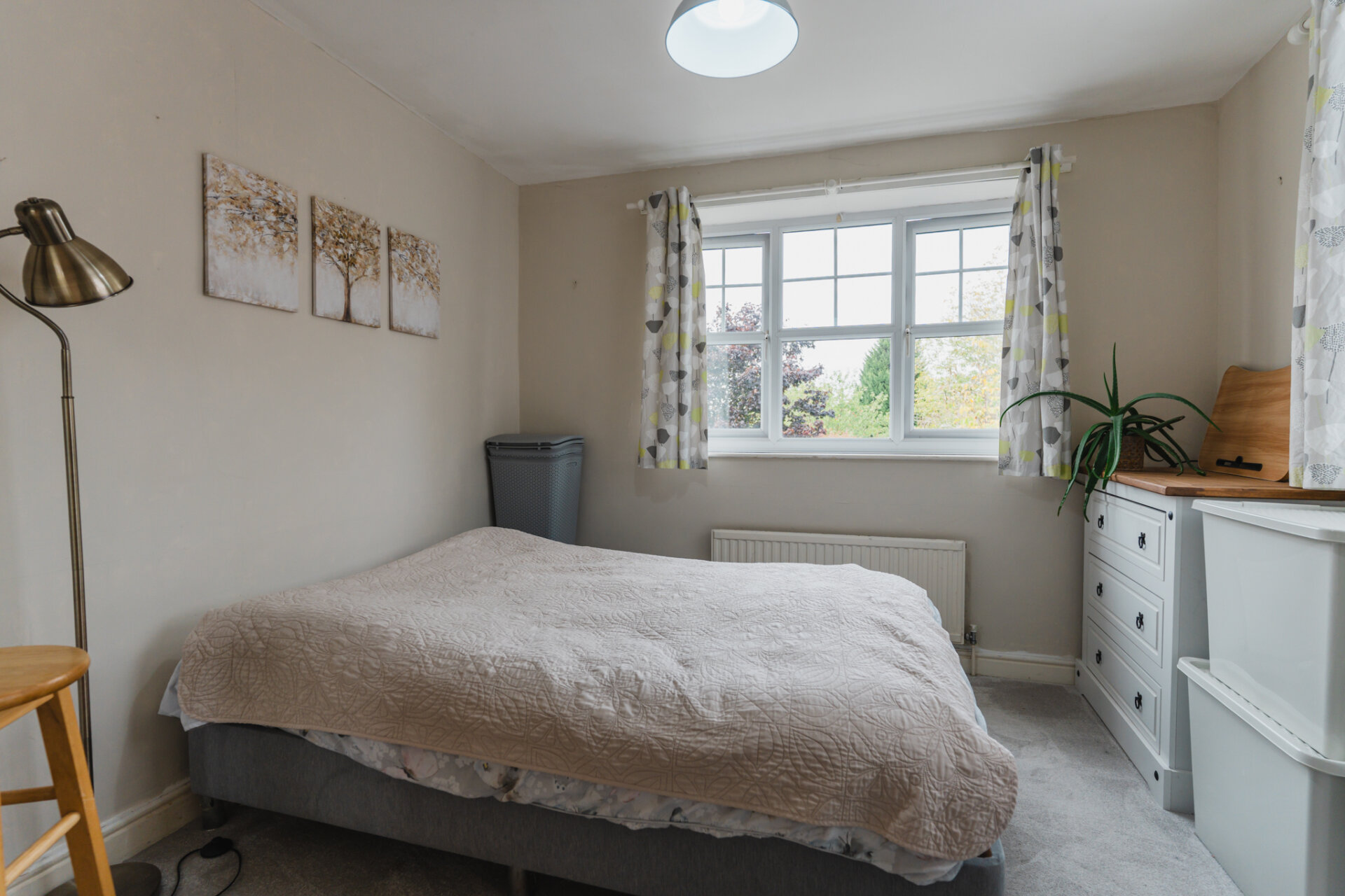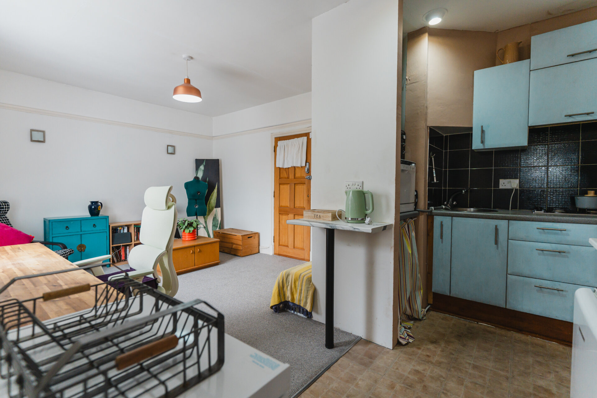 The open-plan living and kitchen area creates a welcoming space with a natural flow — perfect for everyday living and entertaining. The kitchen is neatly integrated, while the generous lounge area enjoys ample natural light overlooking the rear communal garden. Tucked away at the rear, the spacious double bedroom benefits from dual-aspect windows overlooking mature greenery, creating a serene retreat filled with daylight. A clean and functional three-piece bathroom suite completes the interior, offering both comfort and practicality.