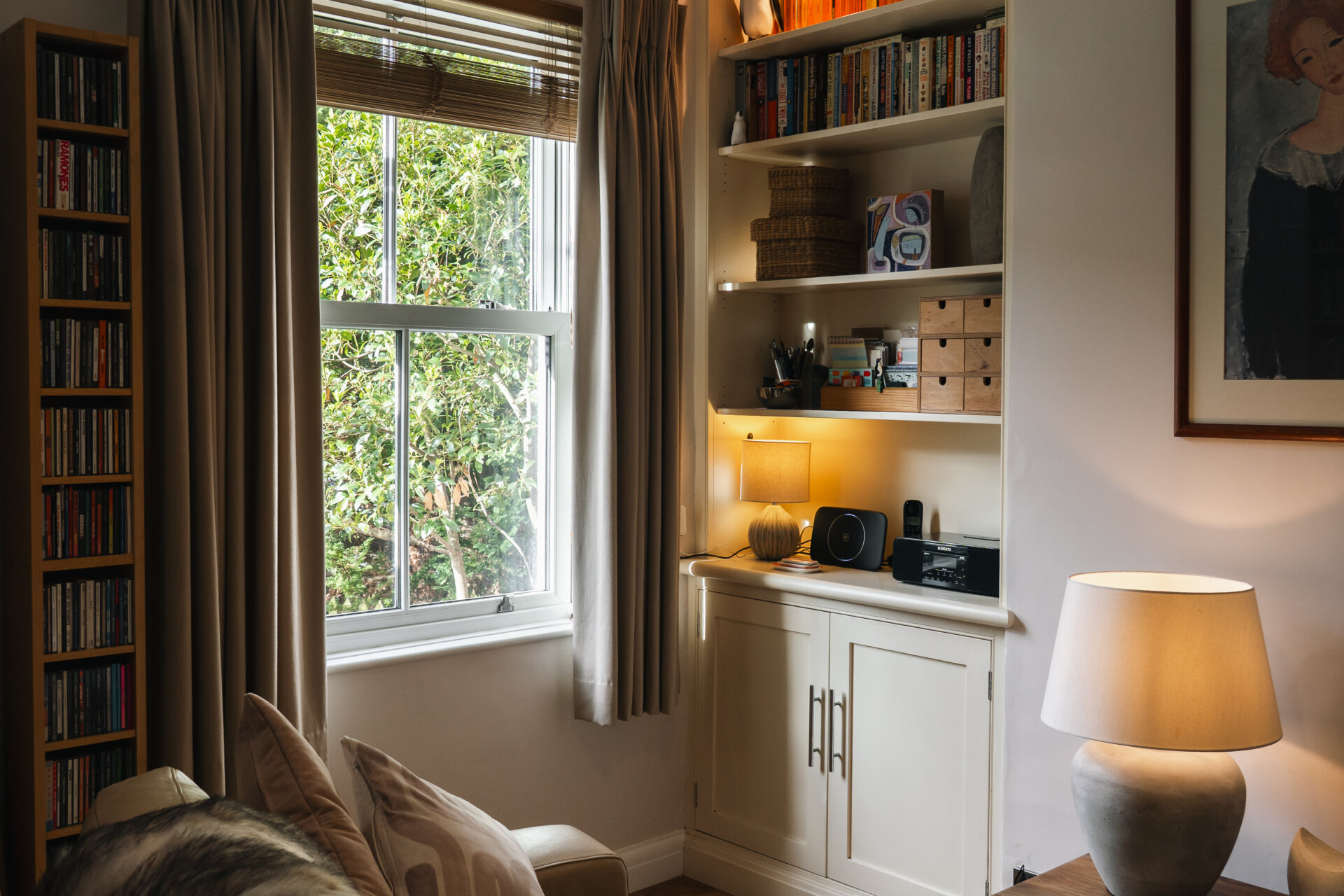 Inside, the interiors unfold with a calm, coherent rhythm. A wonderfully light reception room occupies the front of the plan, anchored by elegant double-glazed sash windows that frame soft views of the street. Wooden flooring runs underfoot, complementing a neutral palette that enhances the sense of space and serenity. Every detail has been carefully considered, with storage and layout designed to maximise comfort and functionality.