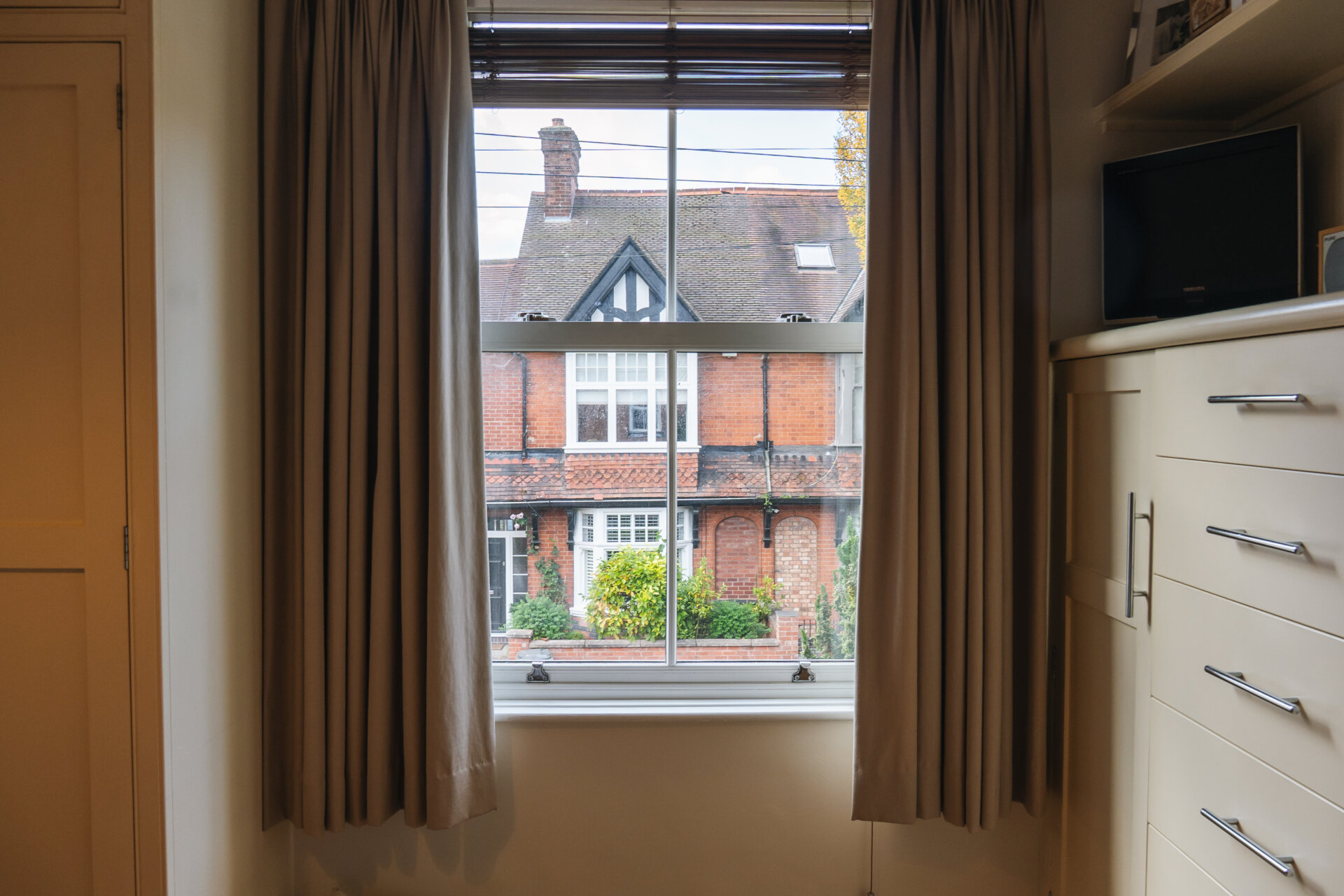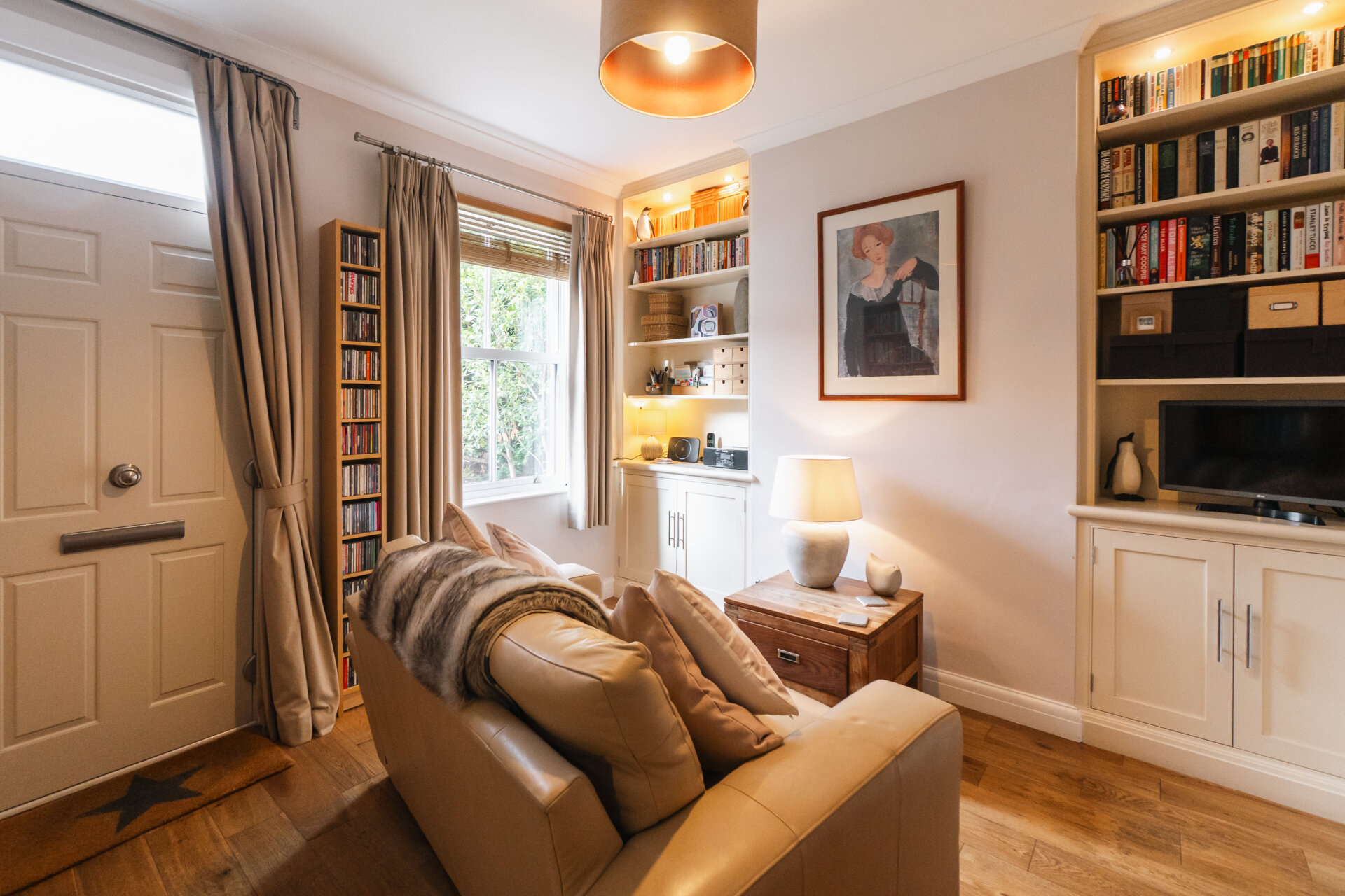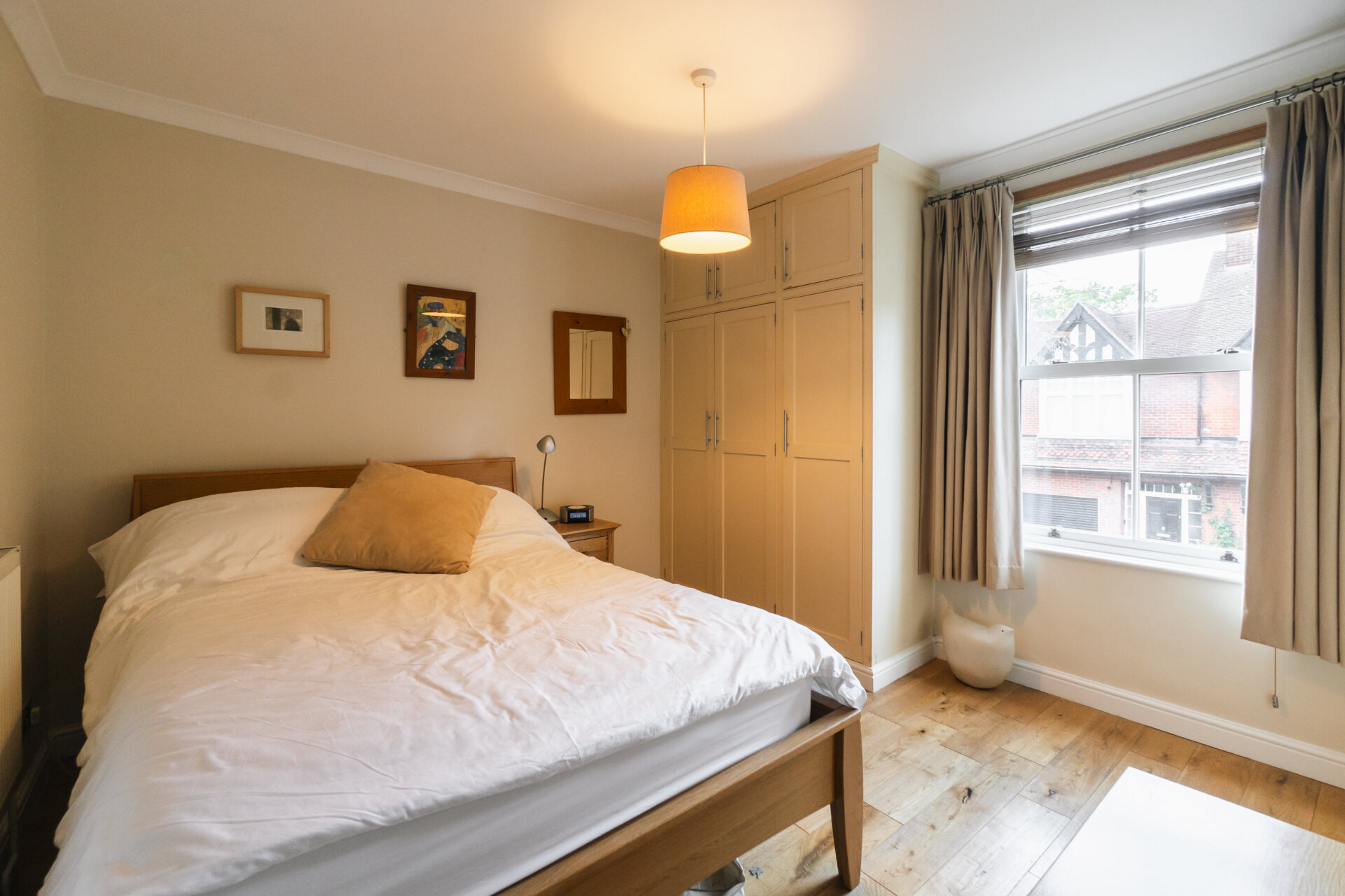 Inside, the interiors unfold with a calm, coherent rhythm. A wonderfully light reception room occupies the front of the plan, anchored by elegant double-glazed sash windows that frame soft views of the street. Wooden flooring runs underfoot, complementing a neutral palette that enhances the sense of space and serenity. Every detail has been carefully considered, with storage and layout designed to maximise comfort and functionality.