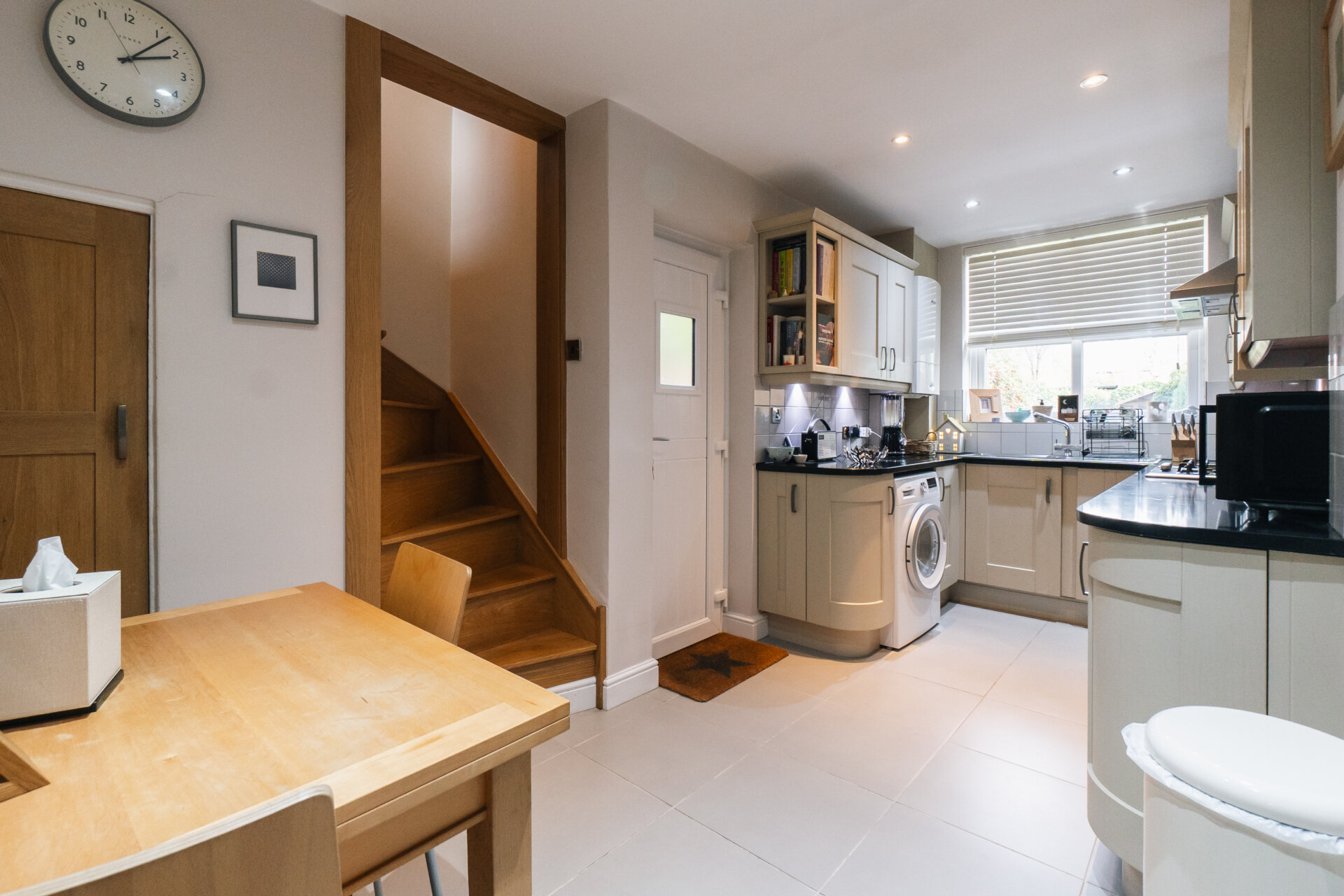 To the rear, a set of stripped oak doors opens into an extended breakfast kitchen overlooking a beautifully mature garden. Here, generous counter space and fitted cabinetry combine with an integrated fridge, a four-ring gas cylinder hob, and additional space for appliances. A separate pantry is neatly tucked away, while a uPVC door offers direct access to the garden. A staircase leads elegantly to the first floor.