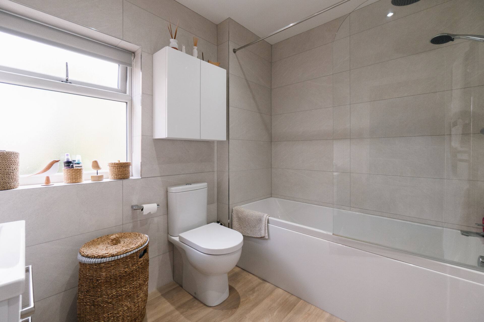 Upstairs, the double bedroom is both bright and tranquil, complete with fitted wardrobes and double-glazed sash windows. It is served by a modern three-piece bathroom finished in crisp, contemporary tones. The loft above is insulated and part-boarded, providing valuable additional storage.