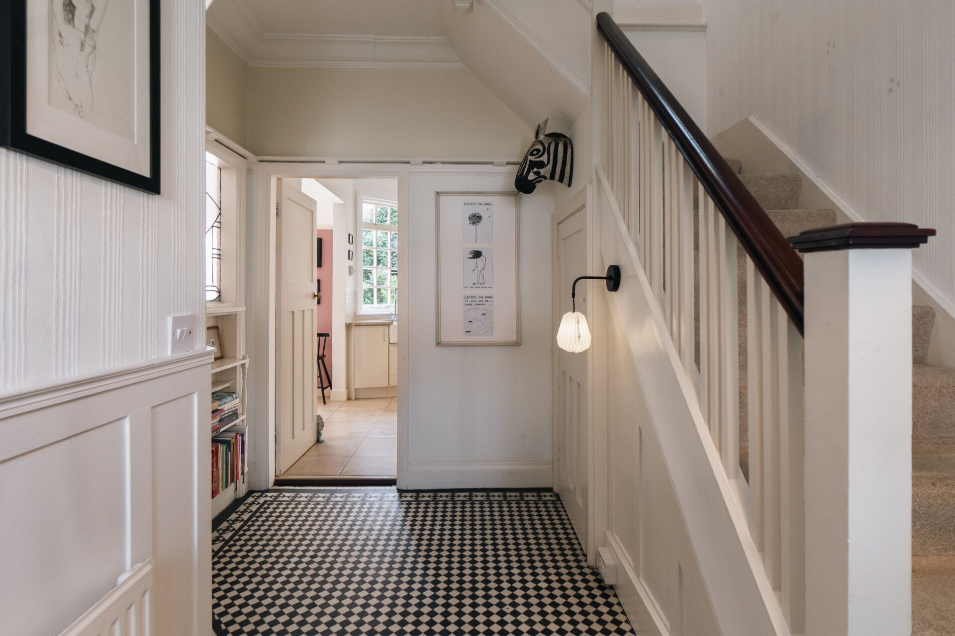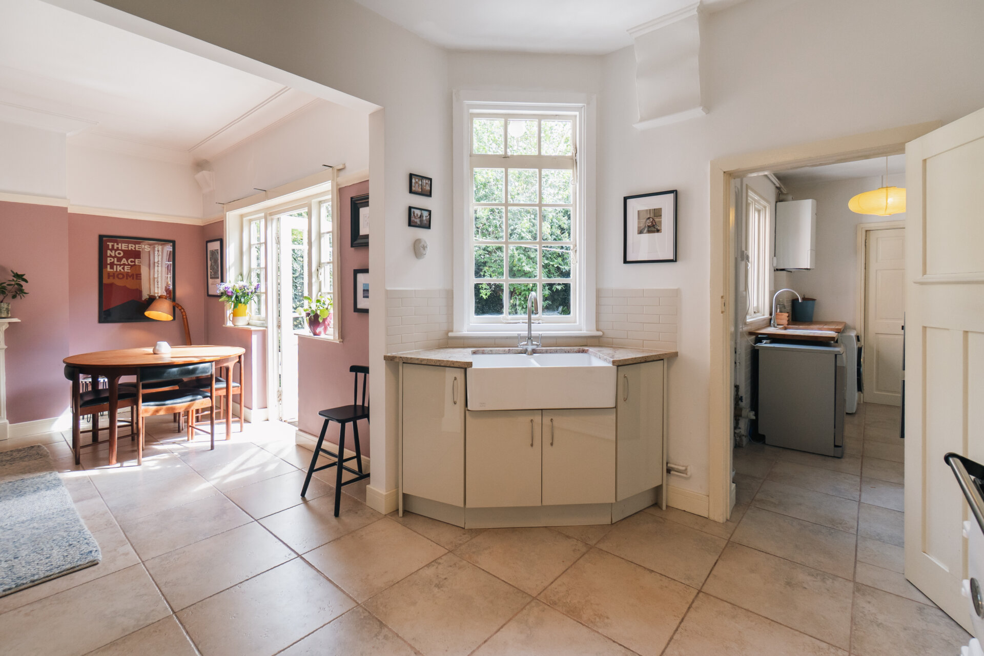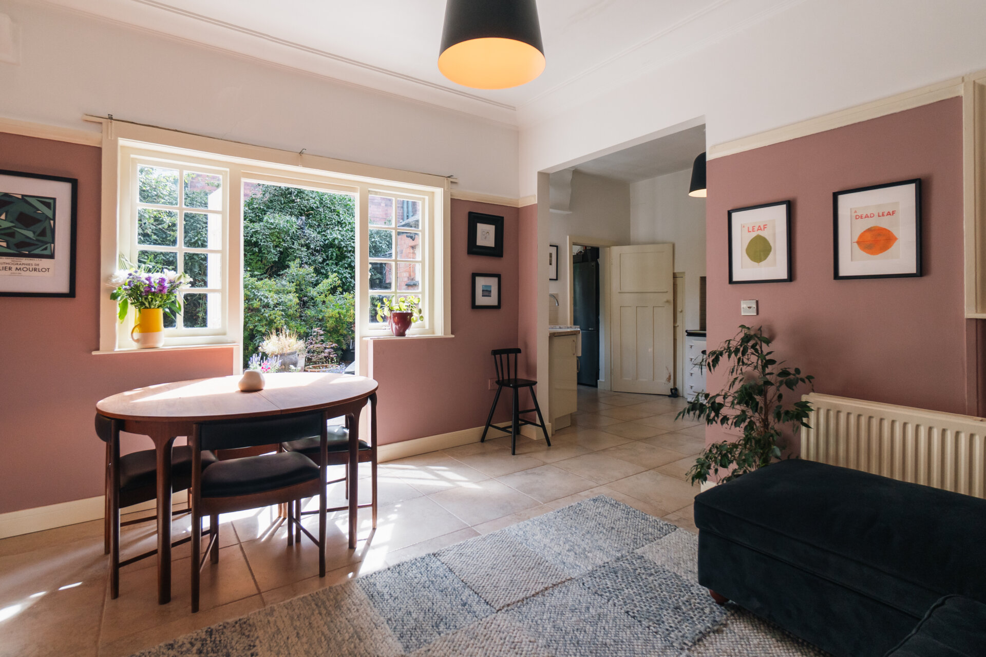 The entrance hall sets the tone with a striking black-and-white Minton tiled floor. To the front, the lounge is flooded with natural light from a bay window, where a gas coal-effect fire rests within an elegant surround, flanked by fitted cupboards and shelving finished in Farrow & Ball’s “Railings” complemented by stripped timber flooring. The dining room is warm and inviting, centred around a white-painted cast-iron fireplace, with original stain-leaded glass discreetly positioned. Original doors open onto the garden, framing a leafy view, while the space is finished with an eclectic dusty-pink palette. This flows seamlessly into the kitchen, where bespoke cabinetry is topped with smooth marble-like work surfaces, complemented by a Belfast sink and large Aga, creating a perfect balance of practicality and timeless style. A utility room provides extensive storage and space for white goods, along with a modern Worcester boiler, while a discreet guest WC lies to the rear completing the ground-floor accommodation.