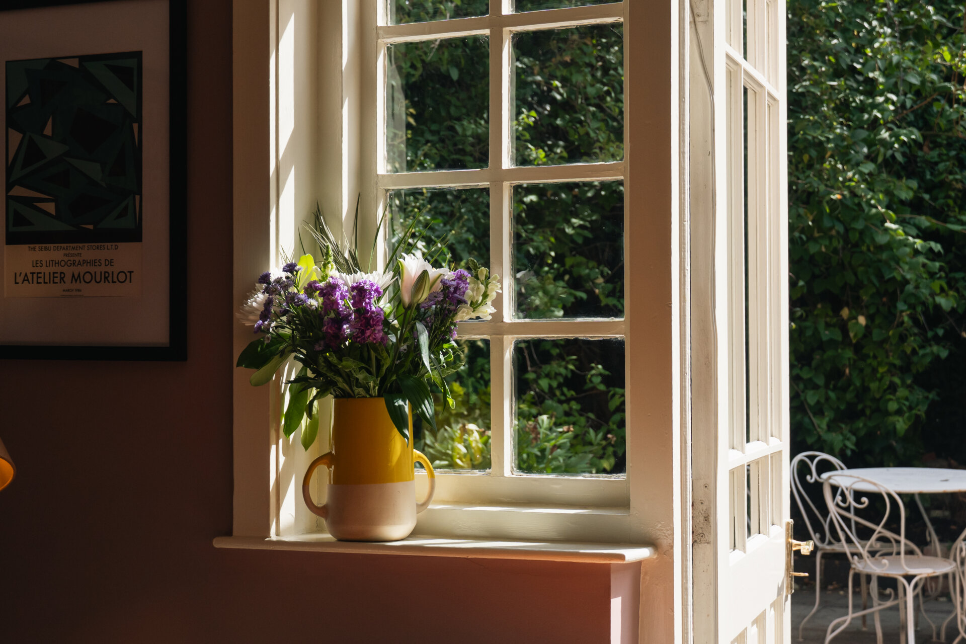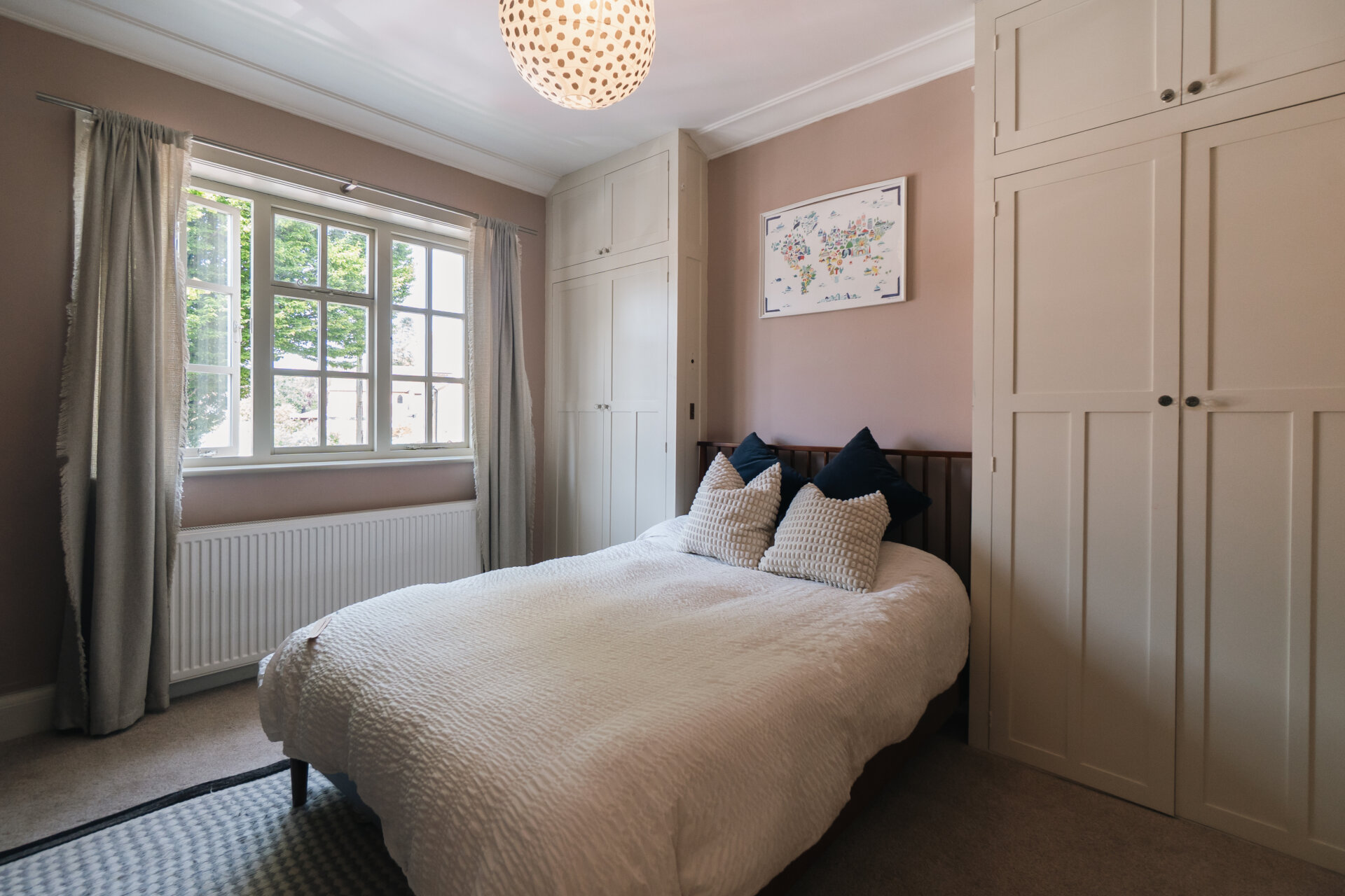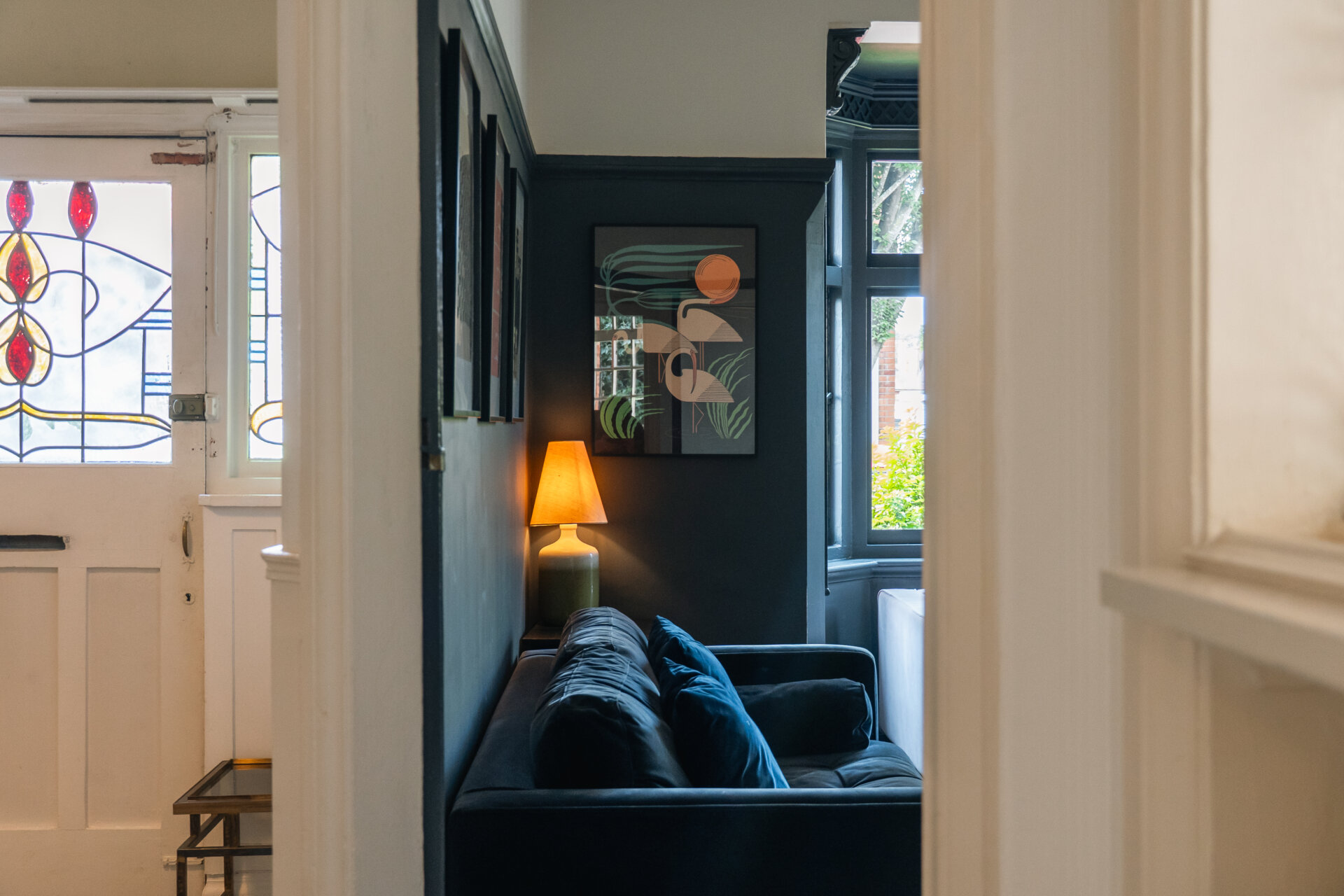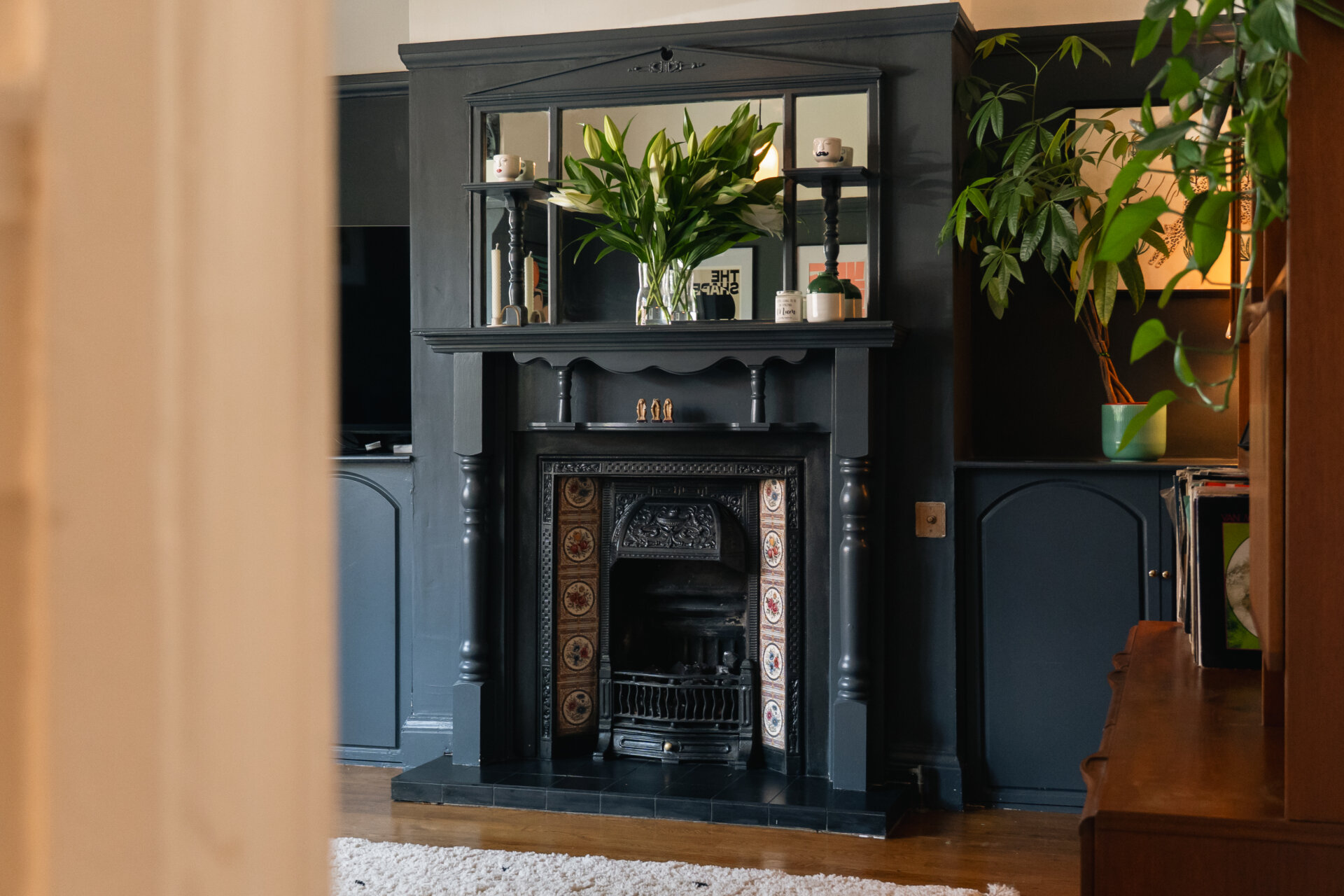 The entrance hall sets the tone with a striking black-and-white Minton tiled floor. To the front, the lounge is flooded with natural light from a bay window, where a gas coal-effect fire rests within an elegant surround, flanked by fitted cupboards and shelving finished in Farrow & Ball’s “Railings” complemented by stripped timber flooring. The dining room is warm and inviting, centred around a white-painted cast-iron fireplace, with original stain-leaded glass discreetly positioned. Original doors open onto the garden, framing a leafy view, while the space is finished with an eclectic dusty-pink palette. This flows seamlessly into the kitchen, where bespoke cabinetry is topped with smooth marble-like work surfaces, complemented by a Belfast sink and large Aga, creating a perfect balance of practicality and timeless style. A utility room provides extensive storage and space for white goods, along with a modern Worcester boiler, while a discreet guest WC lies to the rear completing the ground-floor accommodation.