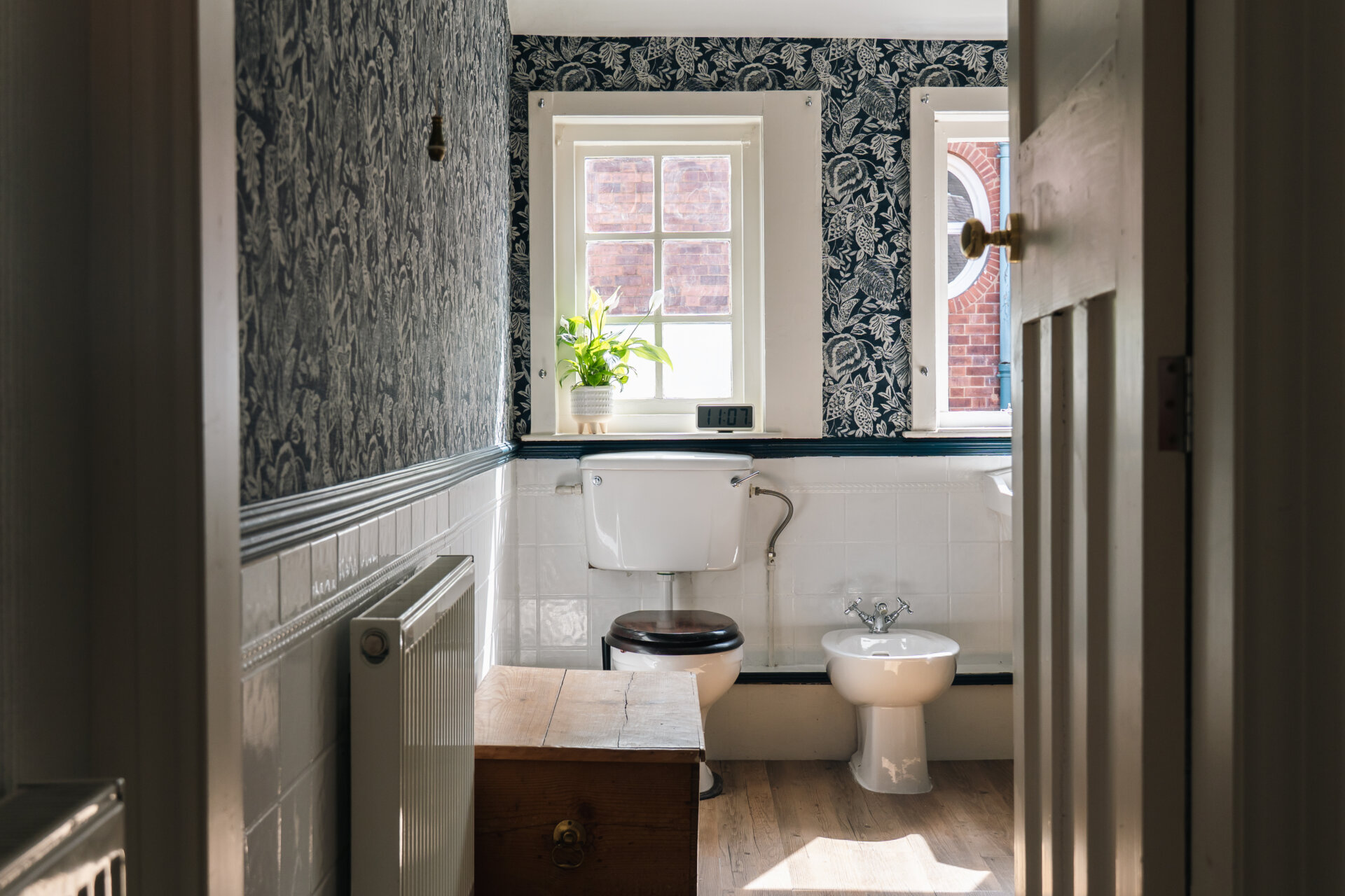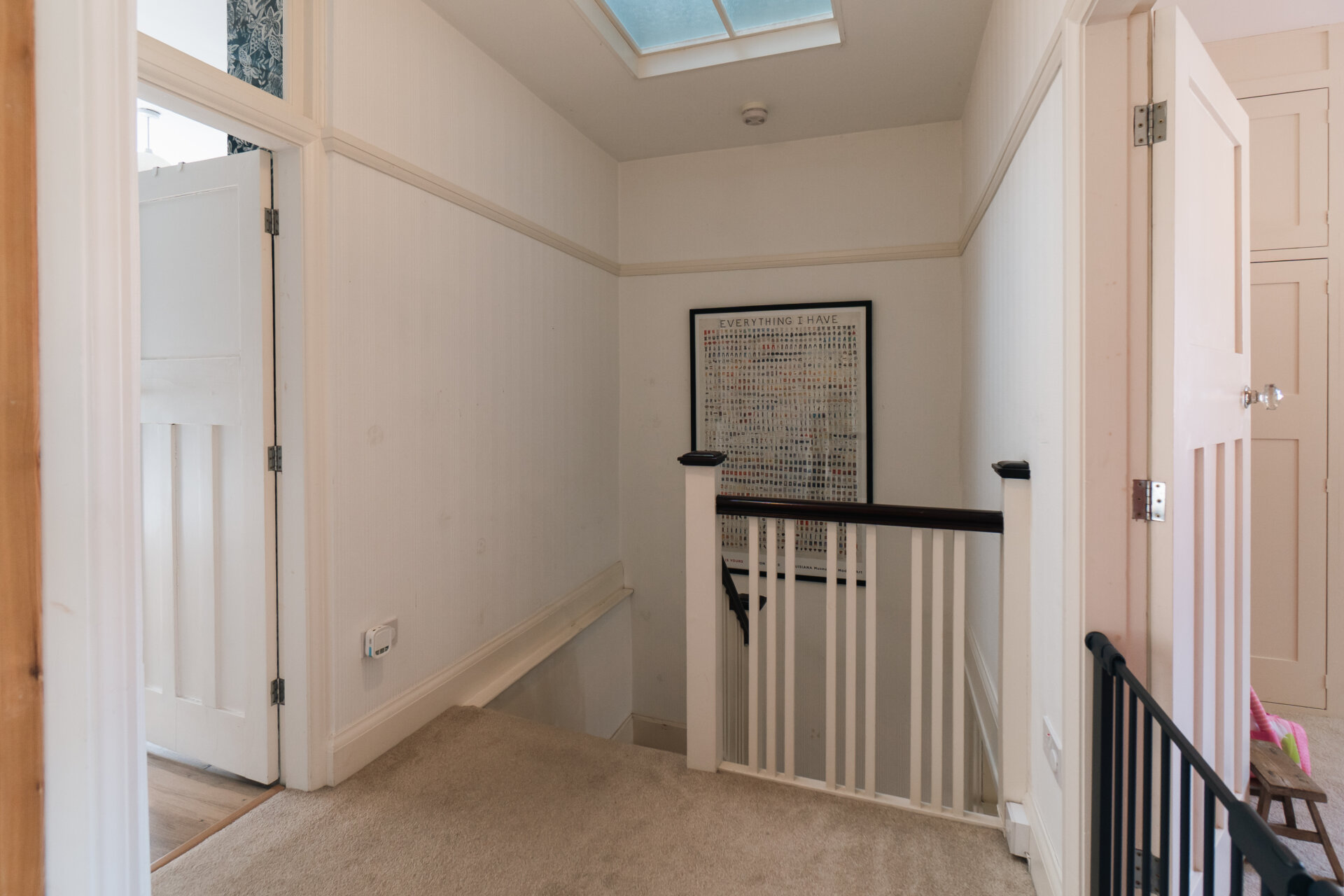 Upstairs, a wide landing leads to three well-proportioned bedrooms, each benefiting from fitted storage and ample space for essential furniture, each presented in a contemporary, modern style throughout. The bathroom is generously sized, featuring a five-piece suite with a deep bath, separate shower, bidet, and hand basin. Recent upgrades include expressive wallpaper, adding character and charm and a new-shower cubicle.