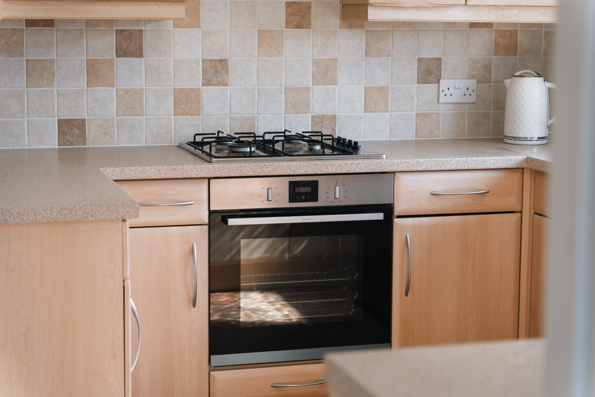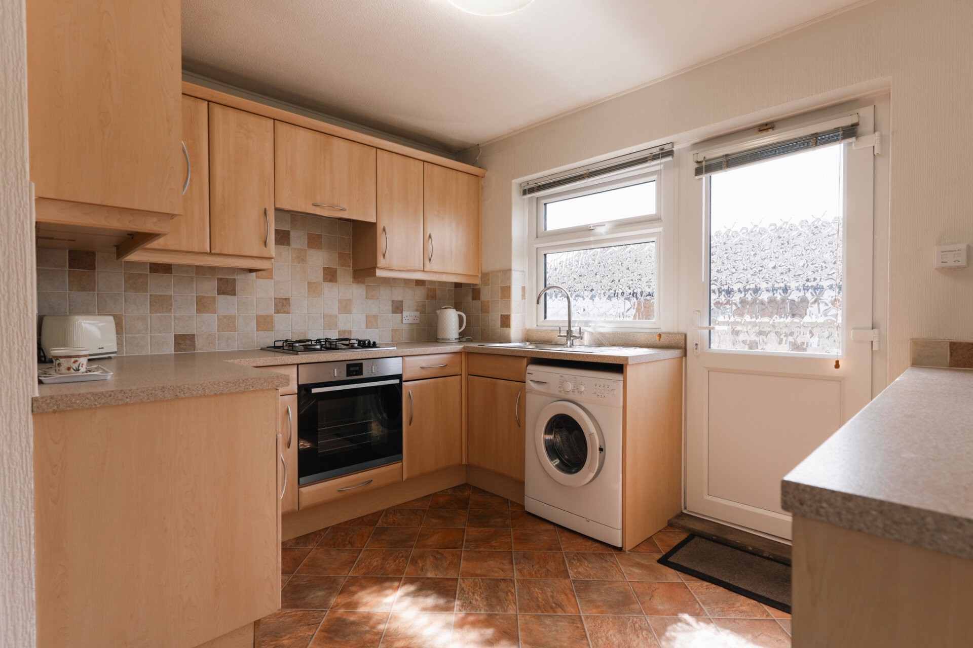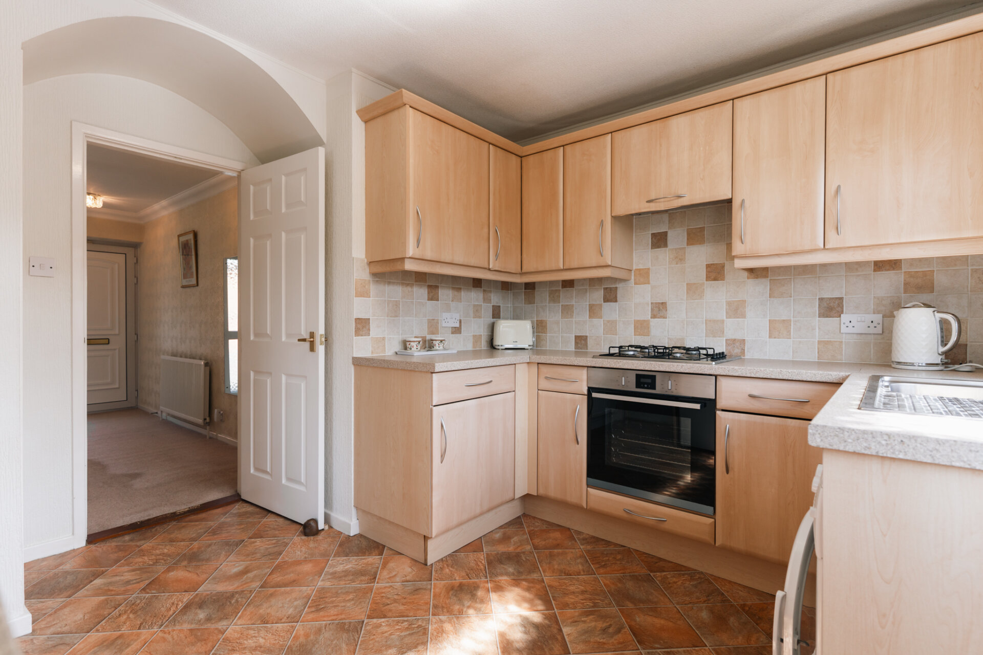 The kitchen is positioned just off the dining room and is fitted with a range of units and ample worktop space, creating a practical and functional environment for day-to-day use. With direct access to the outside, it works perfectly as it is, yet also presents an excellent opportunity for reconfiguration—whether opening up into the dining room or creating a more contemporary kitchen-dining layout.