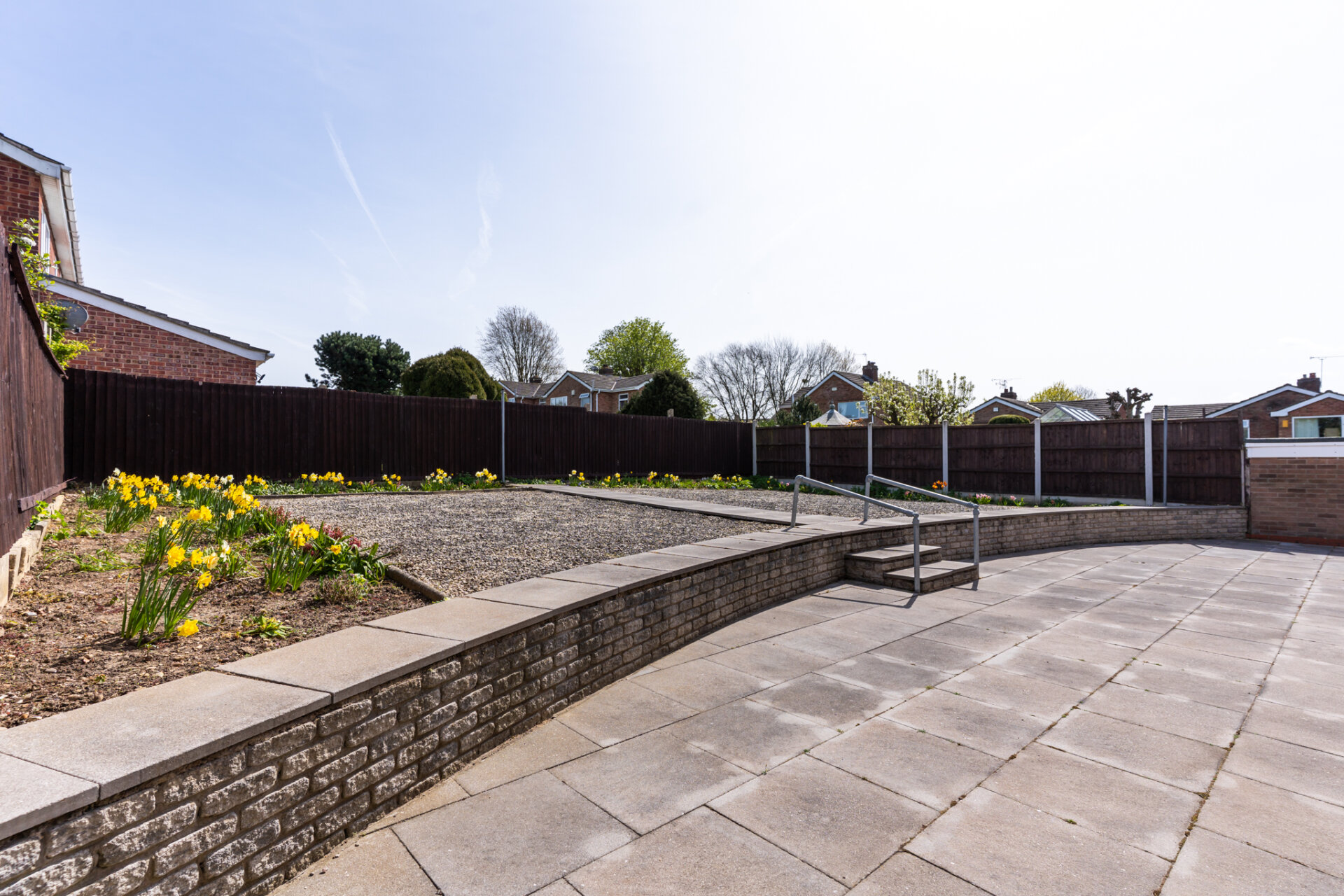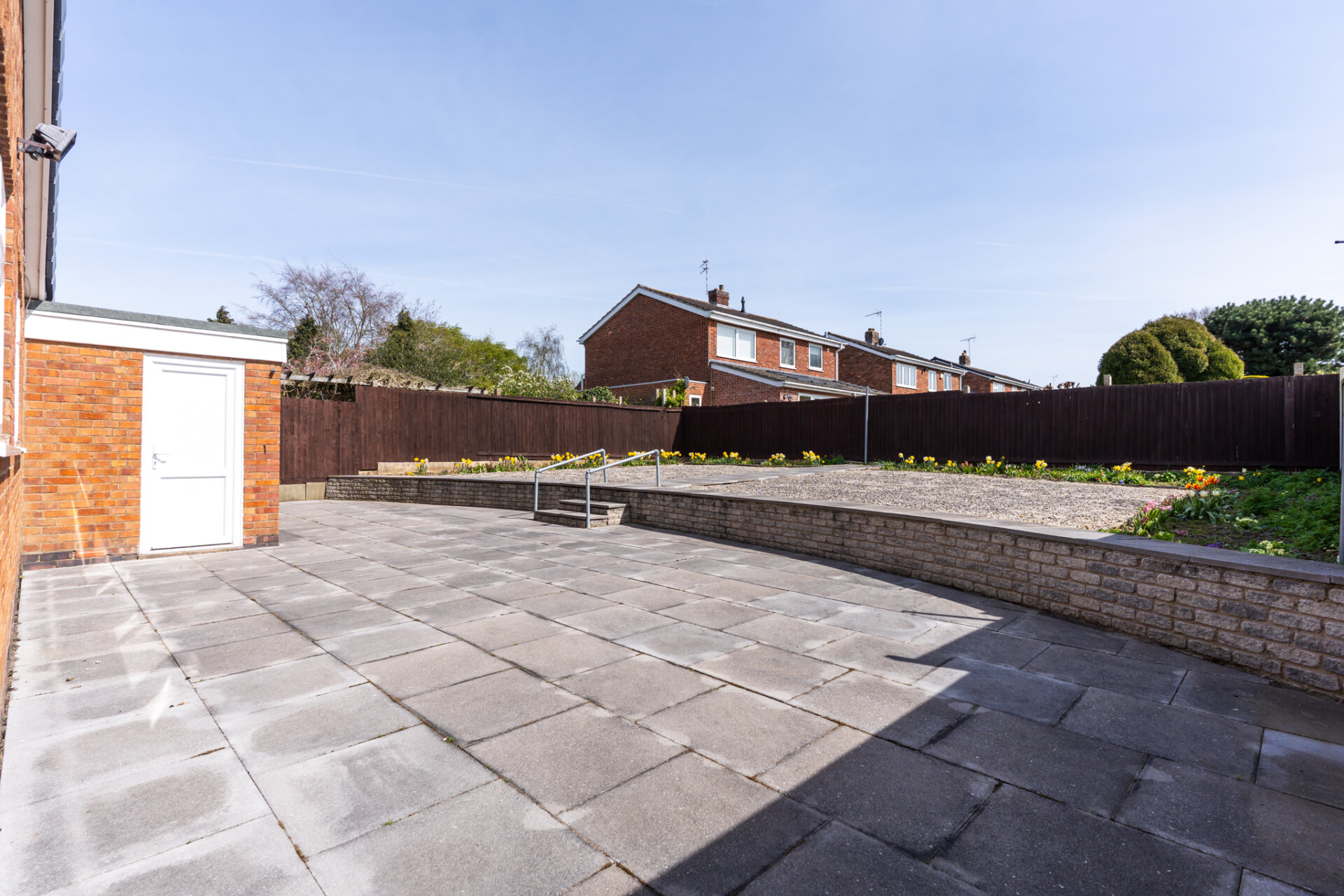 The rear garden is a standout feature—generous in size and enjoying a south-east facing aspect, it benefits from plenty of natural sunlight throughout the day. Designed with low maintenance in mind, it features a large paved terrace ideal for seating and entertaining, alongside raised sections and neatly defined borders that add interest without requiring extensive upkeep. It’s a space that offers both practicality and enjoyment, perfect for those looking to downsize without compromising on outdoor space.