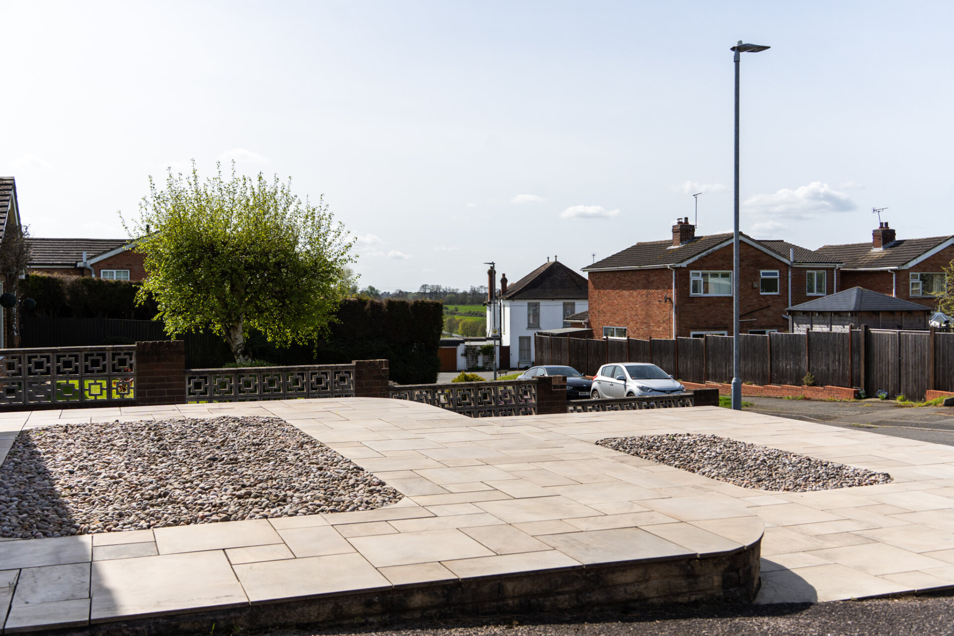 Low-maintenance outdoor space with patio and raised sections