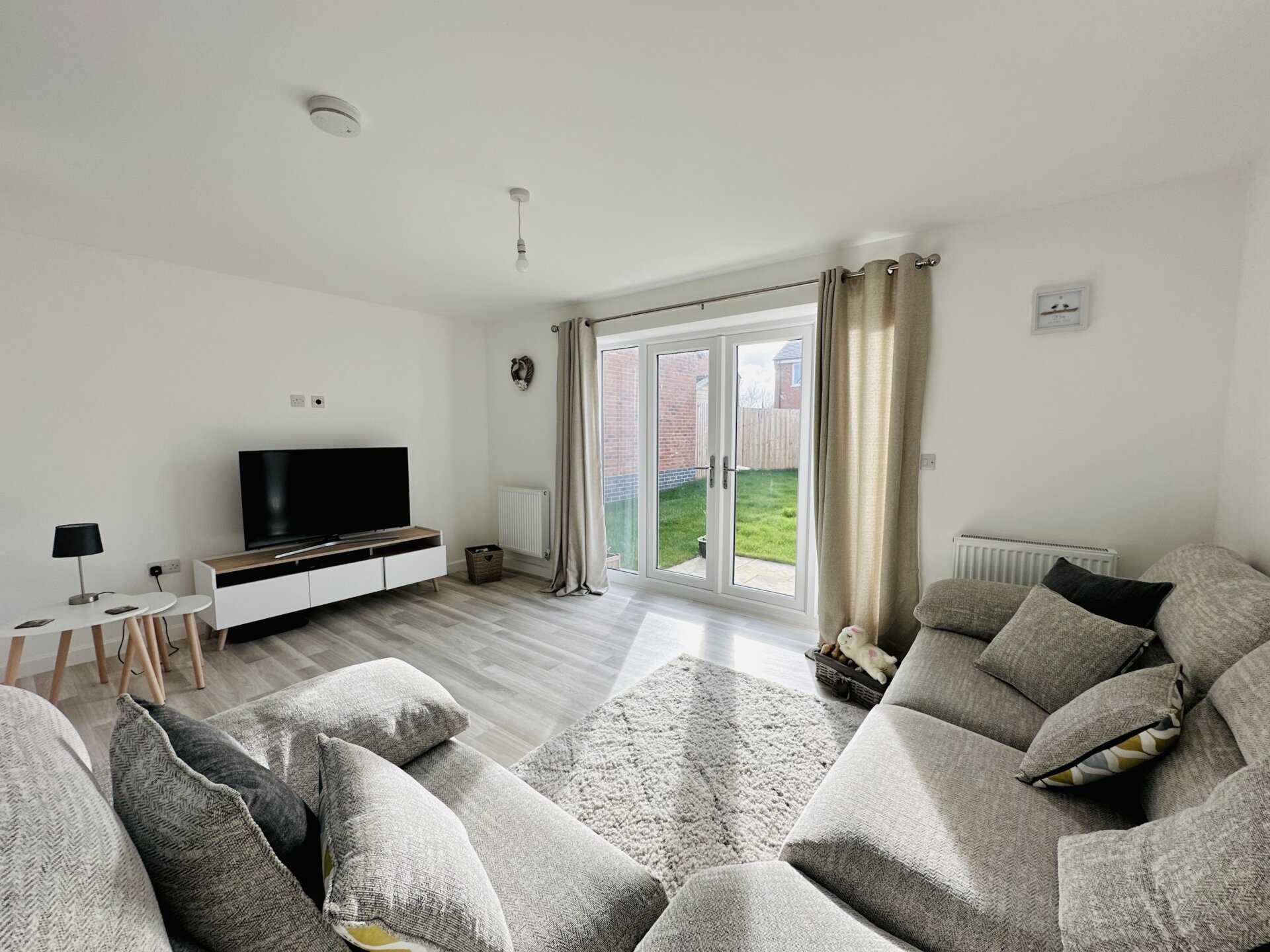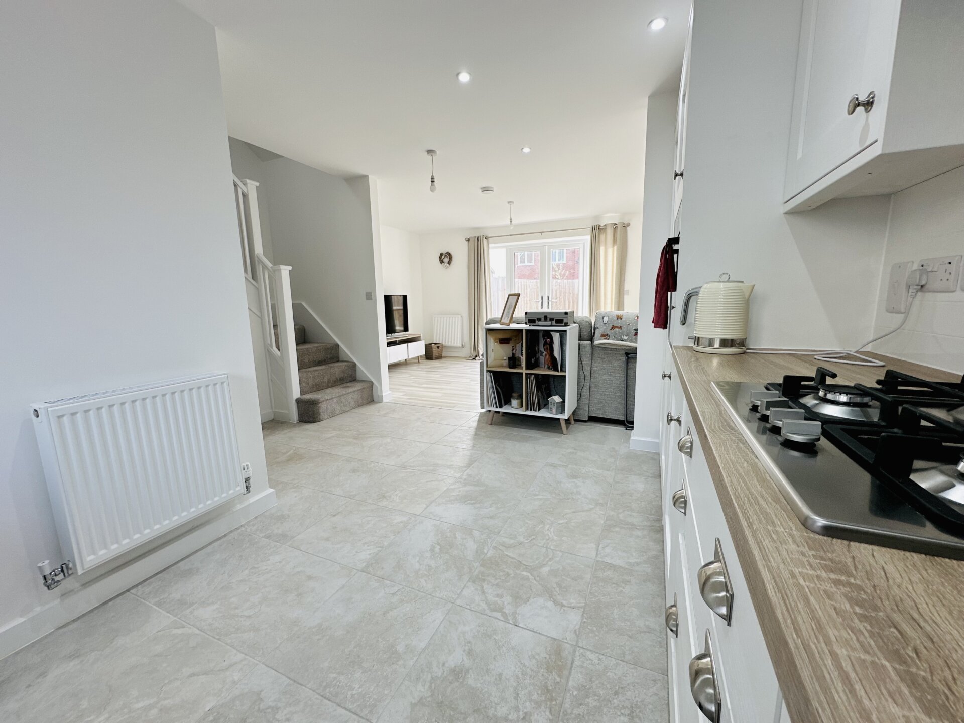 Upon entering the property the entrance hallway gives access to the downstairs wc and accommodation. The open plan living has a light and airy feel with a sleek kitchen with a range of eye and base level units with working surfaces above; built in oven, hob, fridge/freezer, dishwasher and space for washing machine. The lounge has feature French doors onto the garden ideal for summer entertaining.