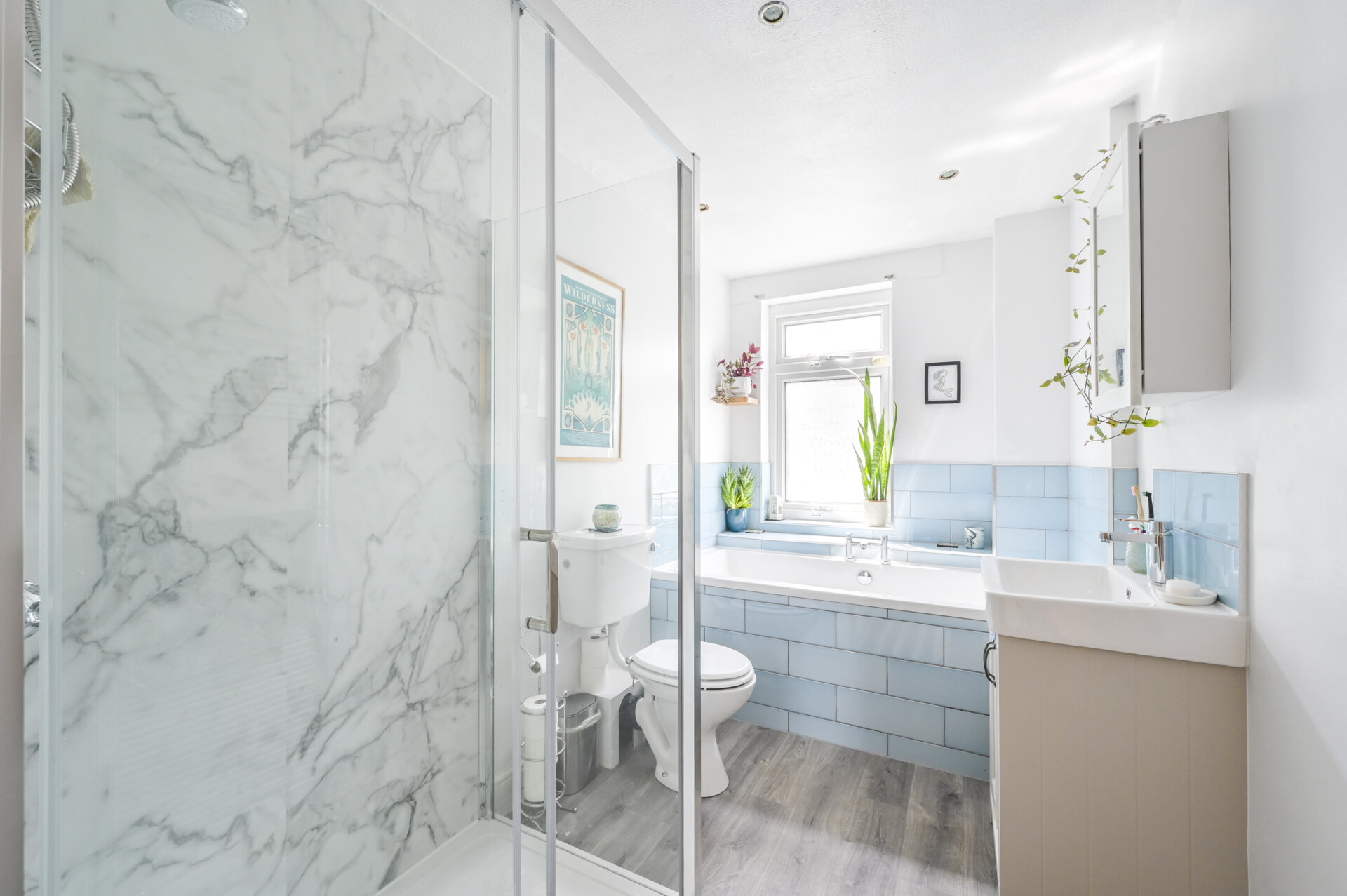 The family bathroom, situated at the rear of the first floor, is beautifully designed, combining modern fittings with a classic aesthetic. This gorgeous bathroom provides a relaxing environment.