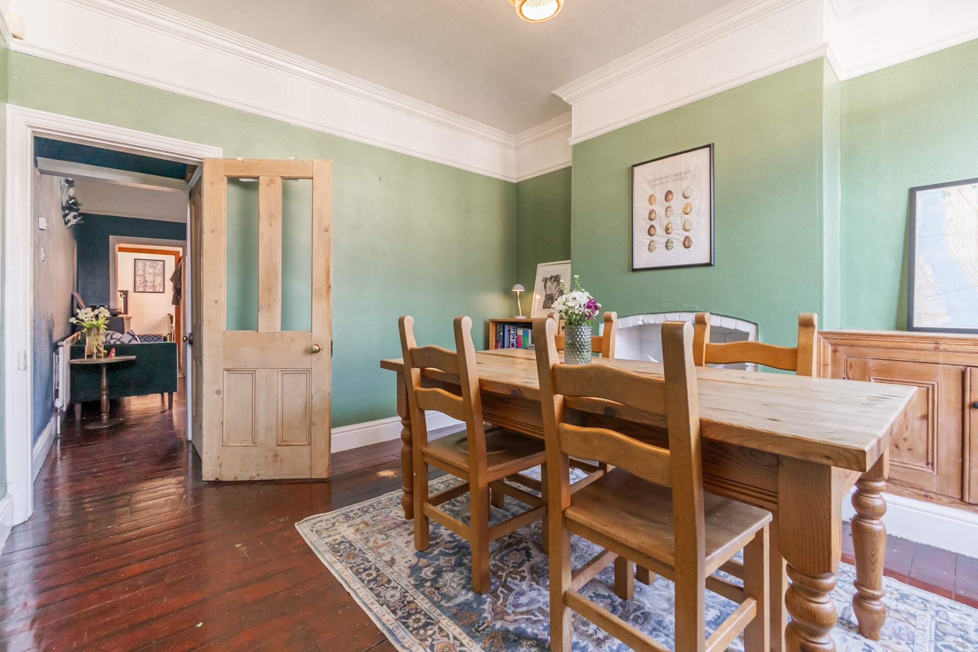 Step straight into the first reception room, currently utilised as the dining room, where a bay window draws in soft natural light, creating a space that feels both relaxed and quietly refined. Beyond, the second reception room, sitting at the heart of the home. Overlooking the rear garden, it’s a more social setting, equally suited to long, unhurried gatherings. Both rooms offering original features, with the wood flooring being one of them. A continuous theme throughout.