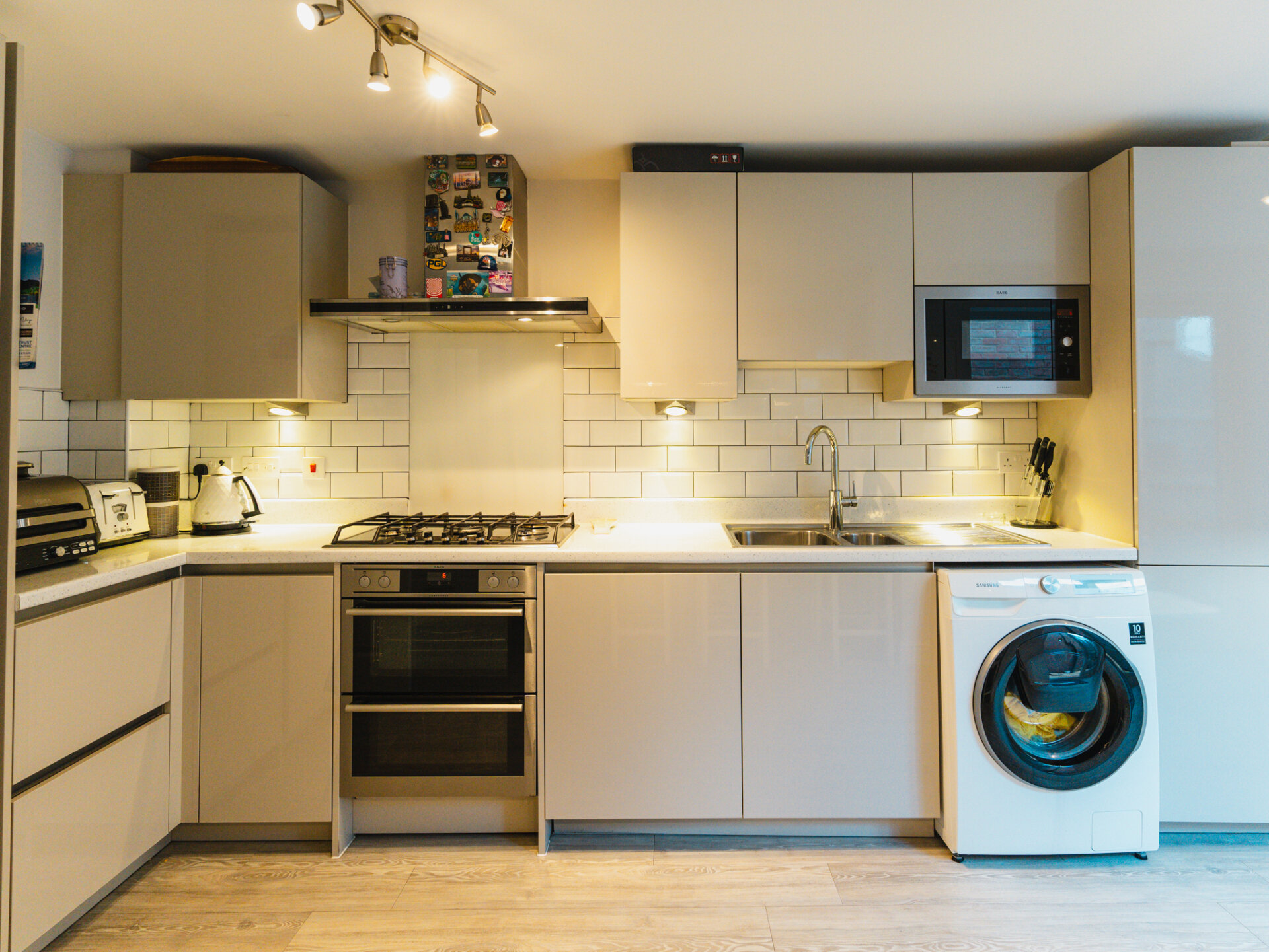 The kitchen area offers abundant storage, integrated AEG appliances, and generous work surfaces for preparing your culinary creations. With its triple-aspect windows and French doors, natural light floods the space during the day, enhancing its inviting ambiance. Additionally, you'll appreciate the convenience of a guest cloakroom and a pantry cupboard.
