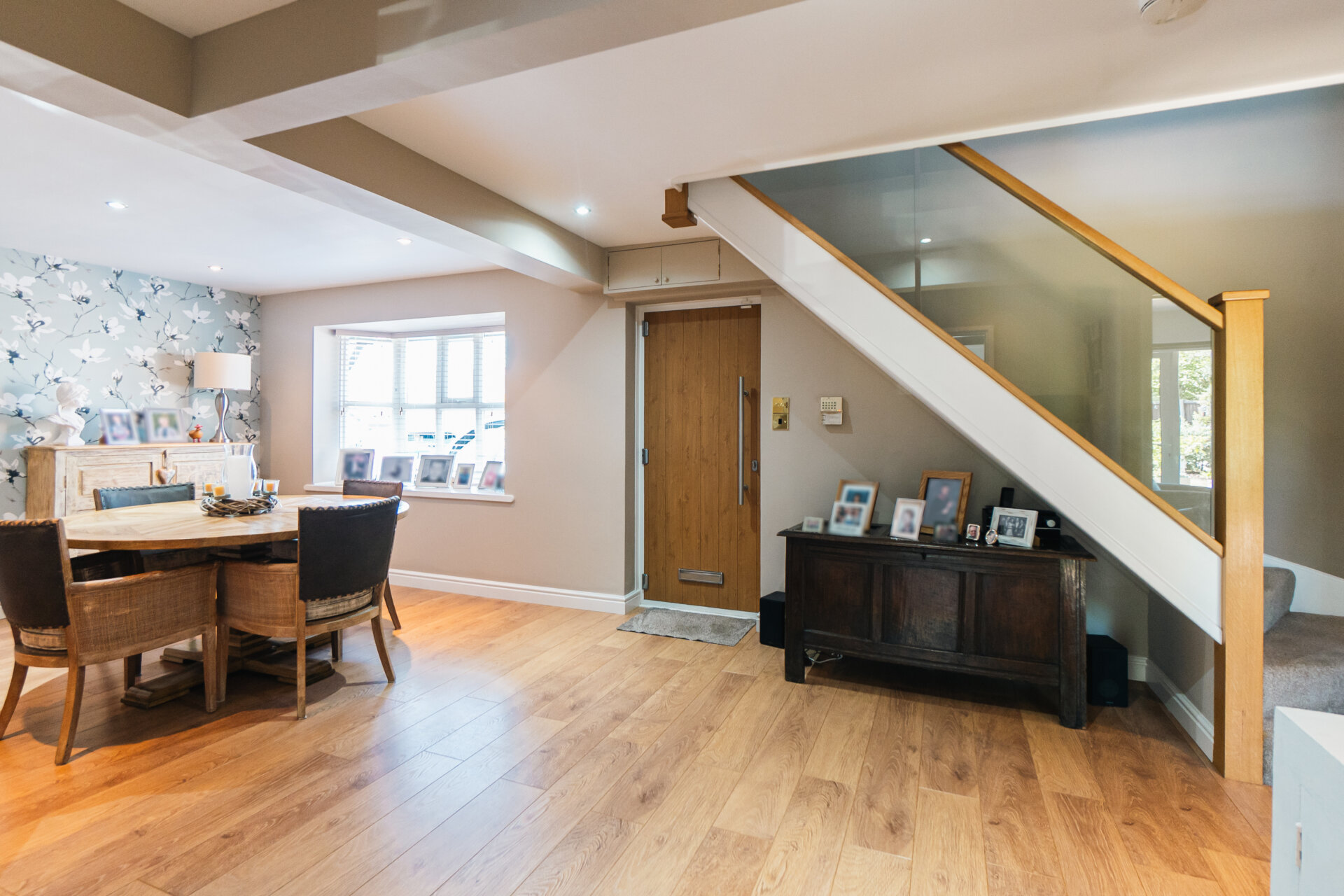 On entry, the sense of scale is immediate. A light-filled entrance dining hall sets the tone, its generous proportions inviting both quiet mornings and gatherings. From here, each of the ground-floor rooms unfold. The living area, a calm, expansive room with ample space for seating and a seamless connection to the rear garden via double doors.