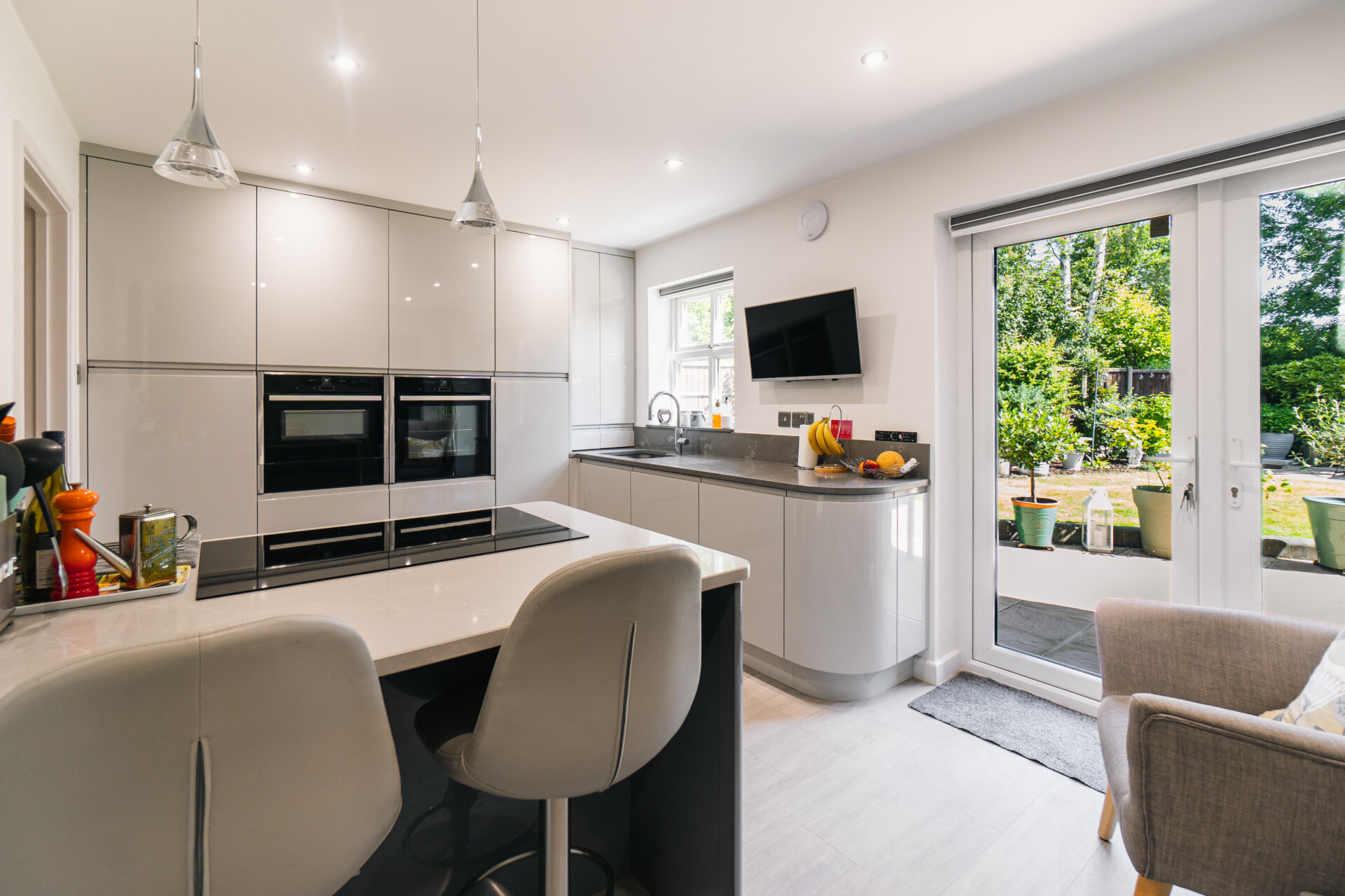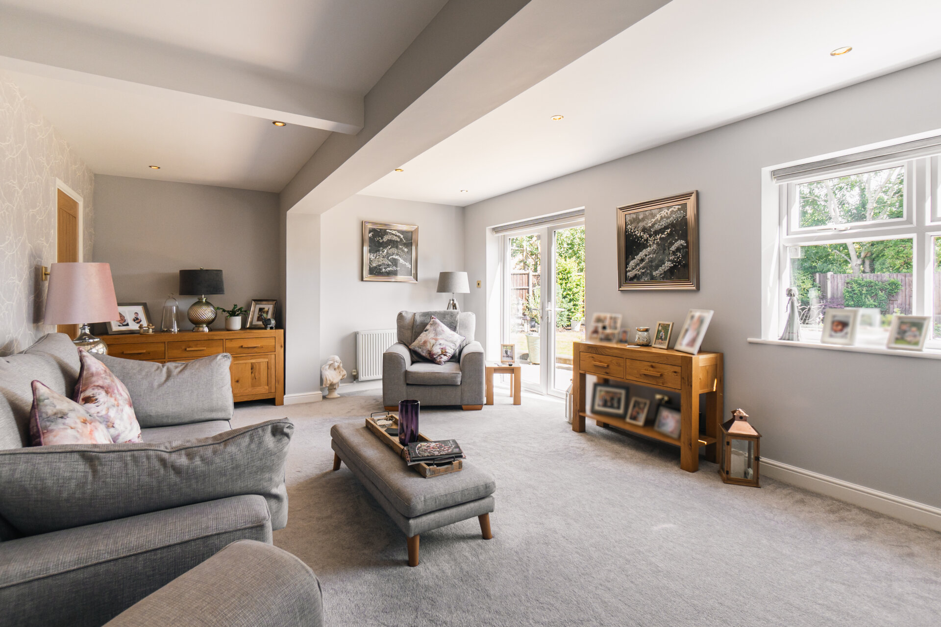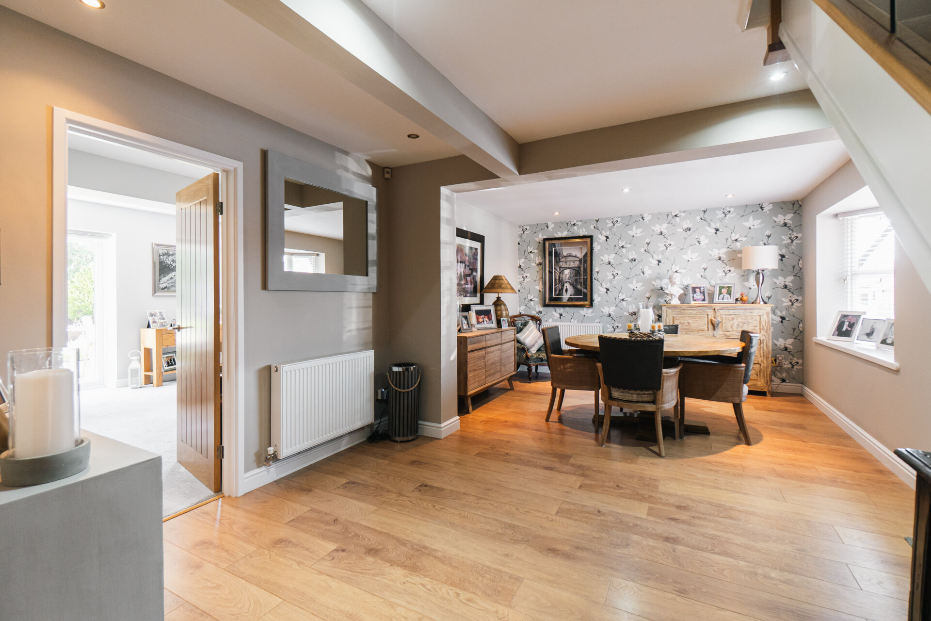 To the left, the kitchen diner becomes the focal point of daily life; a striking, contemporary space. Finished with polished worktops, a Quooker tap, and integrated appliances, the room also incorporates a seated island and a relaxed coffee nook. A utility room adds further convenience, while an integral double garage provides valuable scope for additional living space, if desired.