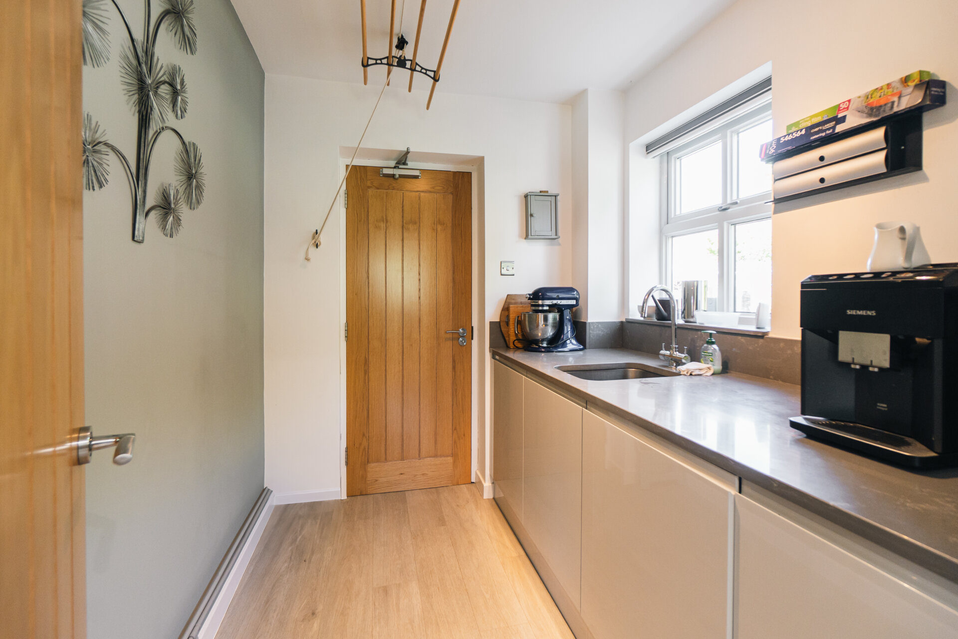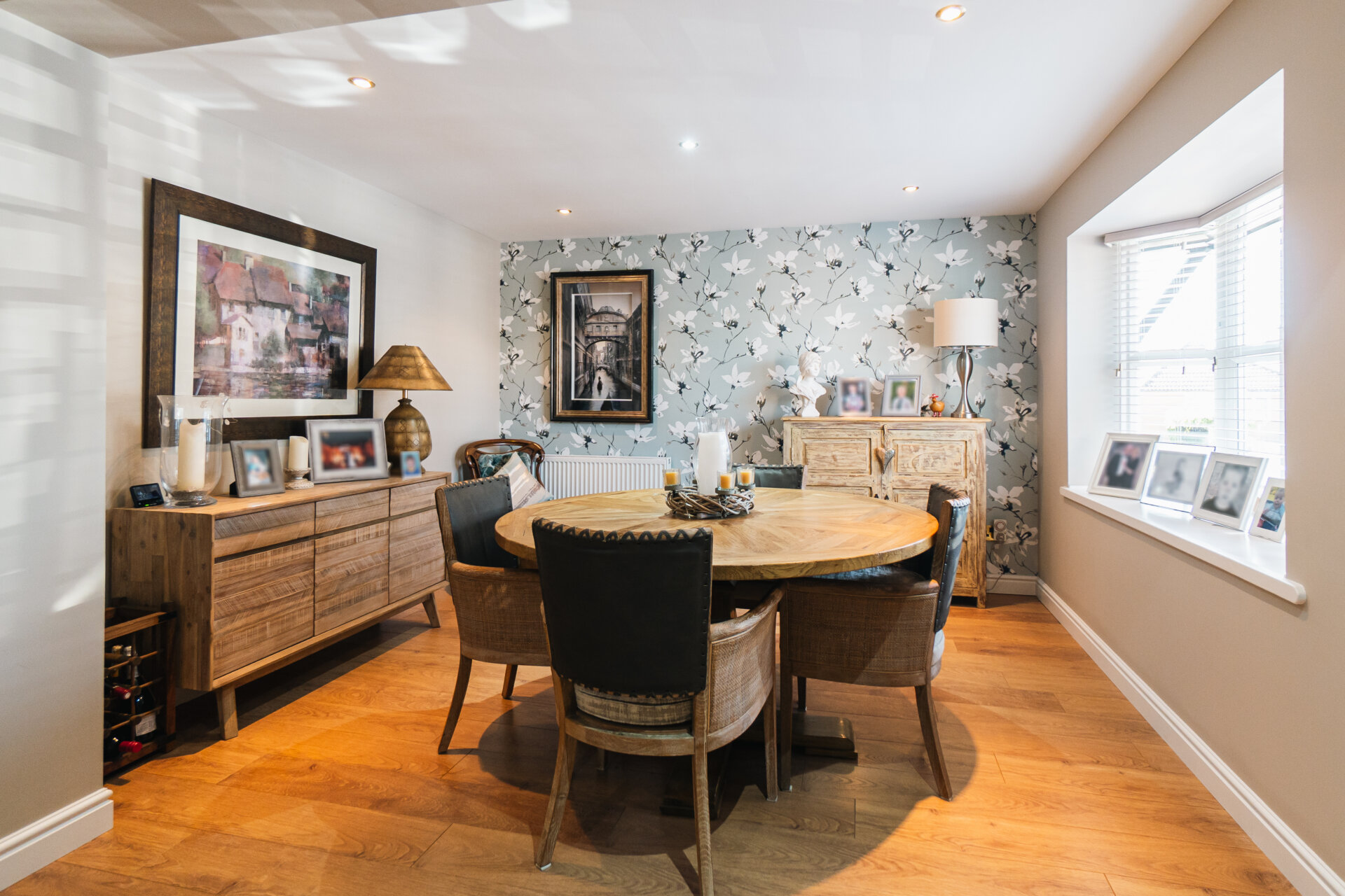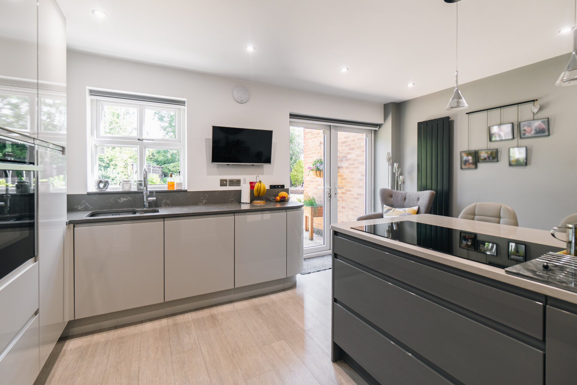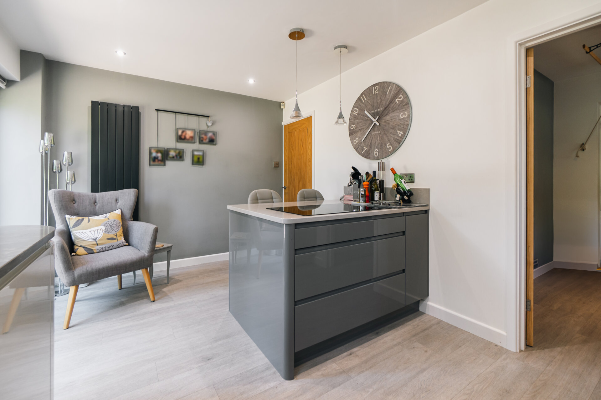 To the left, the kitchen diner becomes the focal point of daily life; a striking, contemporary space. Finished with polished worktops, a Quooker tap, and integrated appliances, the room also incorporates a seated island and a relaxed coffee nook. A utility room adds further convenience, while an integral double garage provides valuable scope for additional living space, if desired.