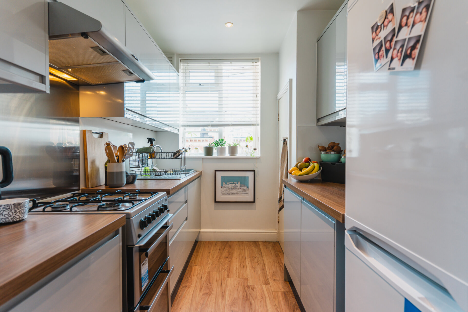 Internally, the apartment opens to a generous entrance hallway with integrated floor-to-ceiling storage. The main living and dining space is light-filled, centred around a broad bay window and a decorative hearth serving as an excellent focal feature. A private balcony extends from this space, with views over the impeccably well landscaped communal gardens. The kitchen is arranged separately, fitted with a full suite of cabinetry and appliances, including a gas hob, electric oven, plumbing for a washing machine, and space for a freestanding fridge-freezer.