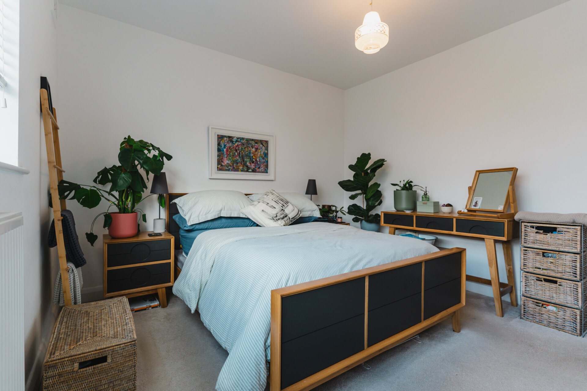 Both double bedrooms are well-proportioned with views over the front or rear gardens. The principal is especially bright, while the second bedroom features extensive fitted storage and is currently arranged as a home office, ideal for remote working. A modern three-piece bathroom sits adjacent, with full-sized bath, overhead shower, chrome towel rail and tiled detailing.