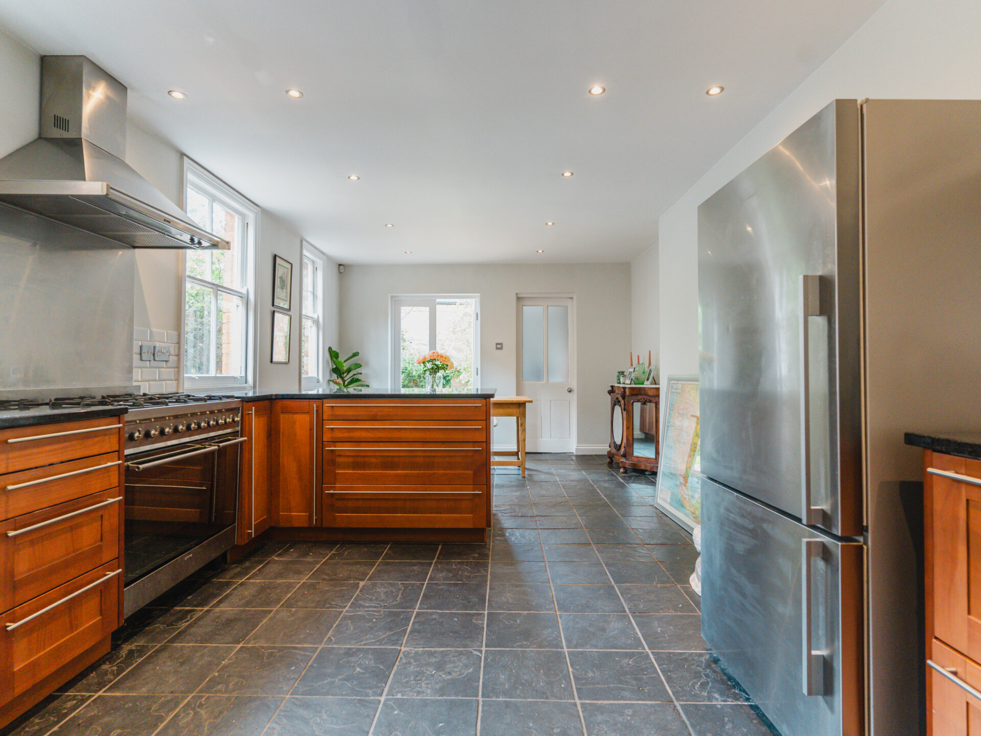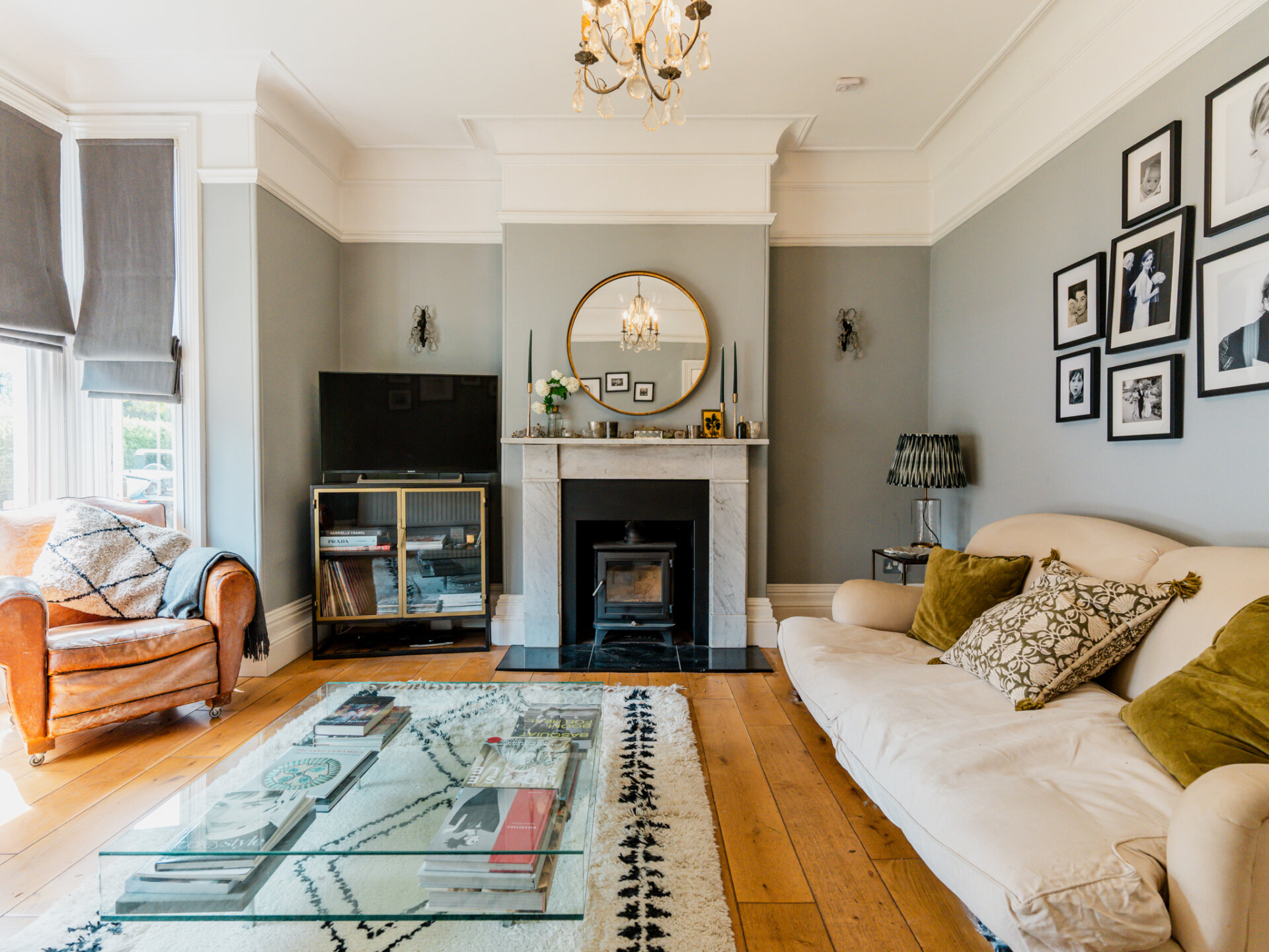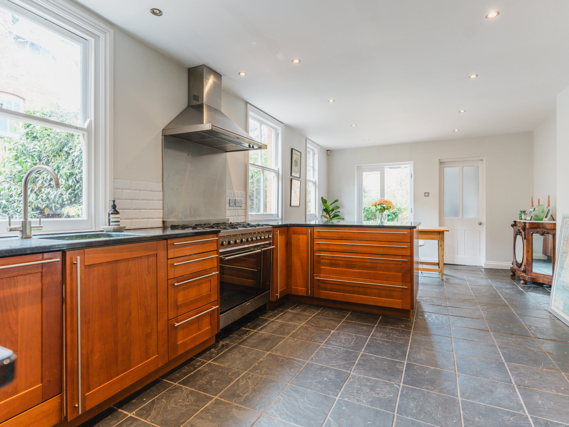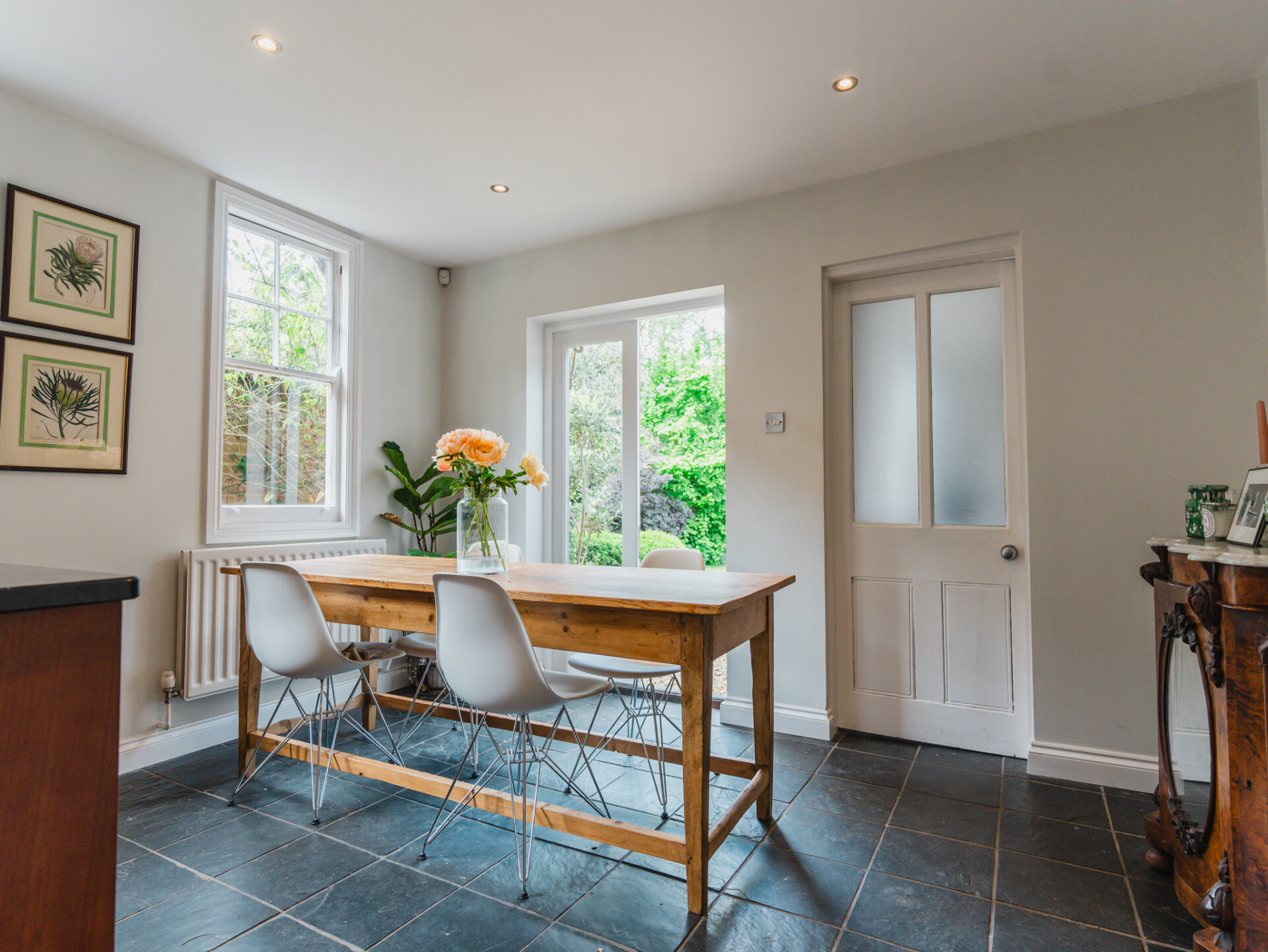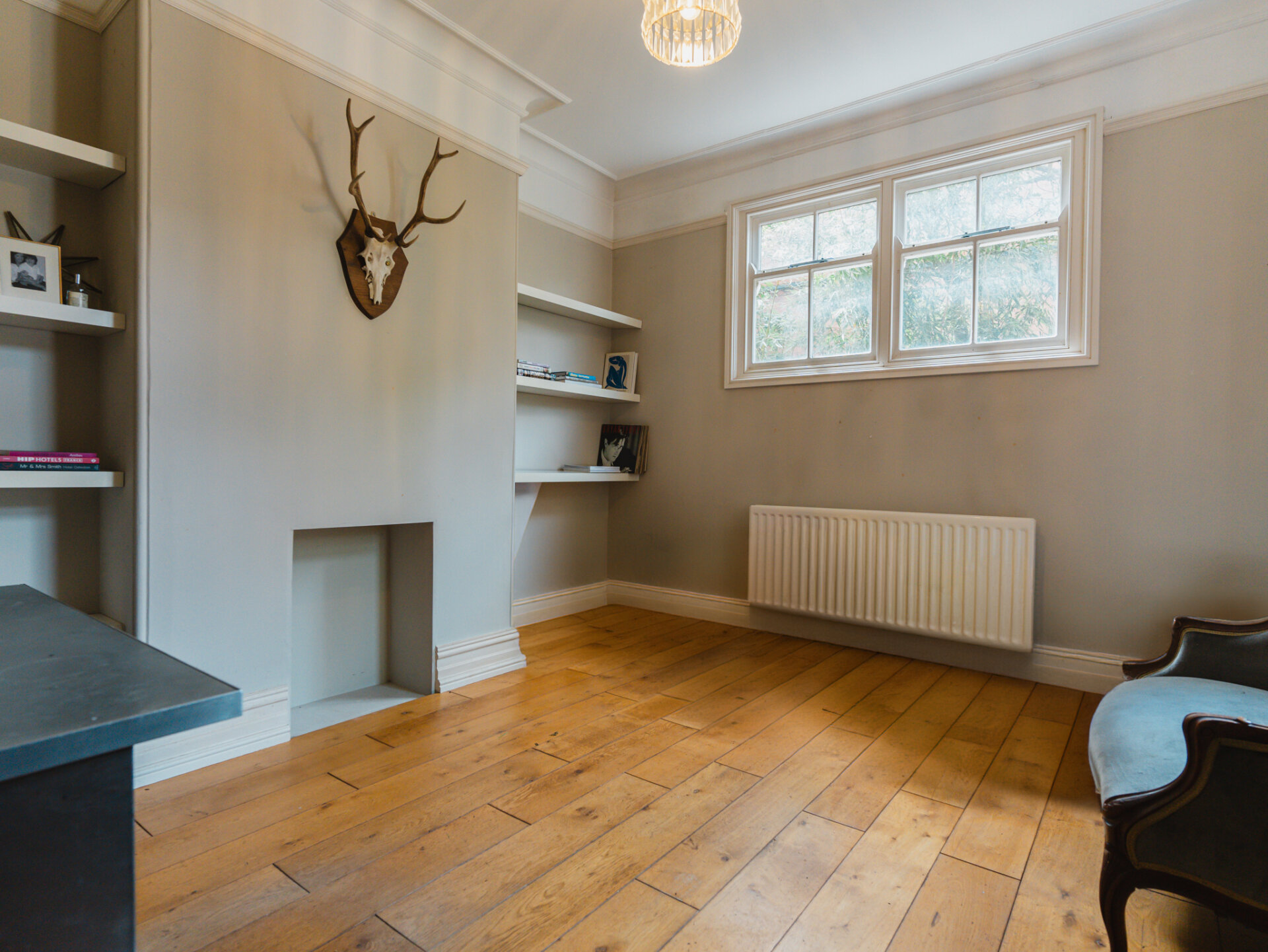 Set back from the road and boasting immediate kerb appeal, entry is approached through an original door with leaded stained-glass inserts, opening to a wide entrance hall complete with original Minton tiles, providing dual access to two reception rooms, an extended breakfast kitchen, w/c, and basement. To the front of the plan, a principal reception room with oak flooring and a newly fitted log-burner fireplace serves as an excellent focal point complete with a vintage marble-surround. Four incredible single-glazed sash windows bathe the space in natural light from the side aspect and provide a frame onto the front-garden. A second reception room is positioned centrally on the ground floor, featuring oak flooring and an original single-glazed timber-framed door providing a delightful view over the North-facing garden. To the rear of the plan, an extended breakfast-fitted kitchen, well-equipped to accommodate modern-day living, features an L-shaped breakfast island configuration with granite work surfaces and Fired Earth slate tiles. A six-ring gas-cylinder Smeg hob is centrally placed, along with integrated dishwasher, ample eye-level base units, and French timber doors providing convenient garden access. Additionally, the kitchen boasts a useful utility room at the far end, housing the washing machine and dryer. A spacious basement which requires updating throughout completes the downstairs accommodation. Following the necessary consents, the space found here could be altered to add further living accommodation in the form of a home-gym/cinema room.