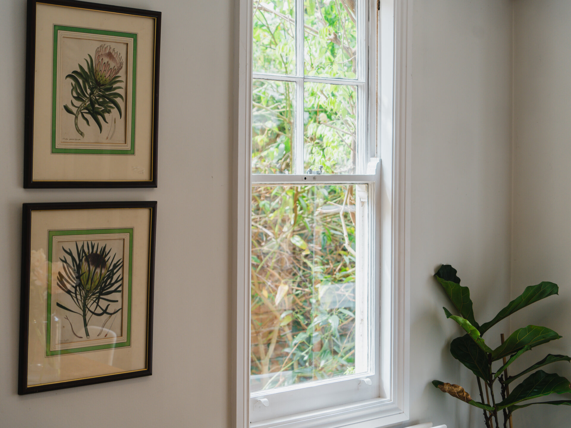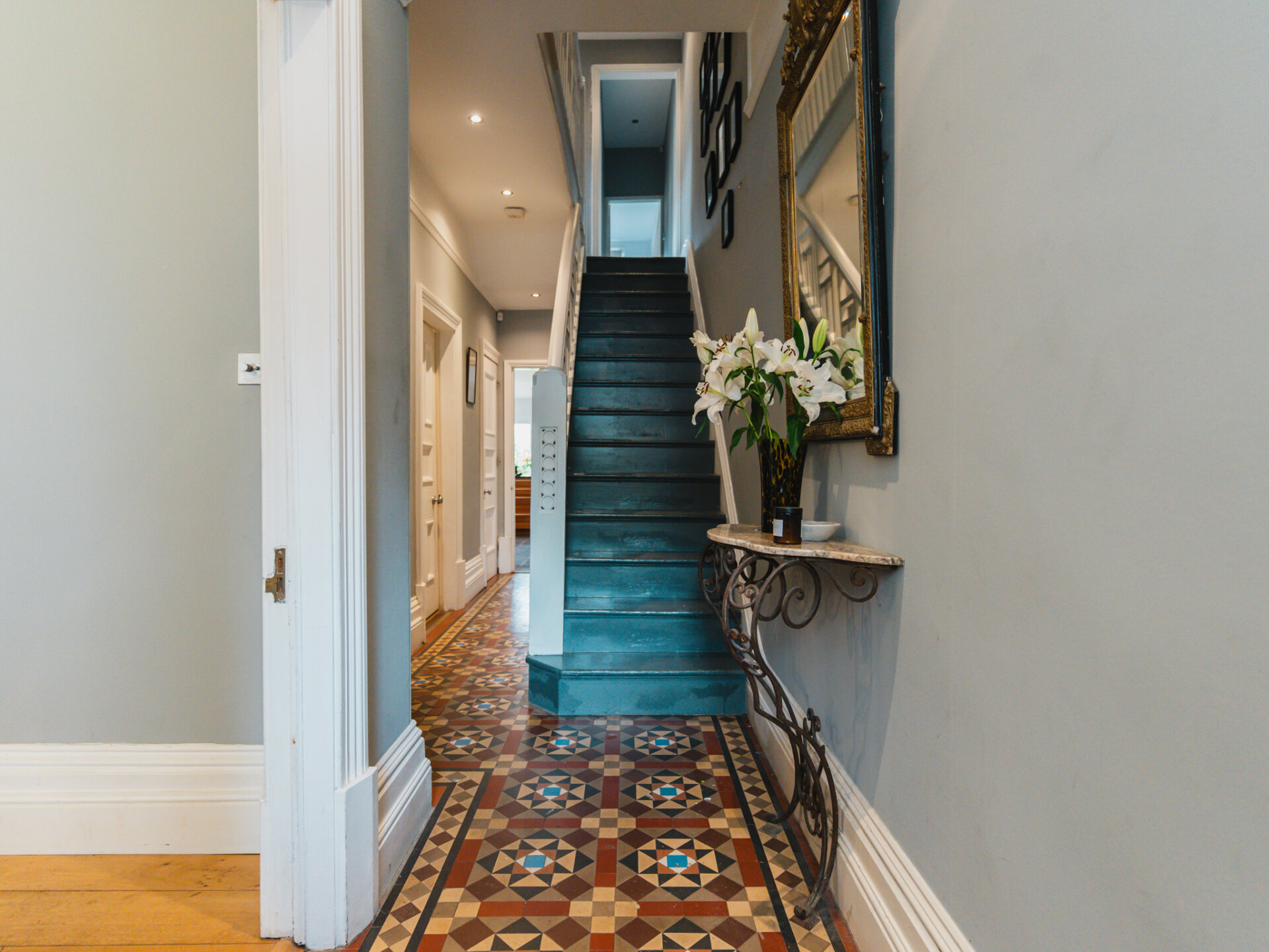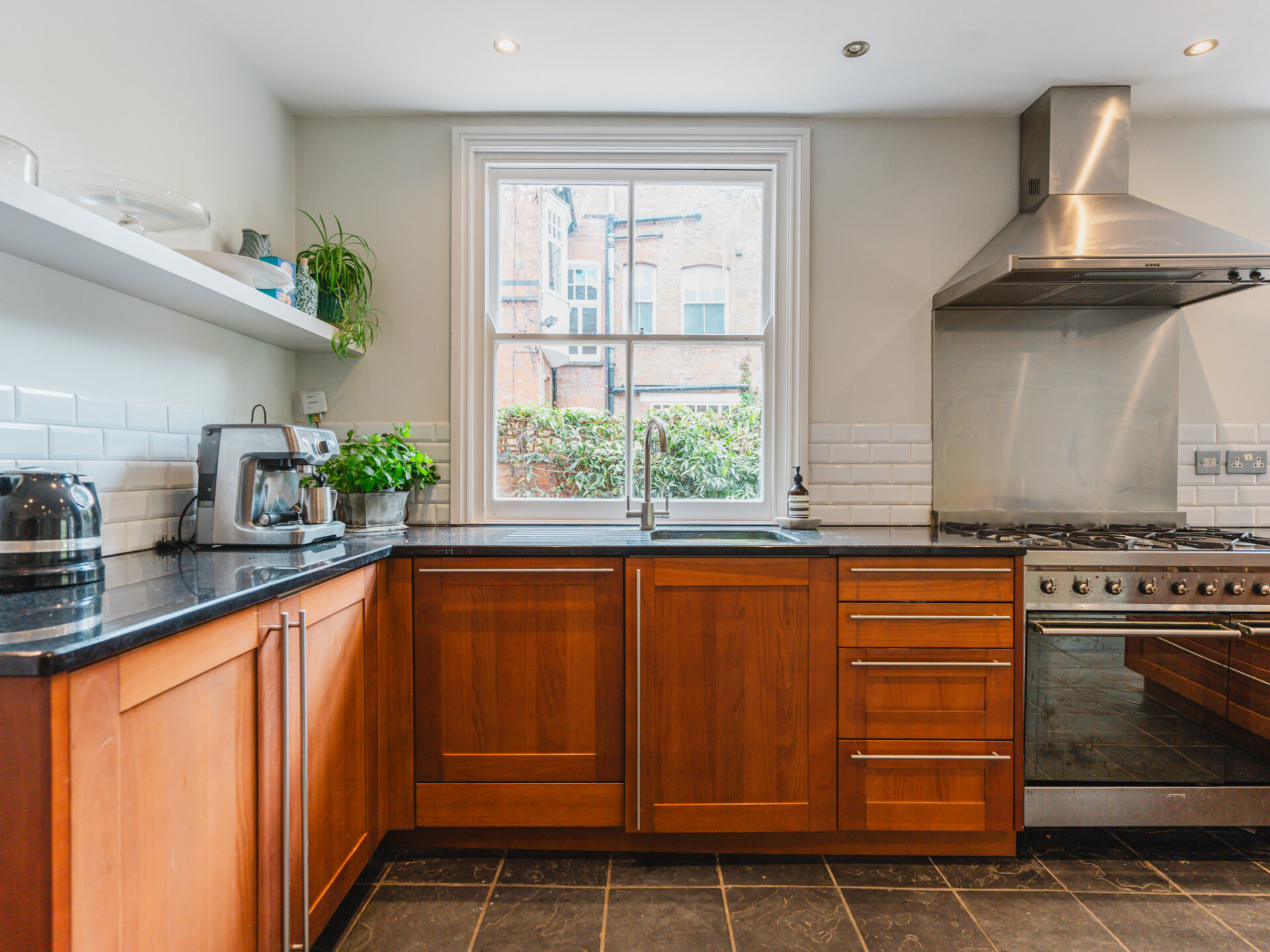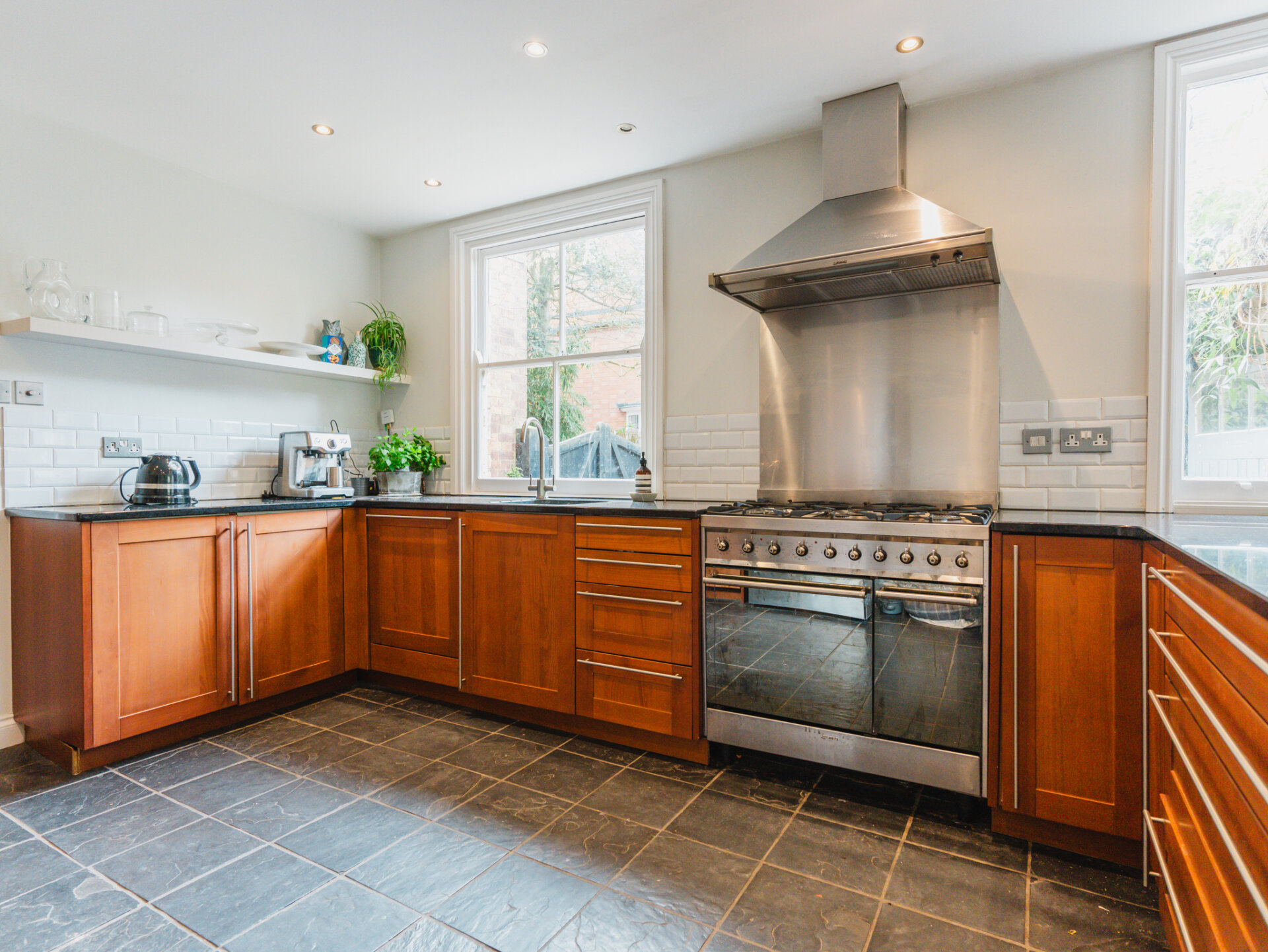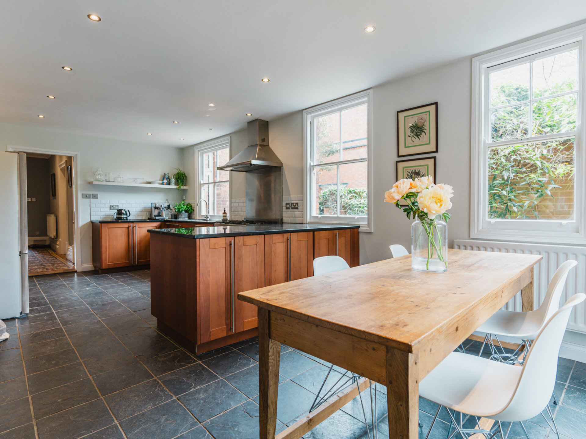 Set back from the road and boasting immediate kerb appeal, entry is approached through an original door with leaded stained-glass inserts, opening to a wide entrance hall complete with original Minton tiles, providing dual access to two reception rooms, an extended breakfast kitchen, w/c, and basement. To the front of the plan, a principal reception room with oak flooring and a newly fitted log-burner fireplace serves as an excellent focal point complete with a vintage marble-surround. Four incredible single-glazed sash windows bathe the space in natural light from the side aspect and provide a frame onto the front-garden. A second reception room is positioned centrally on the ground floor, featuring oak flooring and an original single-glazed timber-framed door providing a delightful view over the North-facing garden. To the rear of the plan, an extended breakfast-fitted kitchen, well-equipped to accommodate modern-day living, features an L-shaped breakfast island configuration with granite work surfaces and Fired Earth slate tiles. A six-ring gas-cylinder Smeg hob is centrally placed, along with integrated dishwasher, ample eye-level base units, and French timber doors providing convenient garden access. Additionally, the kitchen boasts a useful utility room at the far end, housing the washing machine and dryer. A spacious basement which requires updating throughout completes the downstairs accommodation. Following the necessary consents, the space found here could be altered to add further living accommodation in the form of a home-gym/cinema room.