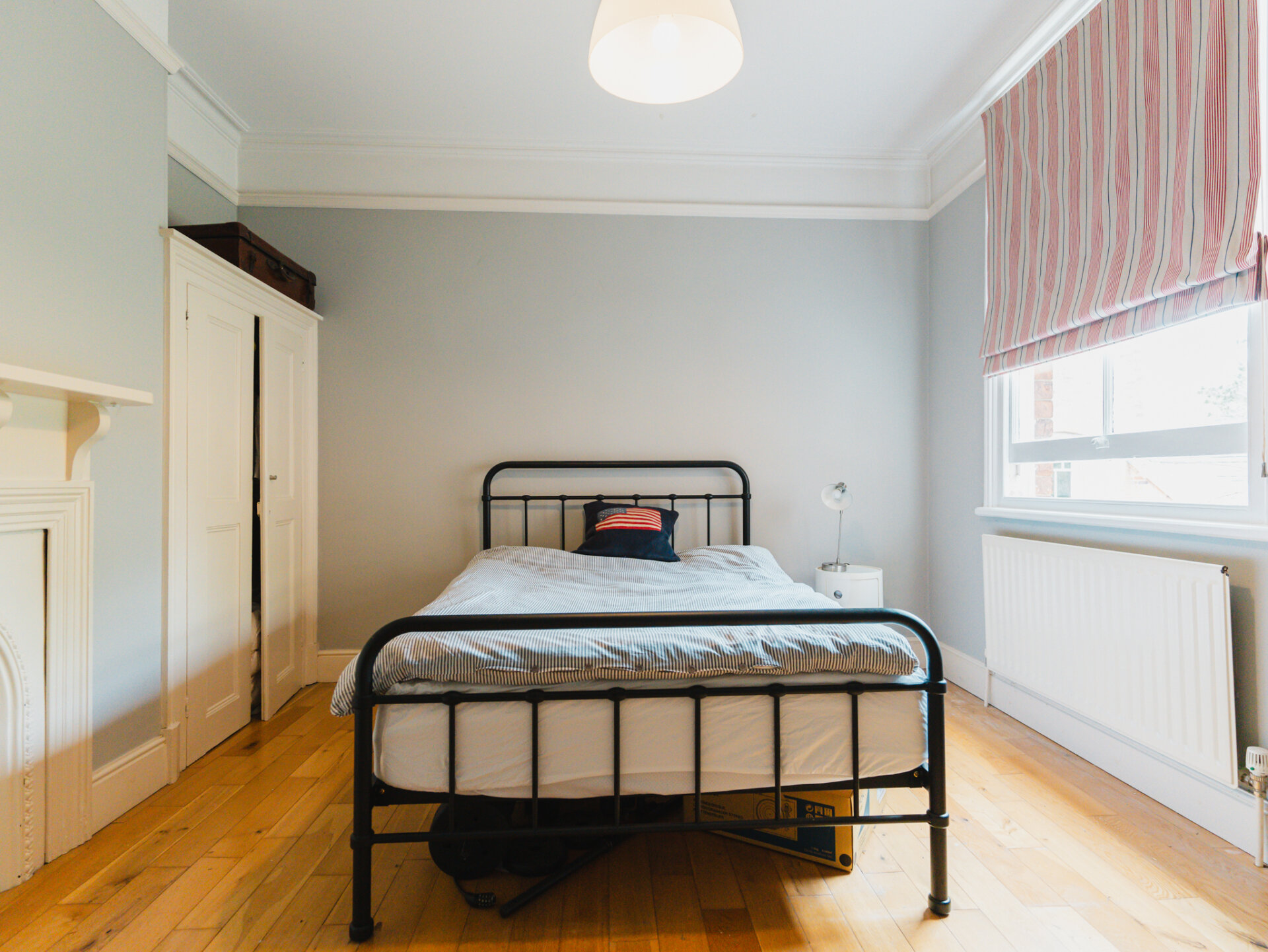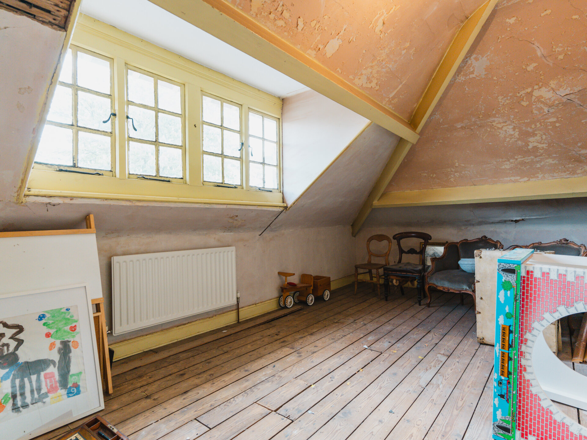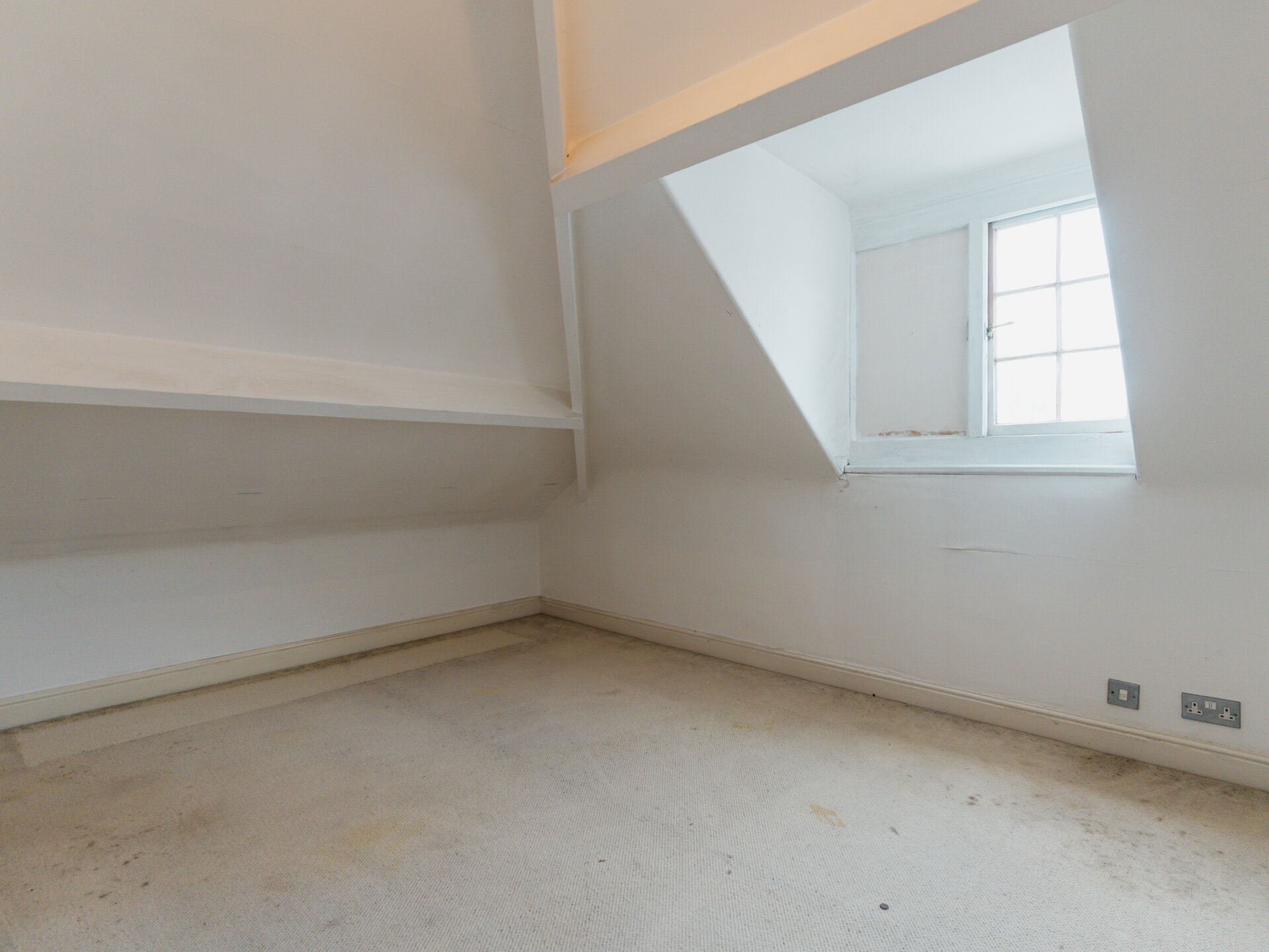 A split-tier landing opens to three double bedrooms and a three-piece family bathroom with separate w/c. The largest room is situated at the front of the first floor, offering ample width and potential for an en-suite, with two large single-glazed sash windows overlooking Knighton Drive but requires modernisation throughout. A second double bedroom is centrally located on the first floor, featuring an original feature fireplace, modern oak flooring, and views onto the rear garden. The third bedroom, found at the far end of the first floor, includes fitted wardrobes and two sets of original single-glazed sash windows. A three-piece family bathroom complete with Fired Earth-tiles, a walk-in shower and roll-top bath, along with a separate w/c, complete the first floor accommodation. A further set of stairs leads to two additional double bedrooms and a separate storage room, which could easily be reconfigured into a further bedroom or additional shower-room. All three of these rooms require renovation throughout.